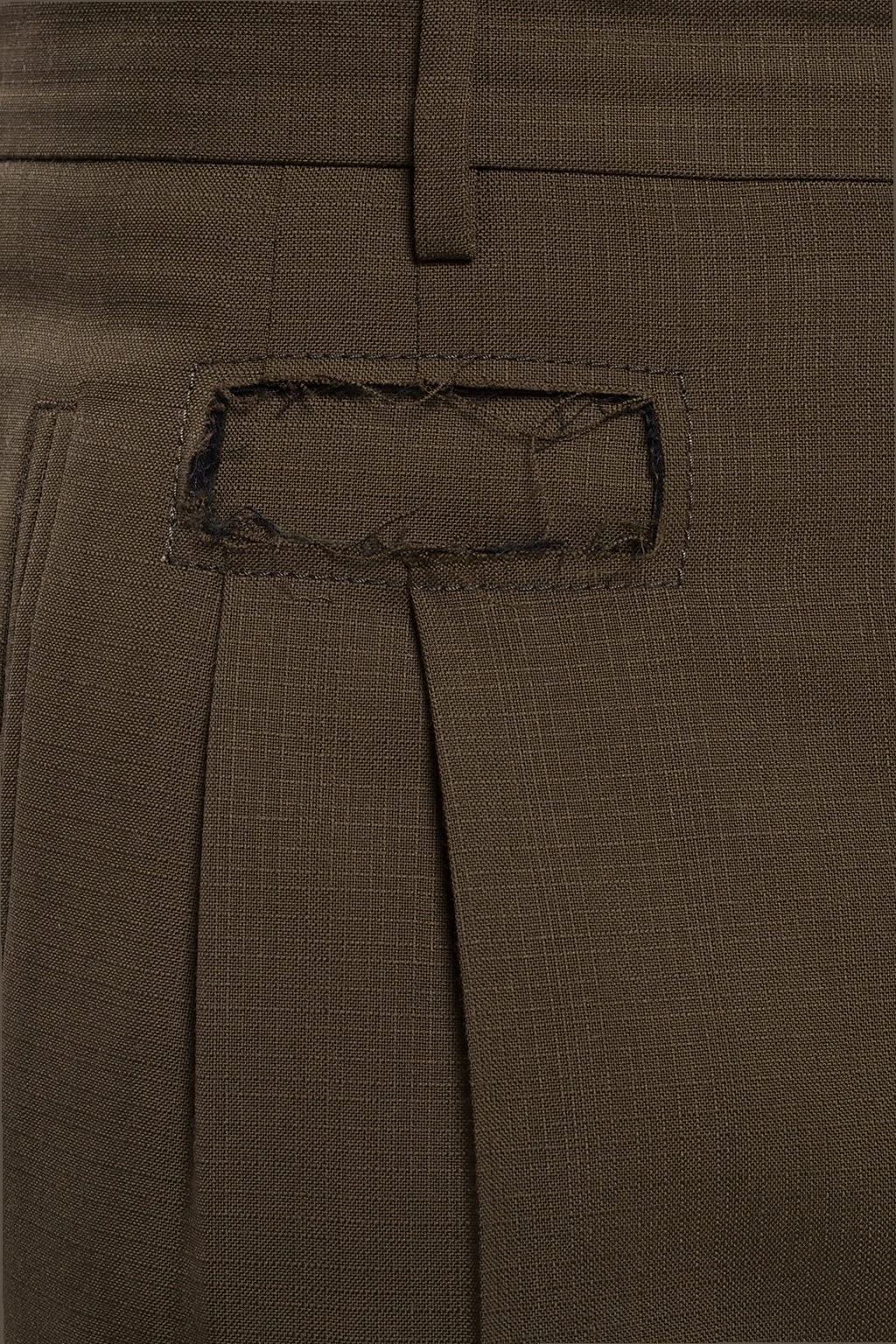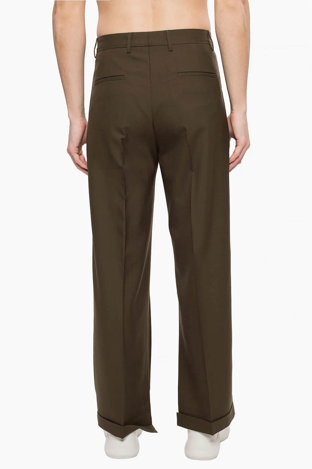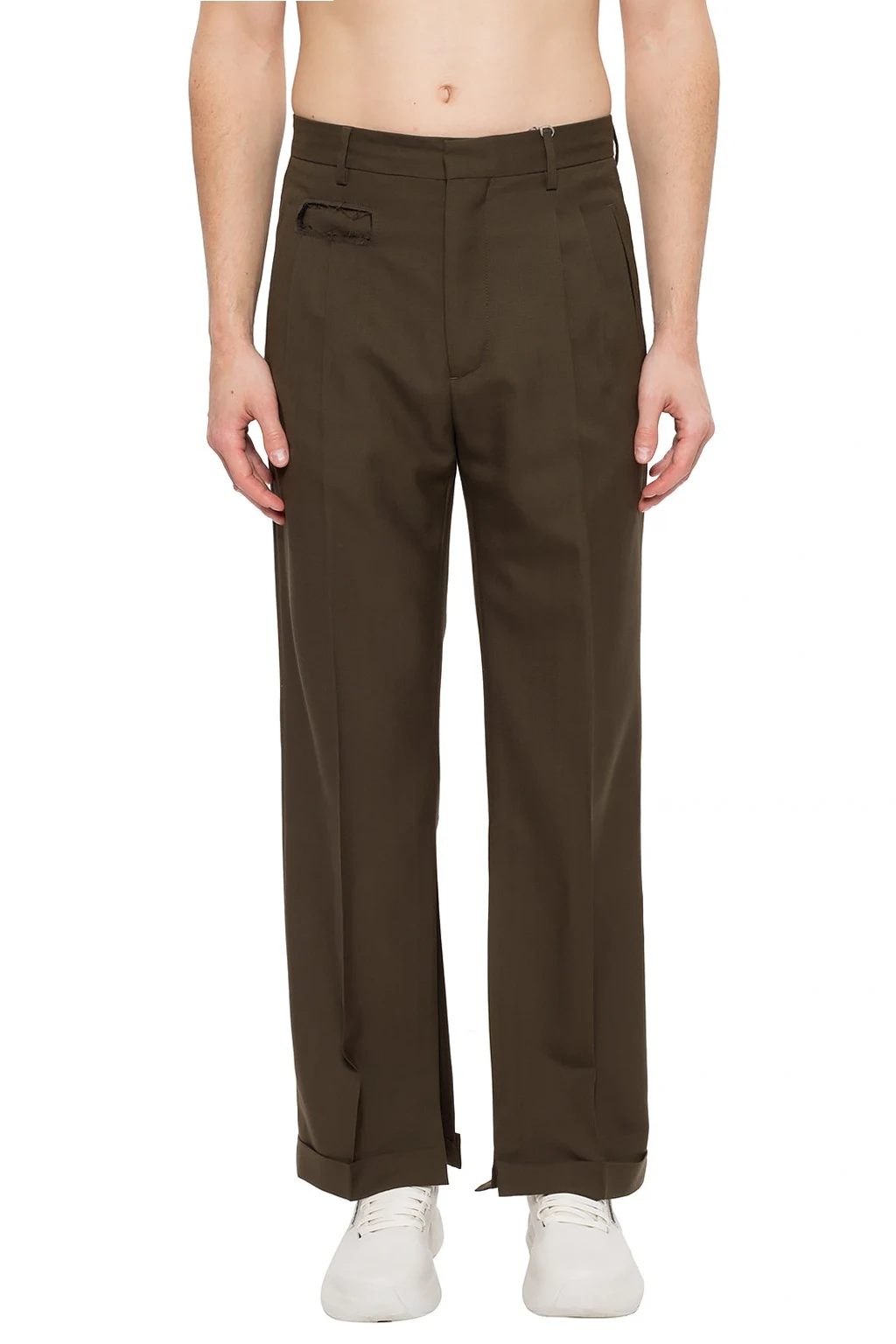 Dark green creased trousers from Marni. Made of wool. Zip and hook-and-eye fastening. Front decorated with a cut-out detail. Two slip pockets on the front, two at the back. Vents on the sides.