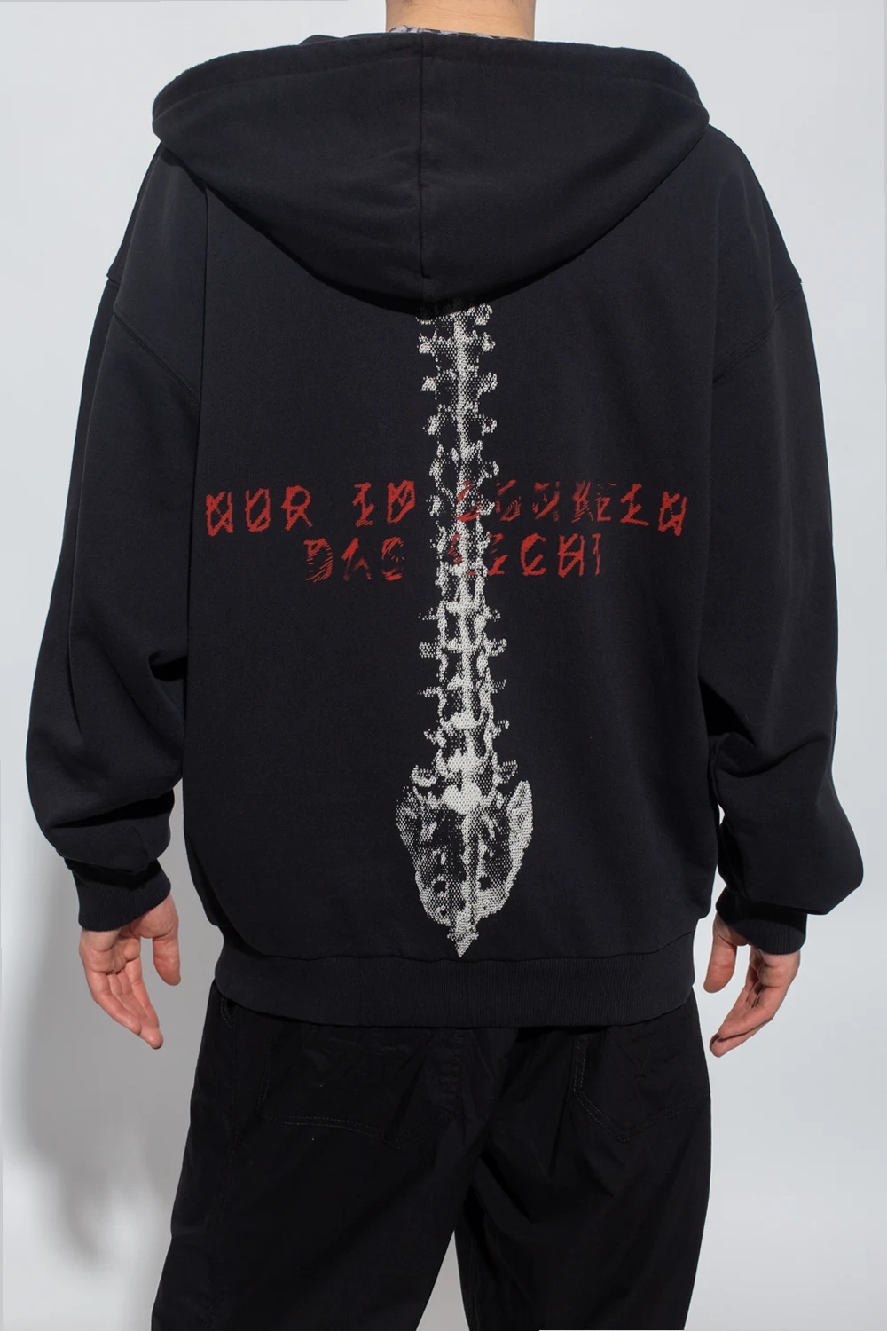 Black ‘44 Spine’ sweatshirt from 44 Label Group. Made of cotton, this garment features a zip fastening, drawstring hood, print and logo in red and cream.
