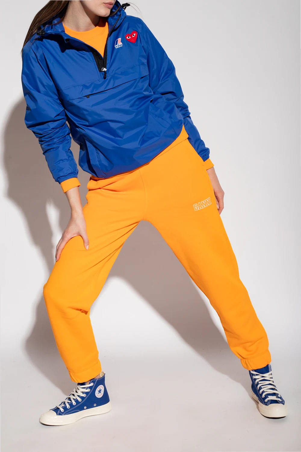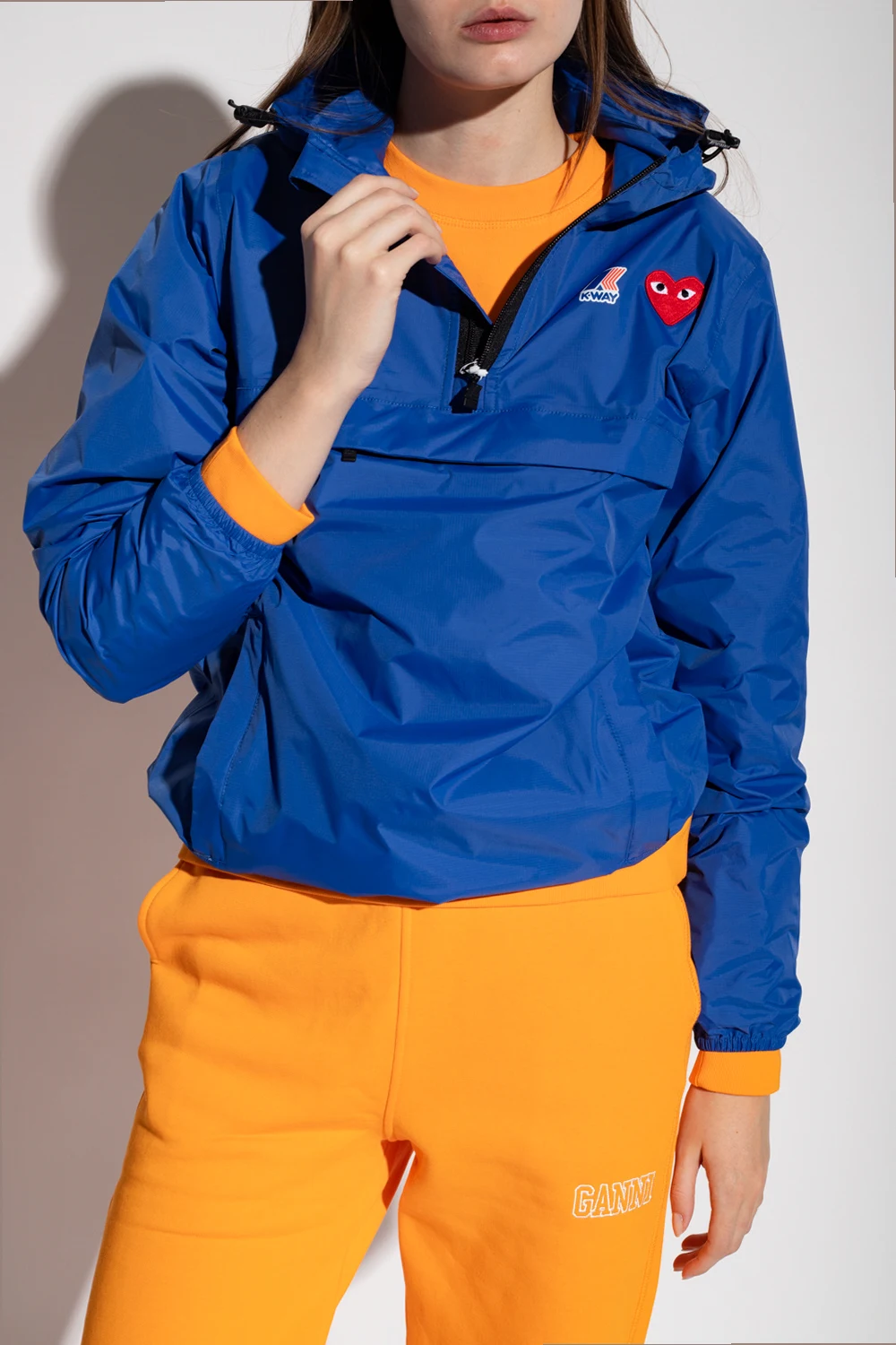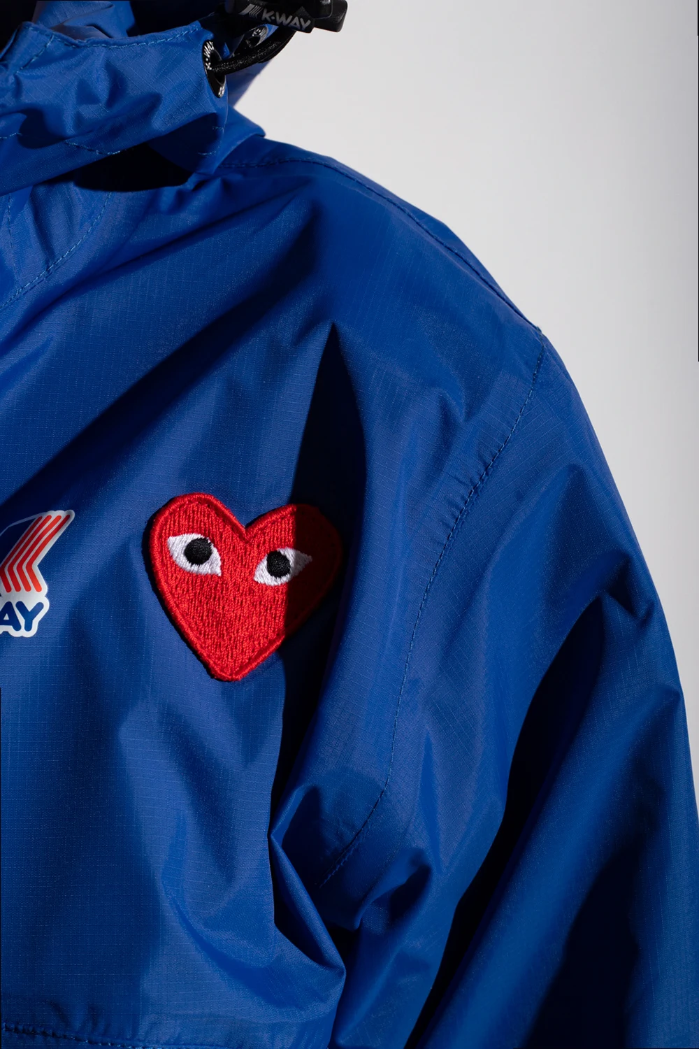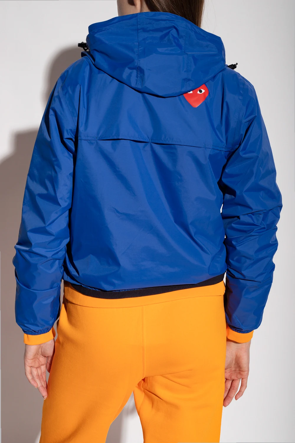 Blue and black rain jacket from Comme Des Garçons Play x K-Way. Emblazoned with a logo patch and a printed logo, this style features a zip fastening, a drawcord-adjustable hood, long sleeves and three zipped pockets on the front.