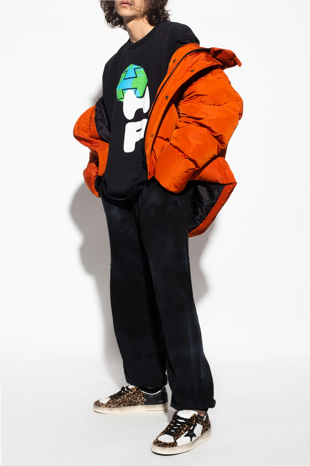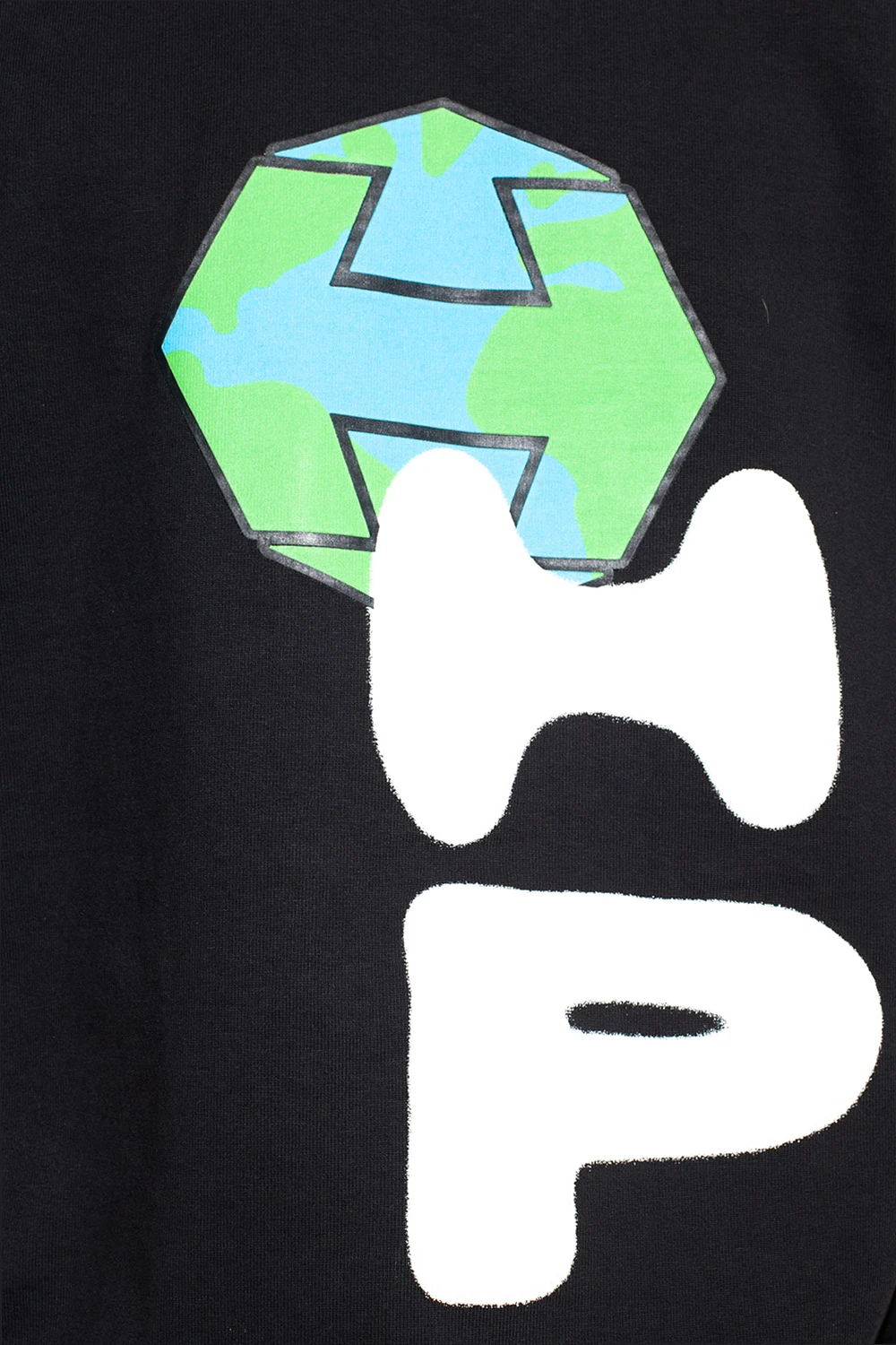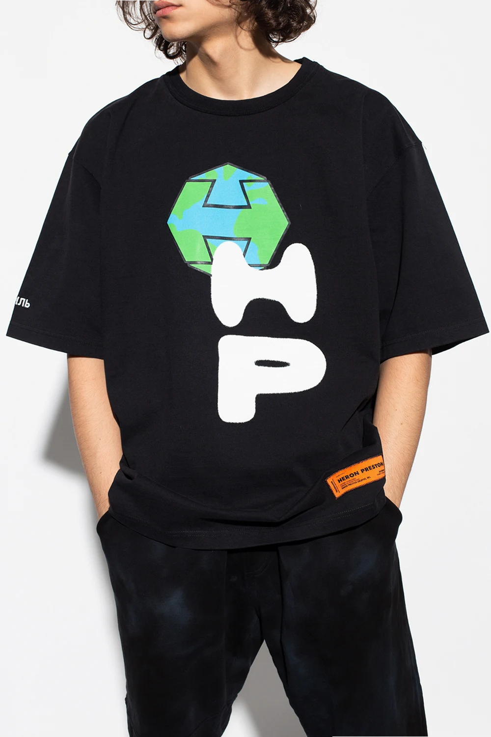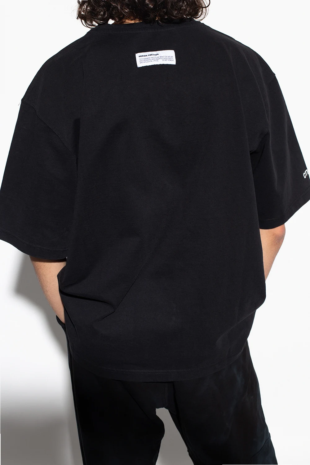 Black oversize T-shirt from Heron Preston. Made of organic cotton, this short sleeve design features a multicolored print, patches, white logo embroidery on one sleeve and a ribbed crewneck.