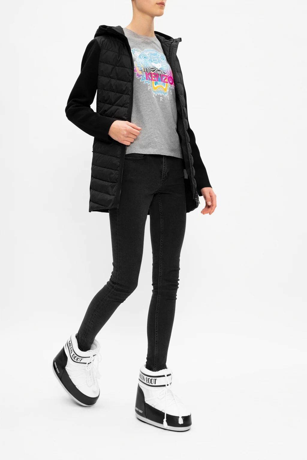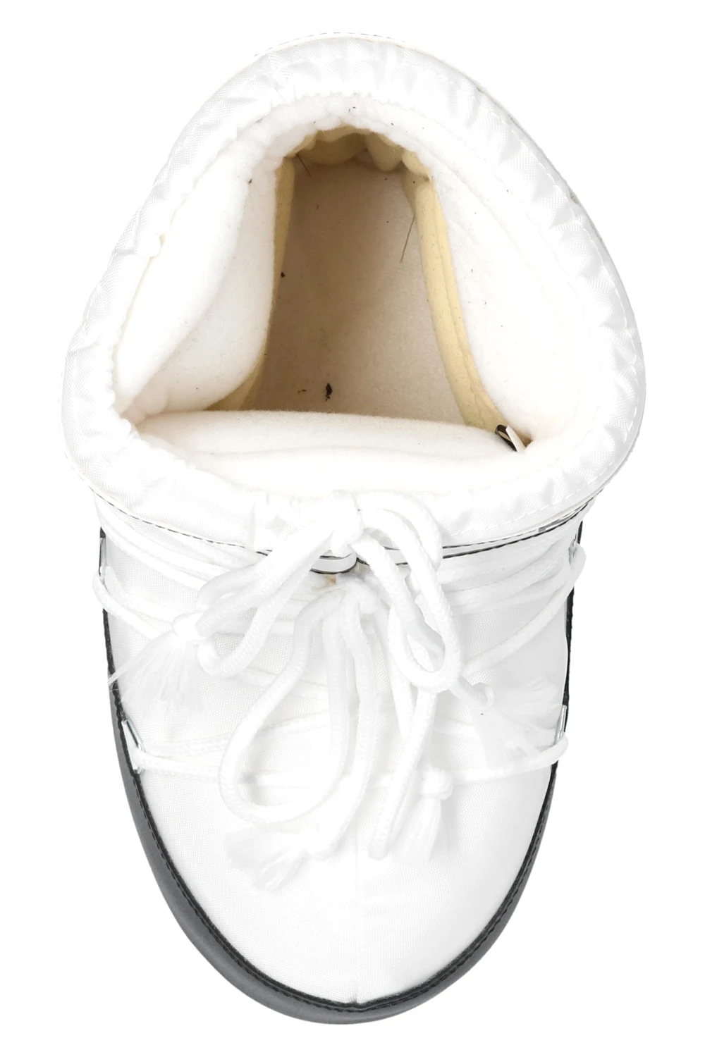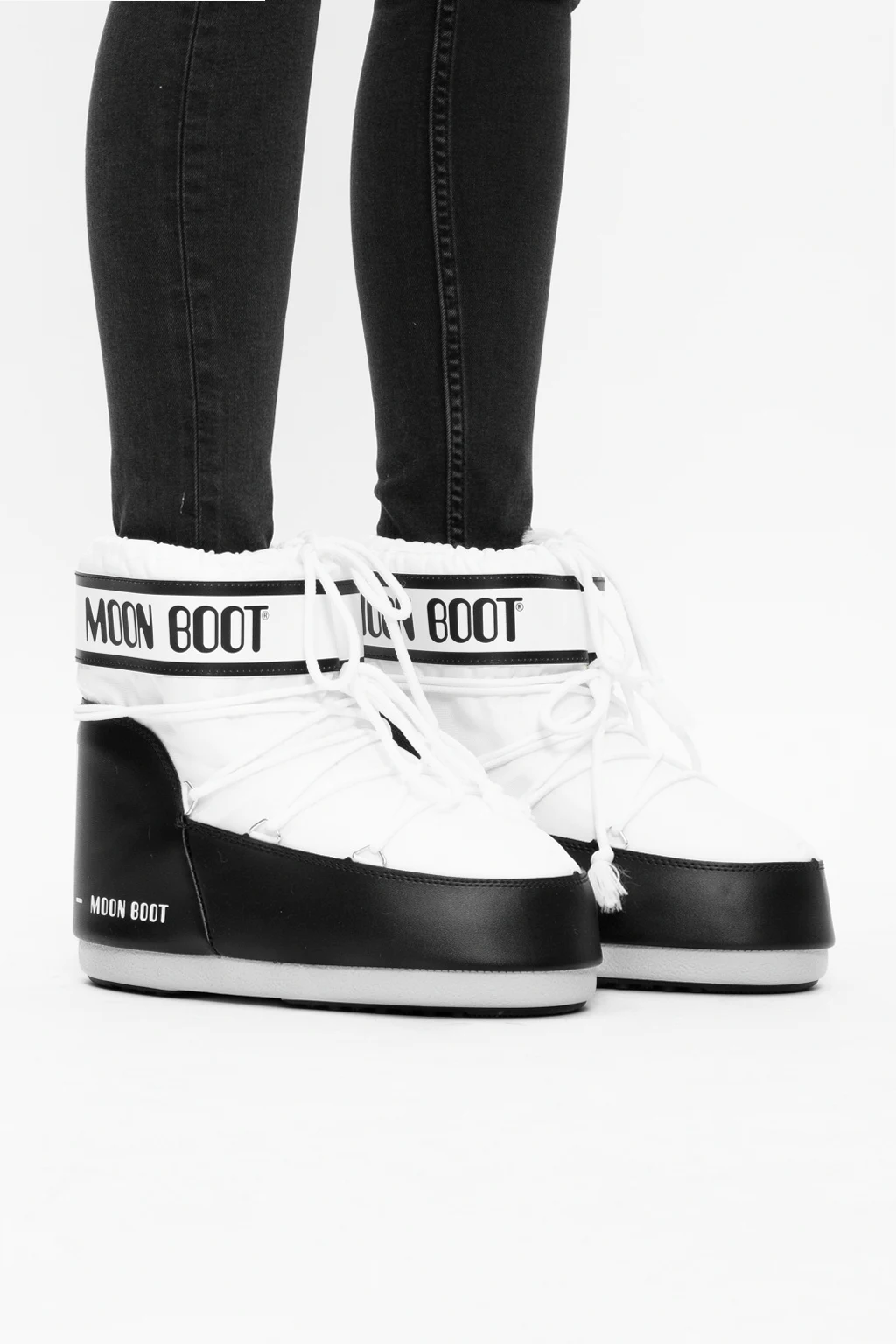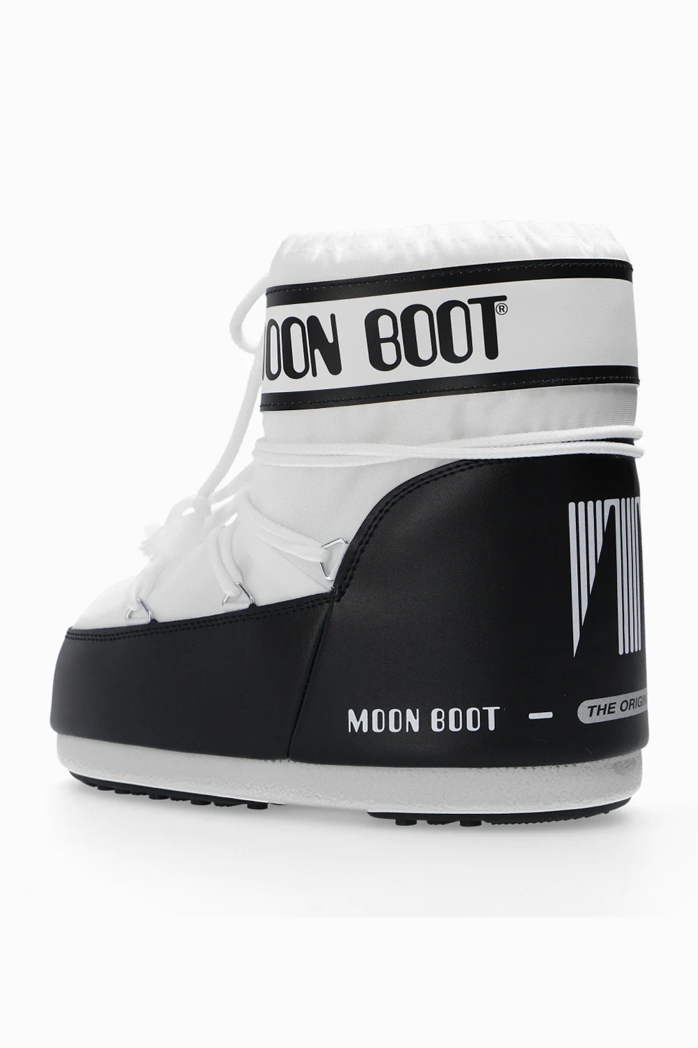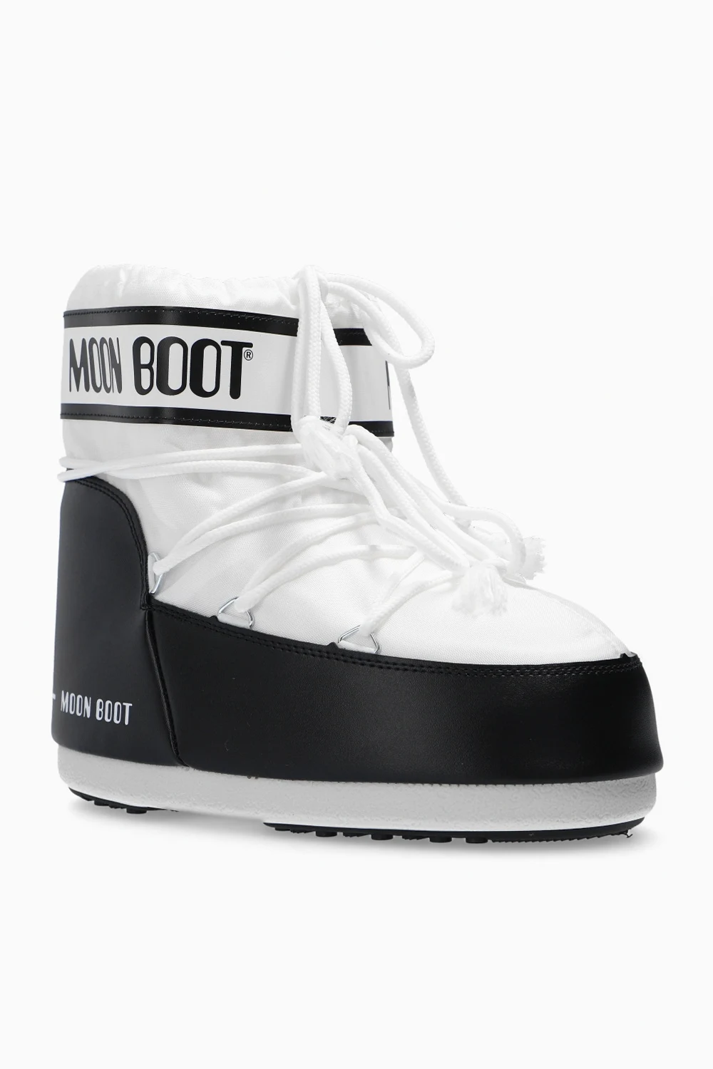 White and black ‘Classic Low 2’ snow boots from Moon Boot. This lace-up design is trimmed with faux leather and features a logo print, silver-tone metal hardware and rubber sole in white and black. Inspired by the peculiar shape and technology of the astronauts’ boots, this model was designed in 1969 after the first Moon landing.