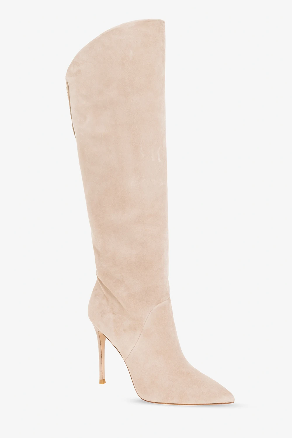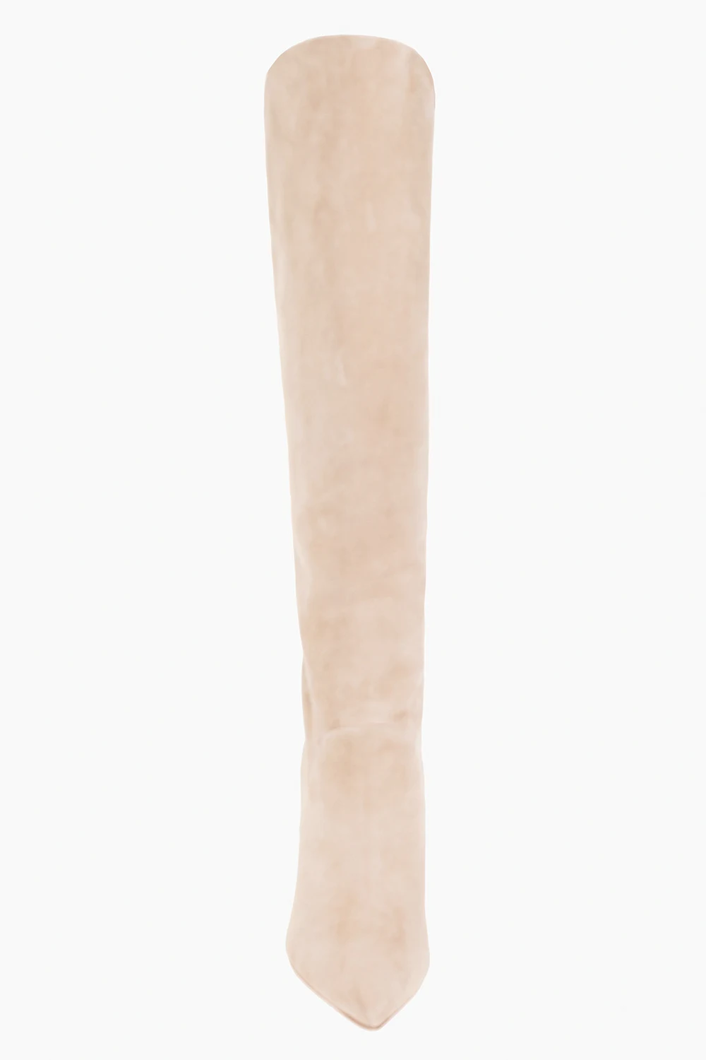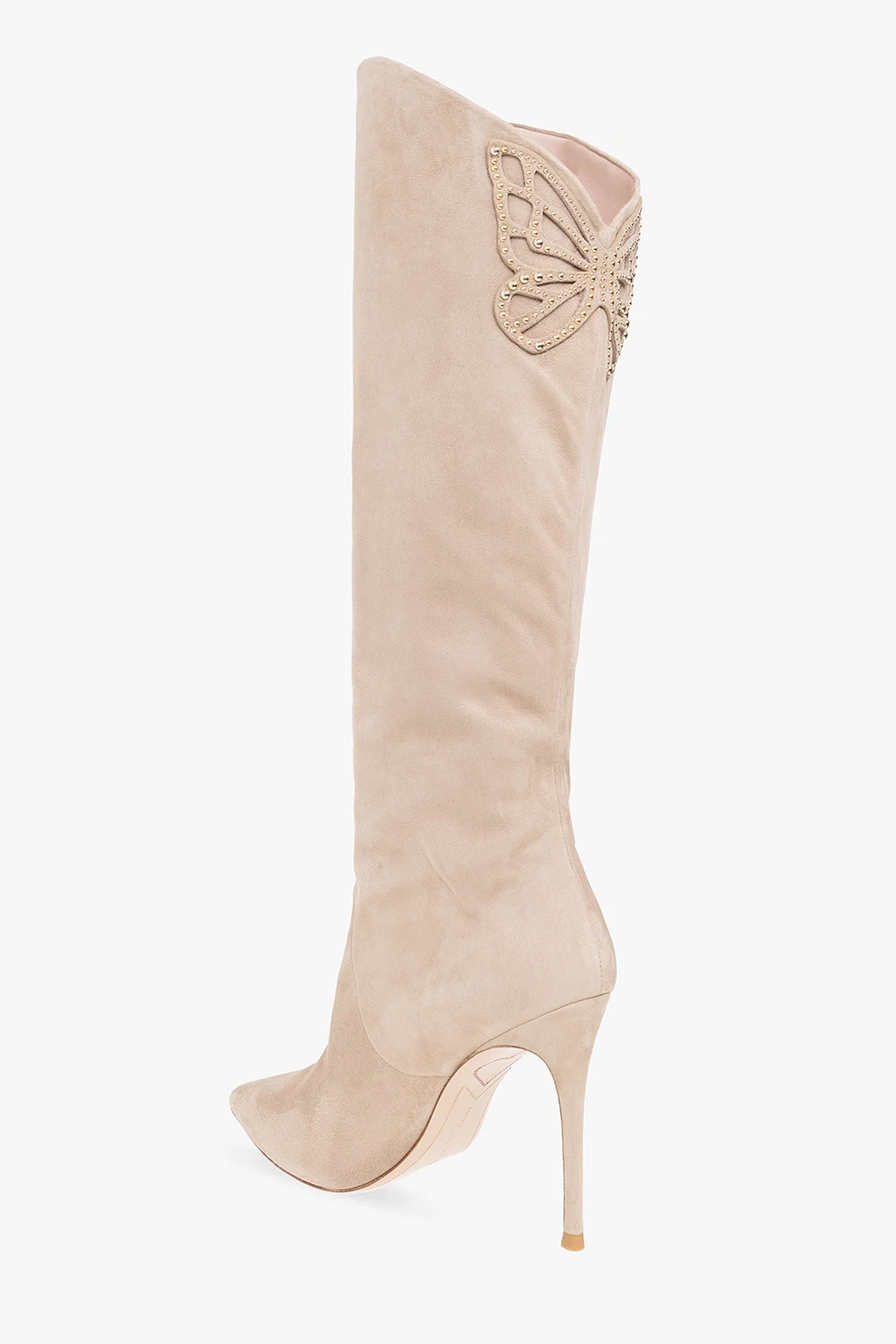 Beige ‘Asha’ heeled knee-high boots from Sophia Webster. Crafted from suede, this model features a pointed toe silhouette, the brand's signature Farfalla butterfly patch with gold-tone studs and a beige leather sole.
