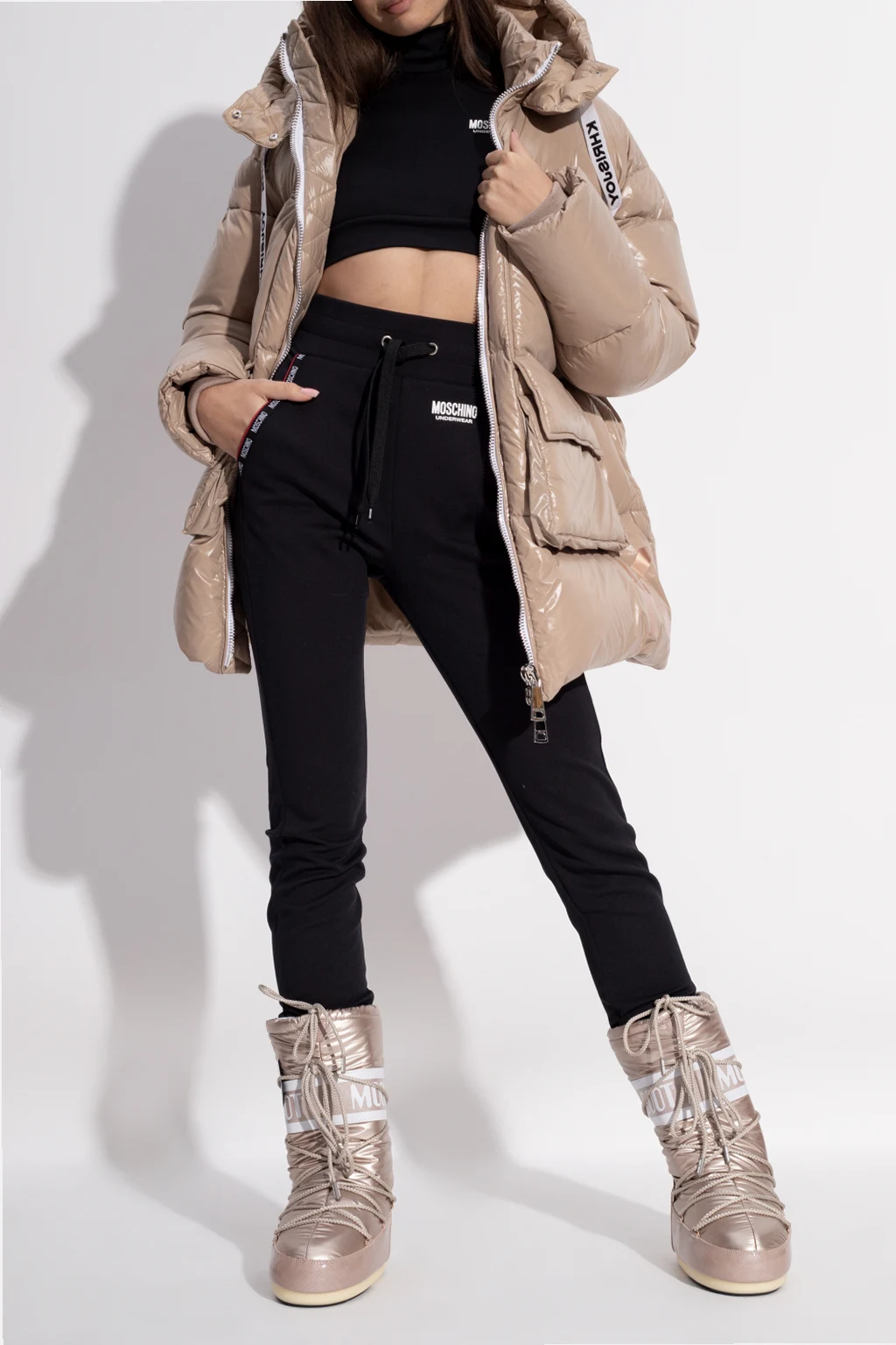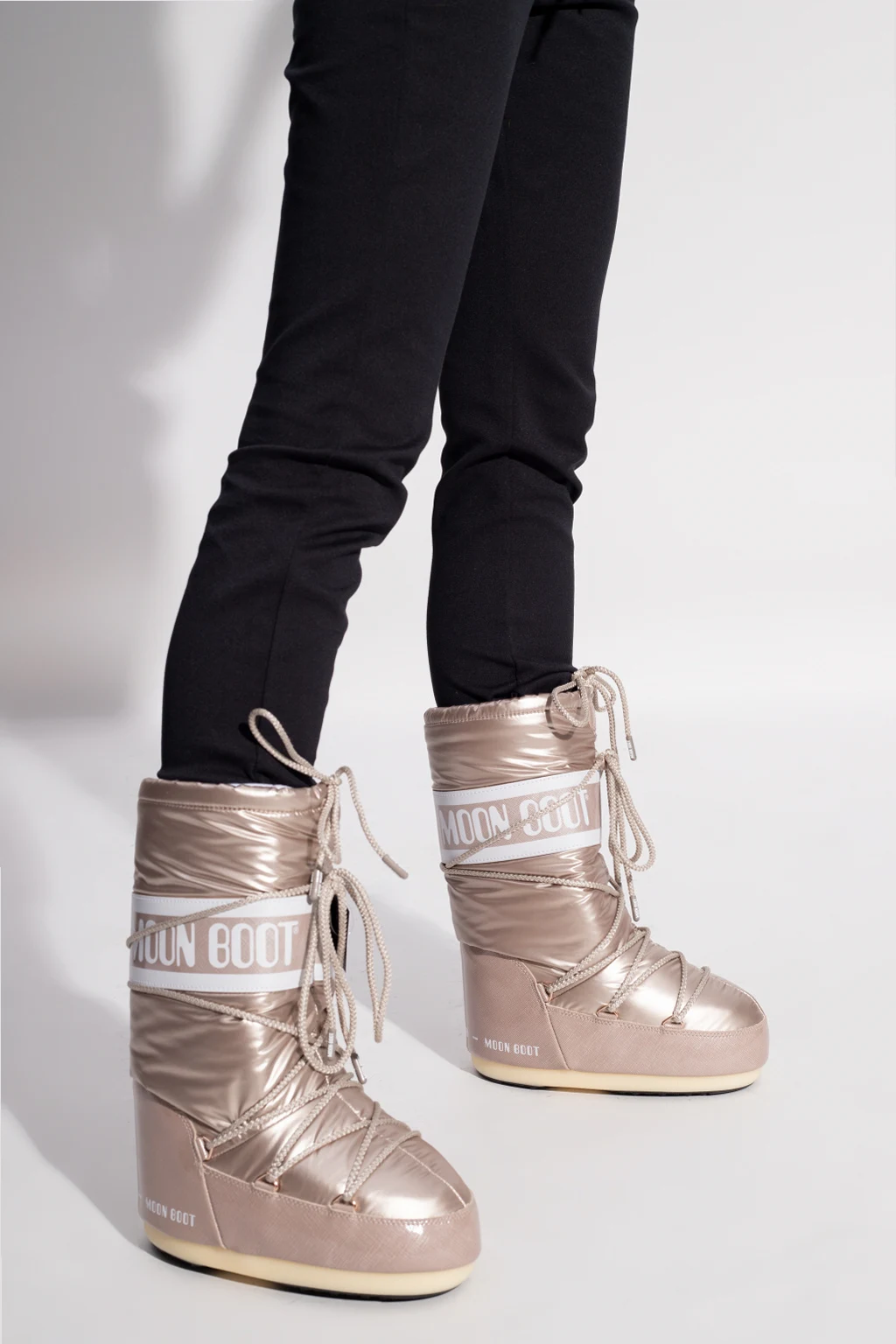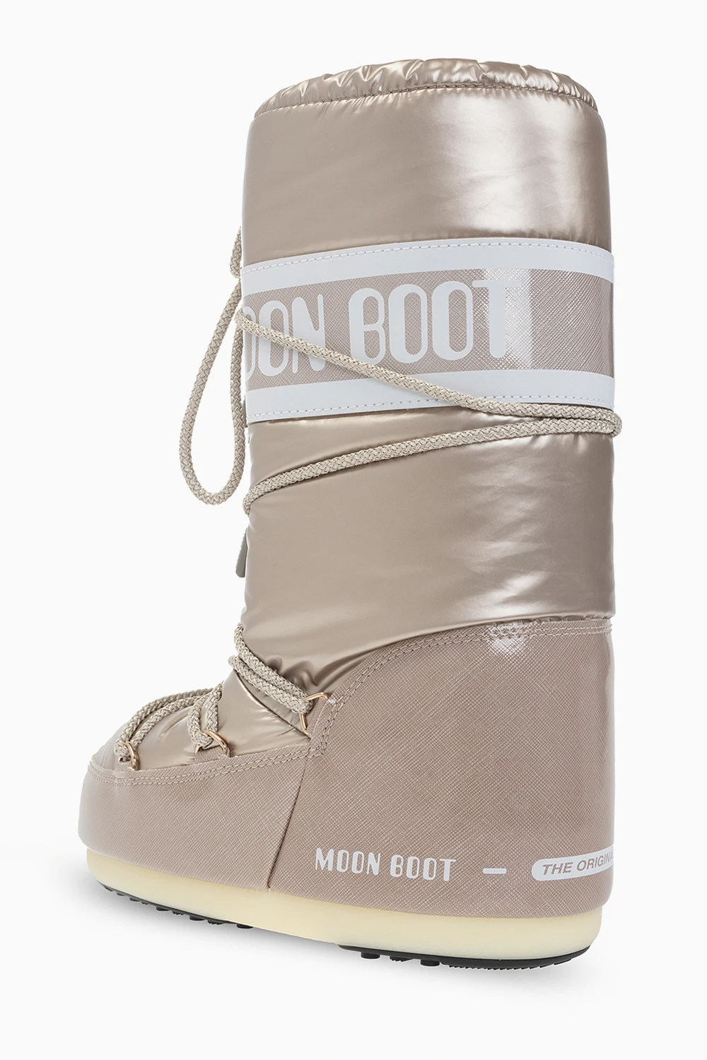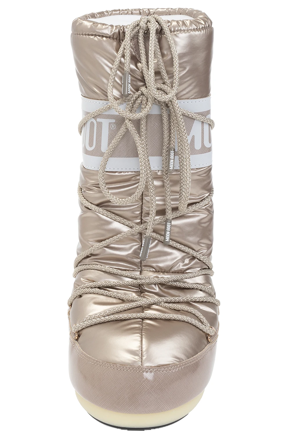 Gold and beige ‘Classic Pillow’ snow boots from Moon Boot. Set on a light yellow and black rubber sole, this pair is complete with decorative laces, brass-tone metal hardware and a white logo print. Inspired by the peculiar shape and technology of the astronauts’ boots, the iconic style was designed in 1969 after the first Moon landing.