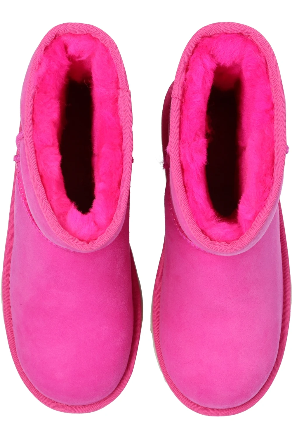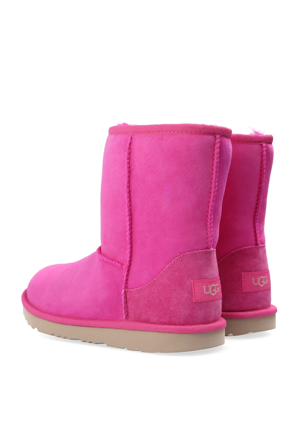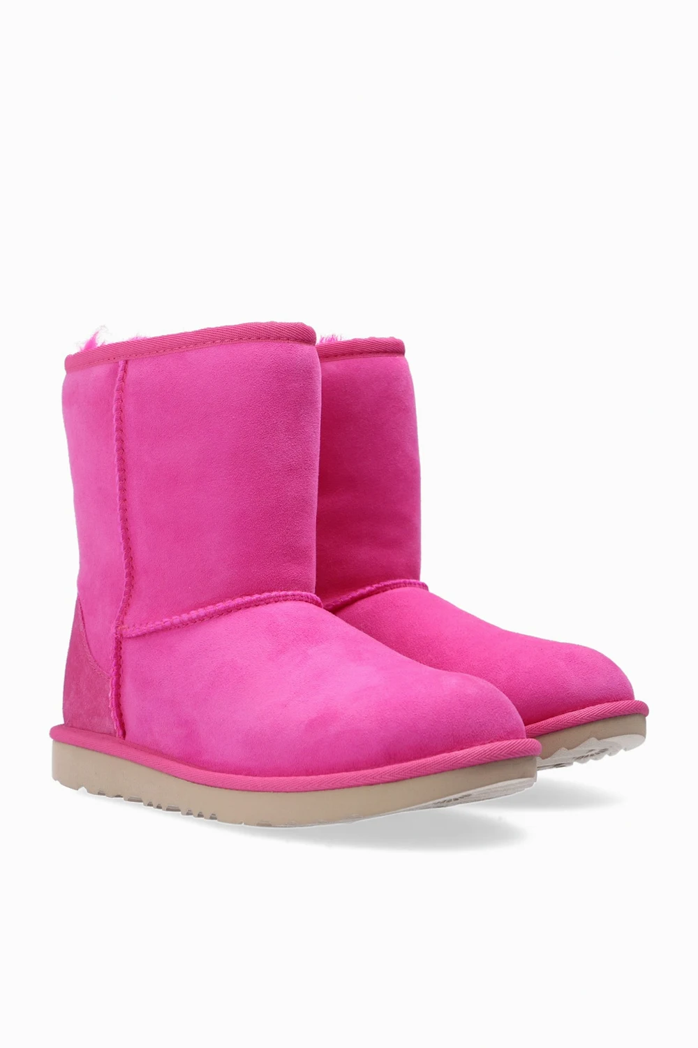 Dark pink ‘Classic II’ snow boots from UGG Kids. Crafted from suede and lined with sheep wool, this model is complete with stitching details, a logo appliqué sewn on at the heel and a textured EVA sole in cream.