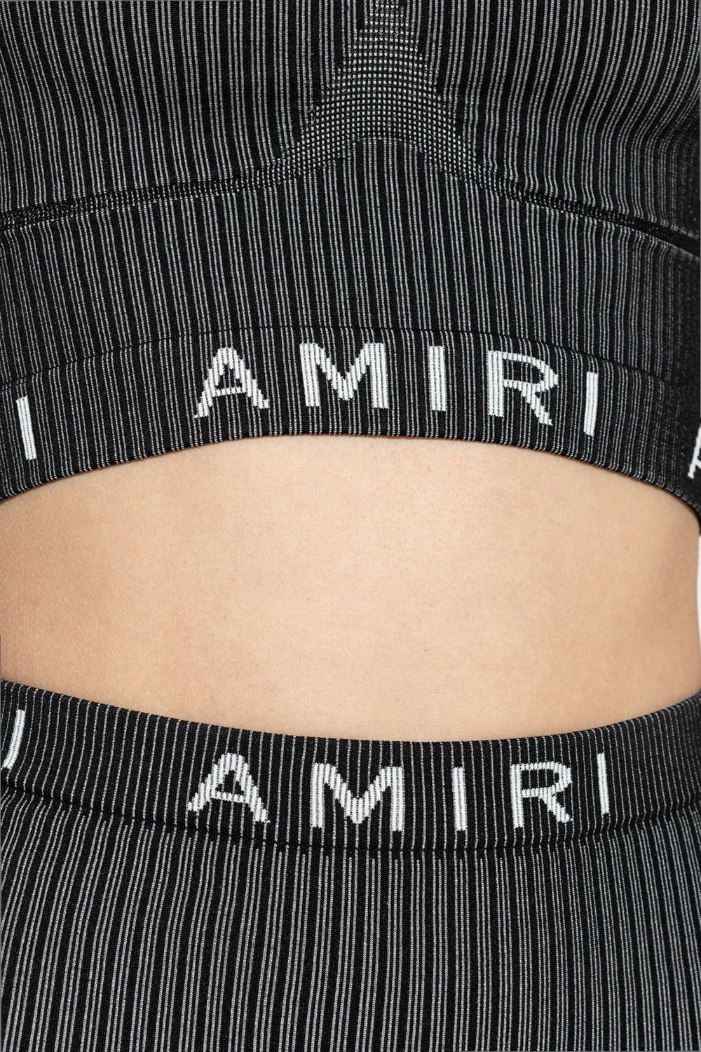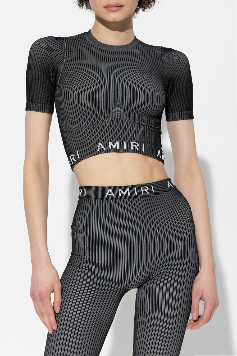 Black and grey top from Amiri. Crafted with a cropped, slim-fitting silhouette, this style features a round neck, short sleeves and logo embroidery.