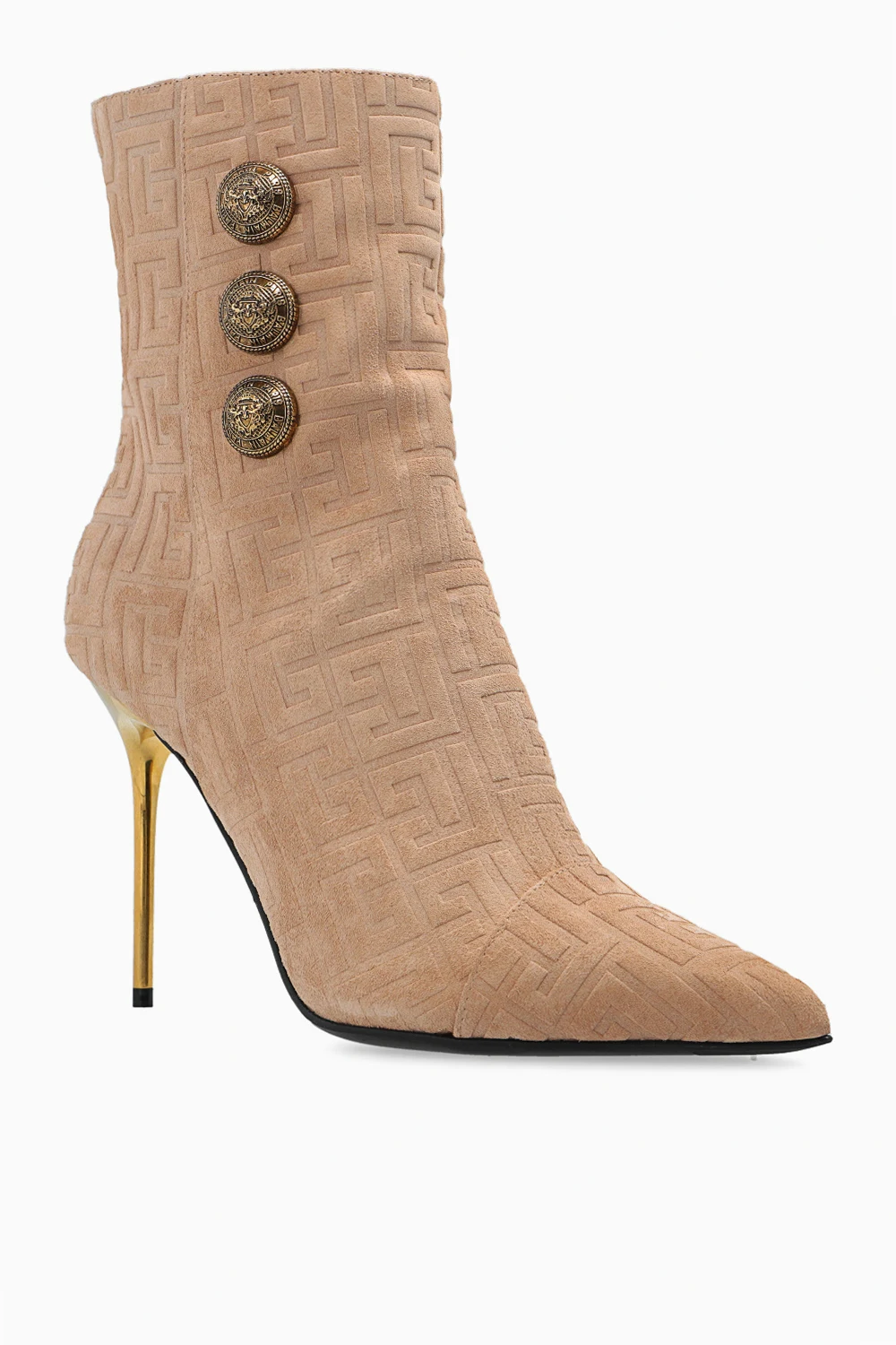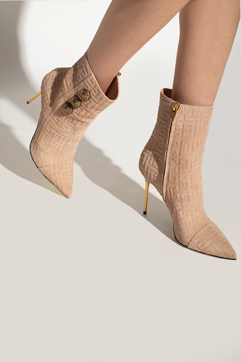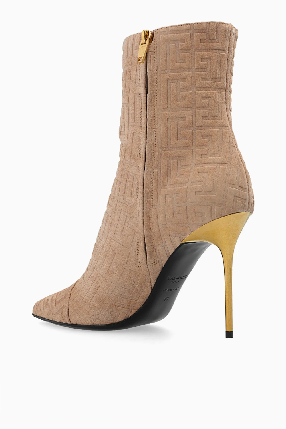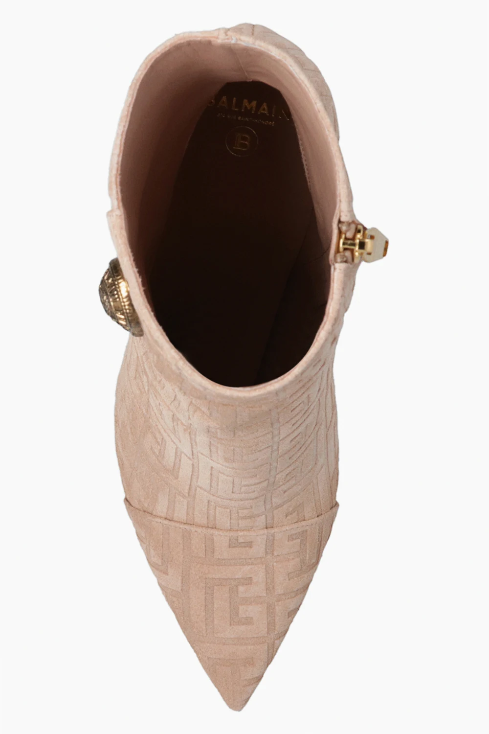 Beige ‘Roni’ heeled ankle boots from Balmain. Crafted from calf suede embossed with a monogram pattern, this model features a pointed toe silhouette with a side zip closure, distinctive antiqued gold-tone metal details with the brand's logo, a black leather sole and a high gold-tone heel.