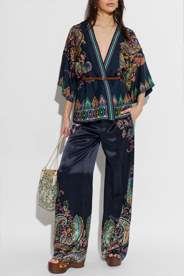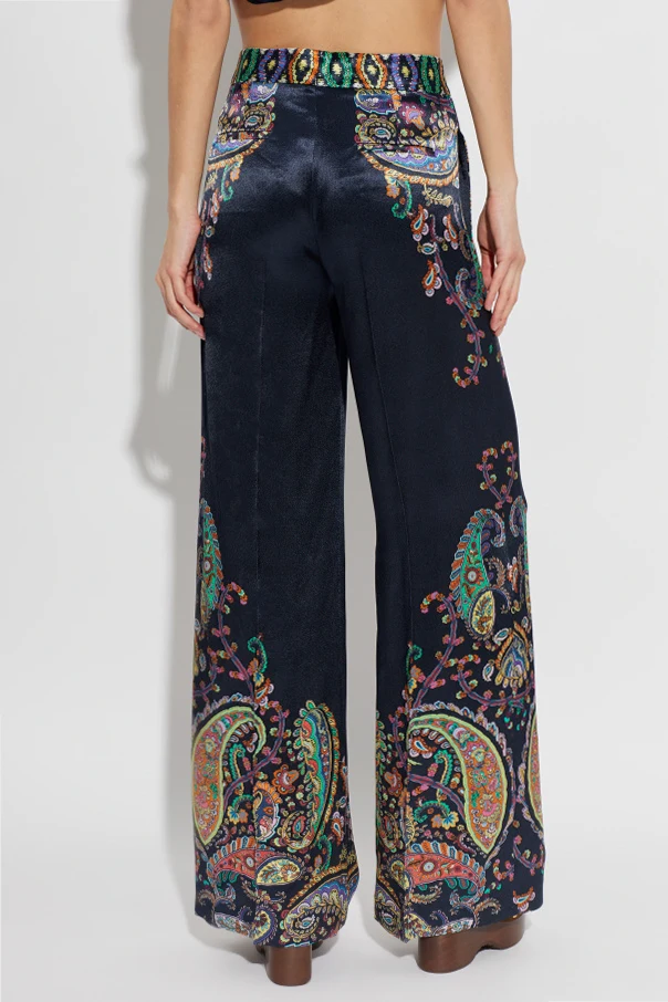 Weit geschnittene Hose von Etro ist ein Ausdruck exklusiven Designs und außergewöhnlicher Eleganz. Sie zeichnet sich durch einen marineblauen Hintergrund aus, der durch den effektvollen Glanz edler Viskose dezent betont wird. Der Schnitt mit weiten, leicht nach unten ausgestellten Beinen sorgt nicht nur für Bewegungsfreiheit, sondern auch für eine atemberaubende optische Wirkung und verleiht der Silhouette raffinierte Leichtigkeit.