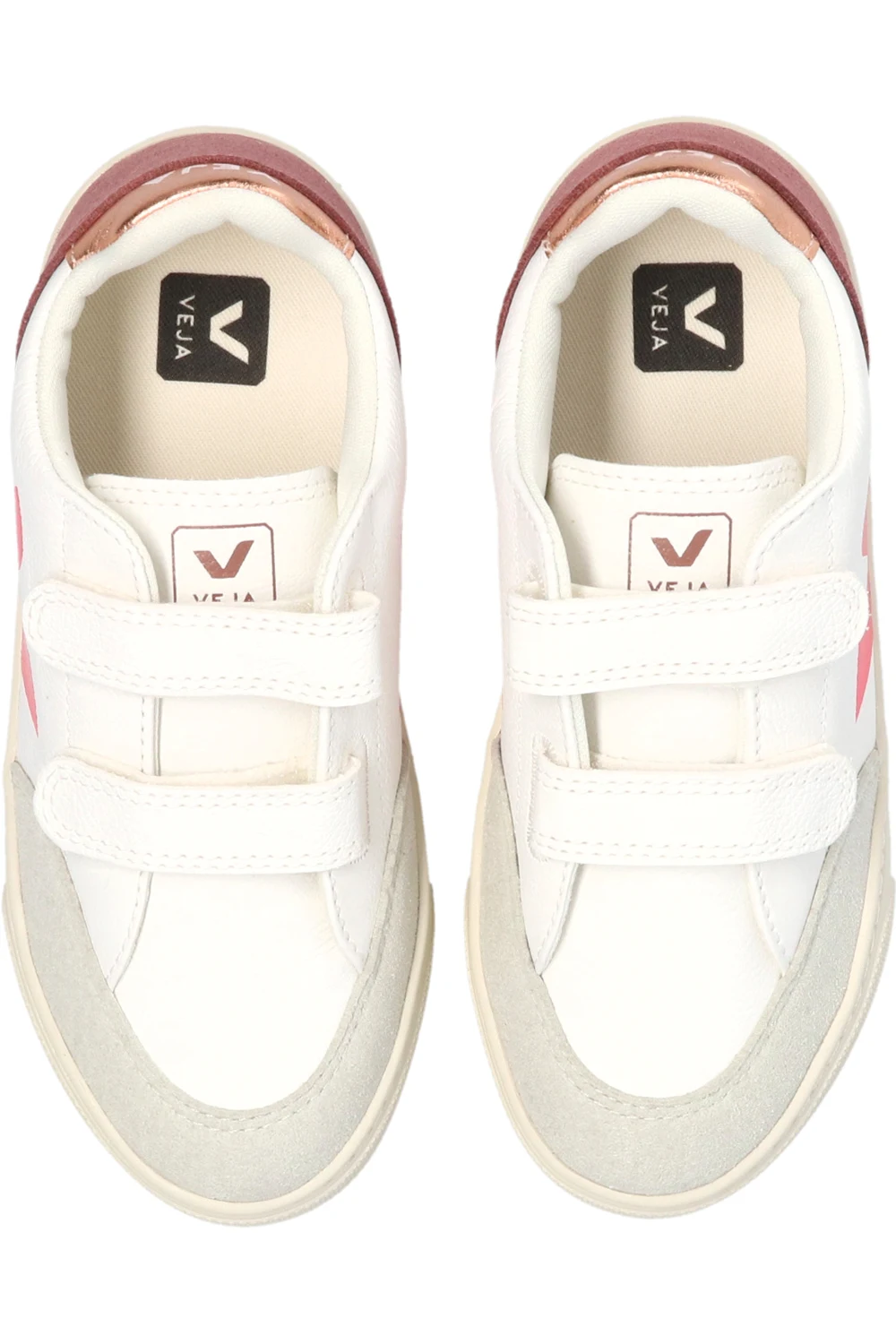 White, grey and brown ‘V-12’ sneakers from Veja Kids. Crafted from chrome-free leather trimmed with textured vegan suede, this lace-up pair fastens with velcro and is decorated with a screen printed logo and a gold-tone heel tab. The mesh inner lining made from recycled materials was developed to acquire a better resistance to friction. The organic-sourced and recycled insole is made from sugar cane, Amazon rubber, organic cotton and recycled EVA. It is set on a beige rubber sole made of organic and recycled materials.