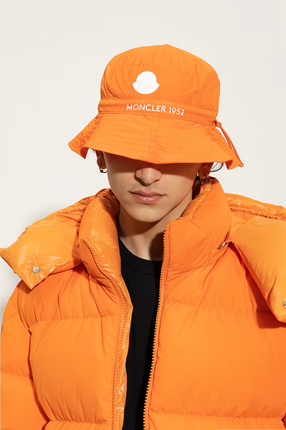 Neon orange bucket hat from Moncler Genius, the ‘2 Moncler 1952’ collection. Fastened with drawstrings, this item is decorated with a white logo print.