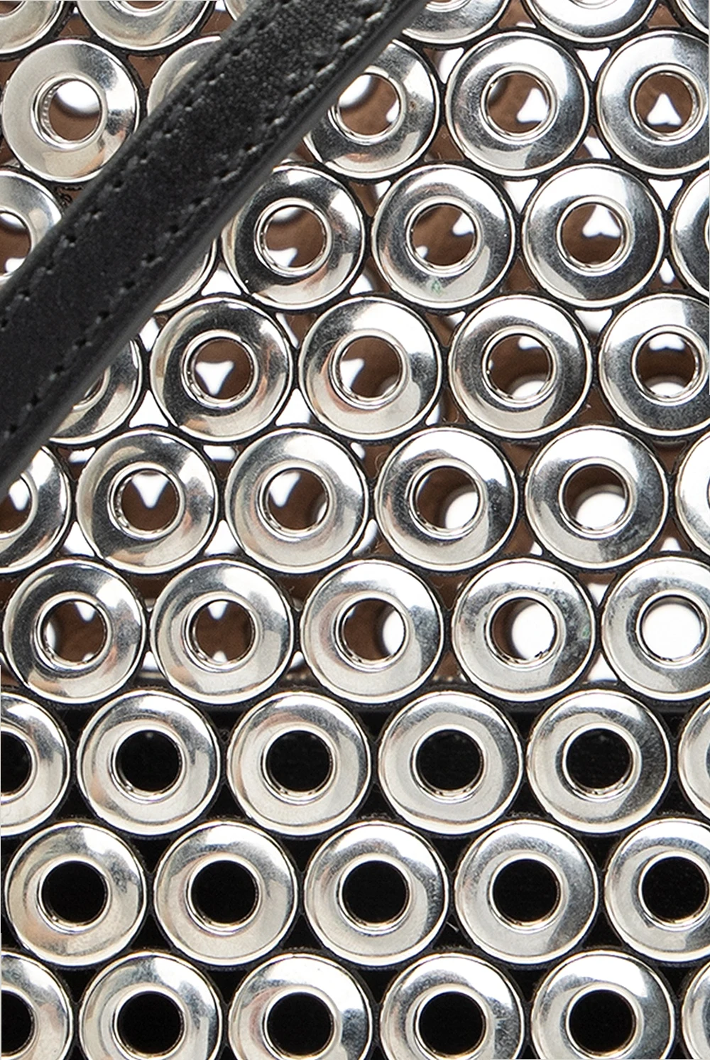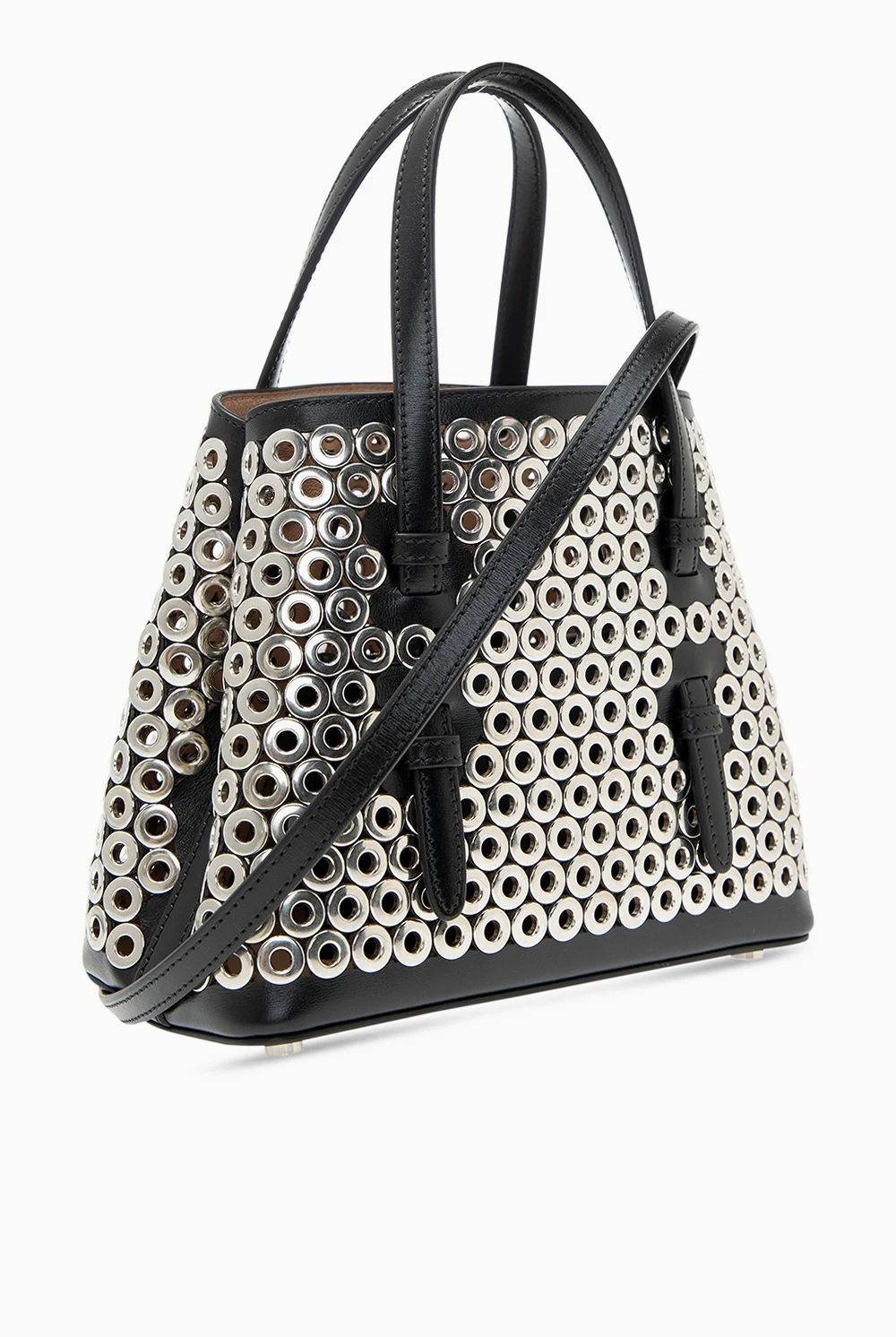 Silver-tone and black 'Mina 20' shoulder bag from Alaia. Distinguished by silver-tone ornamentation, this design is complete with two half-round handles and beige clad interior with one compartment. Equipped with a detachable shoulder strap, it also comes with a pouch and small-sized mirror.