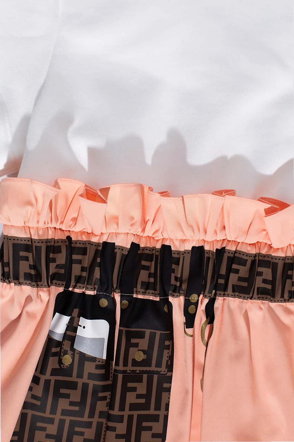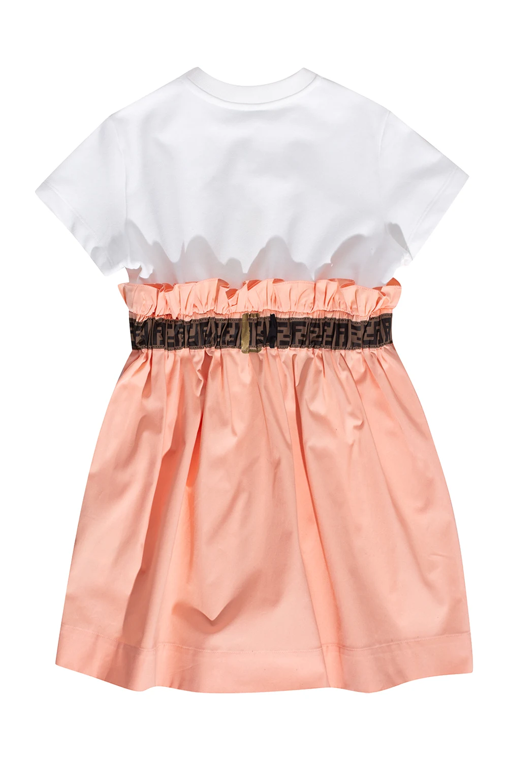 White and orange dress from Fendi Kids. Crafted from cotton, this short sleeve design features an elastic waistband and printed logo pattern in brown.