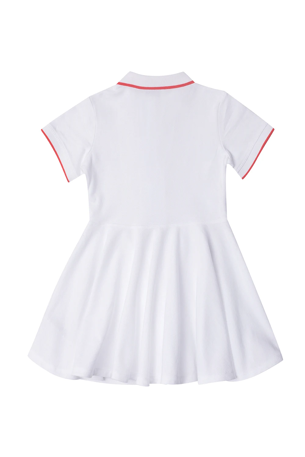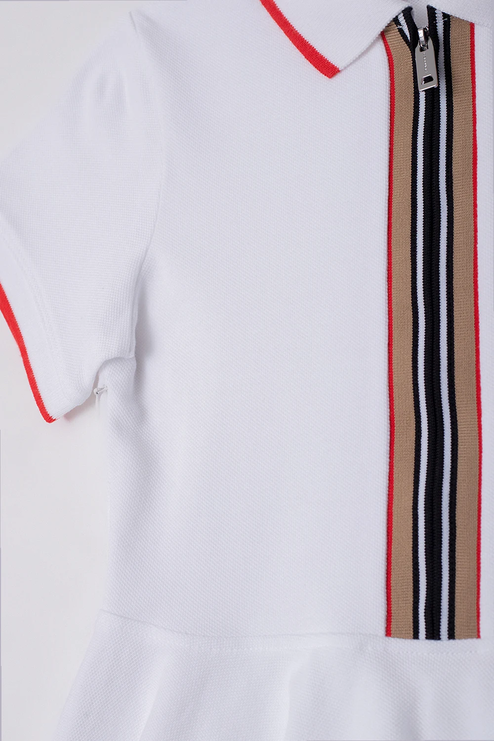 White polo dress from Burberry Kids. Made of cotton, this style features a white and red classic collar, a half-zip closure accentuated with white, black and brown piping, a hidden zipper on the side, short sleeves with elasticated cuffs, and a flared hem.