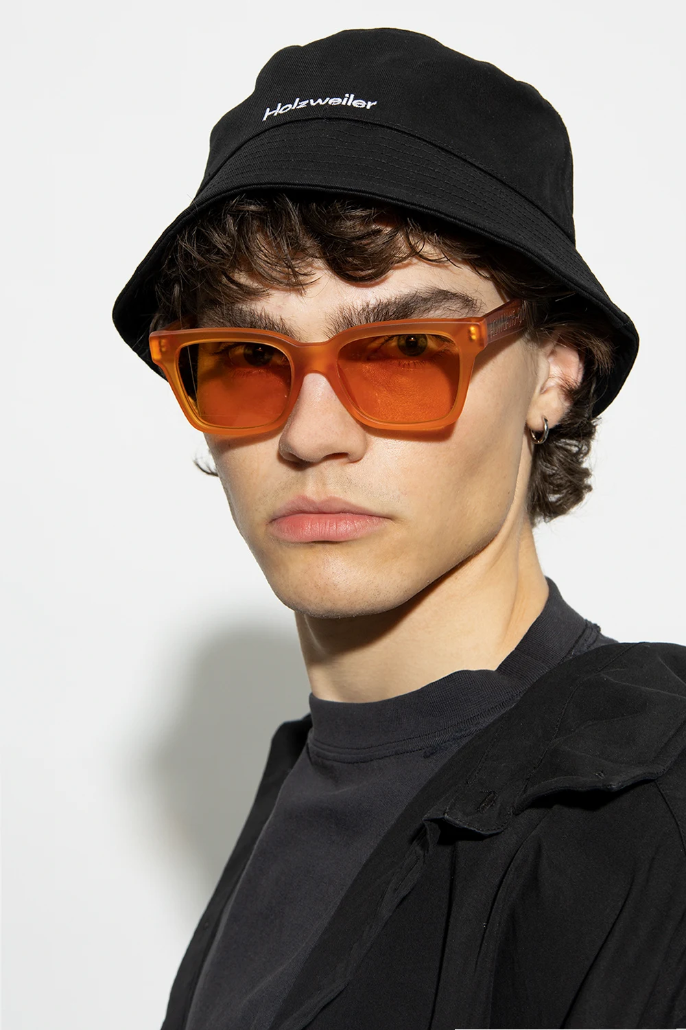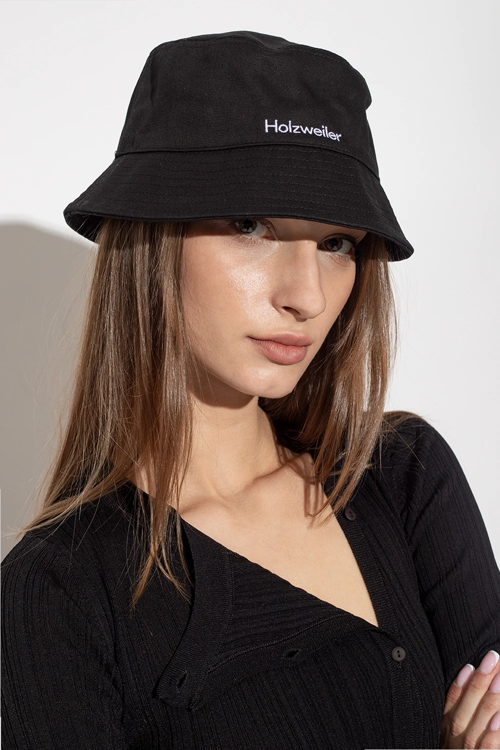 Black ‘Pafe’ bucket hat from Holzweiler. Crafted from cotton, this item features a white logo pattern.