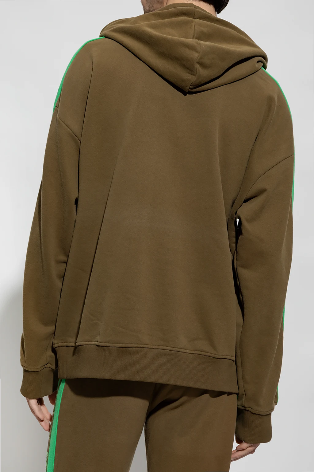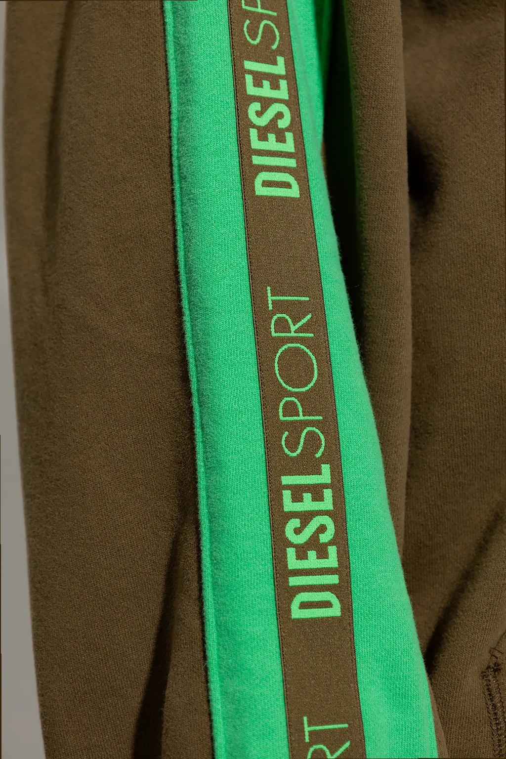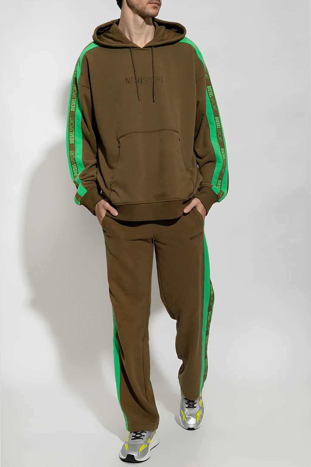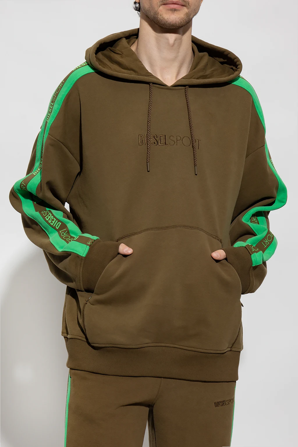 Dark brown and green 'AMST-BOWE-HT32' sweatshirt with a drawcord-adjustable hood from Diesel, the ‘DIESEL SPORT’ collection. Enriched by branded tapes on the long sleeves, this style features an embroidered logo on the front, a zip pocket, and elasticized trims on the bottom hem and cuffs.