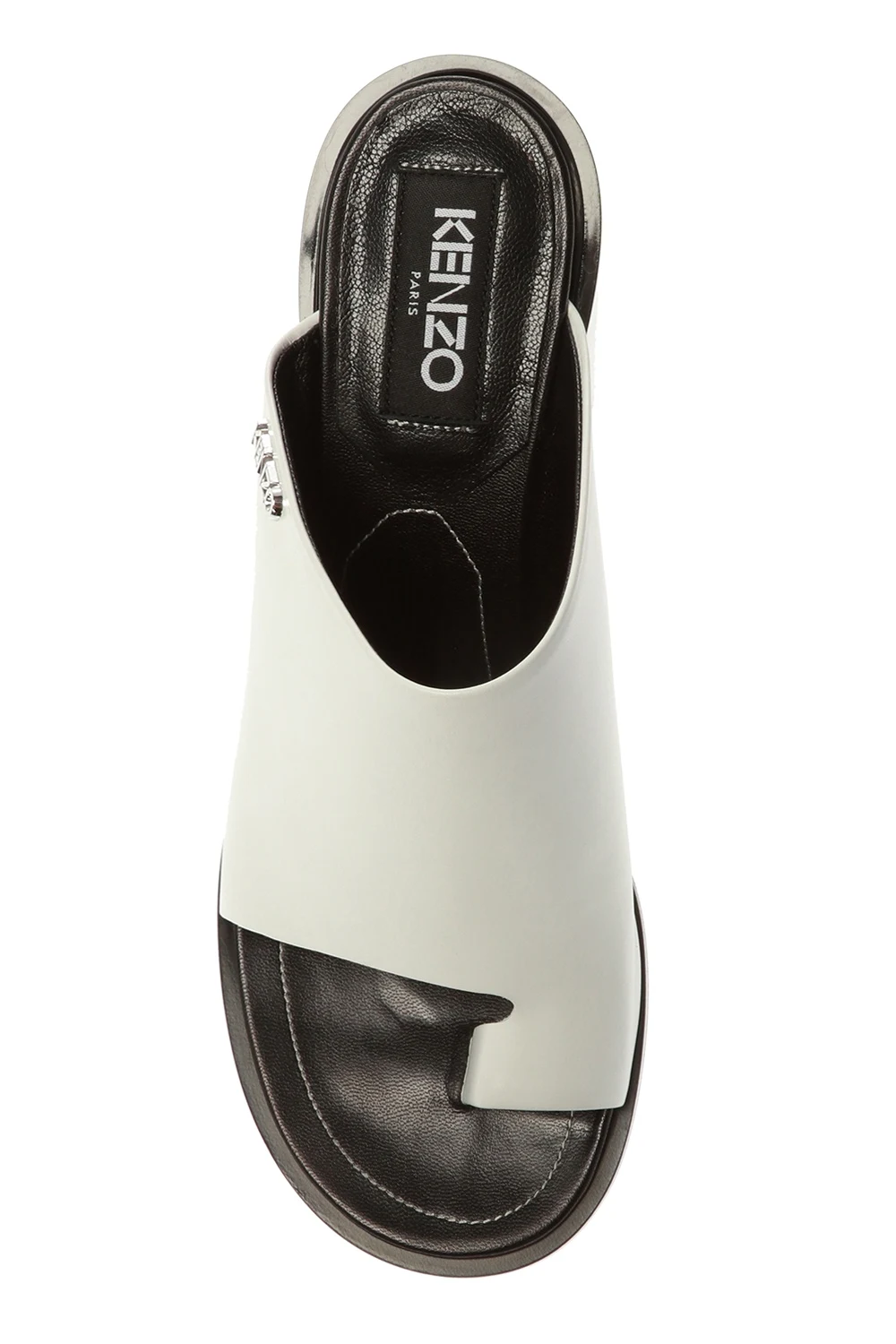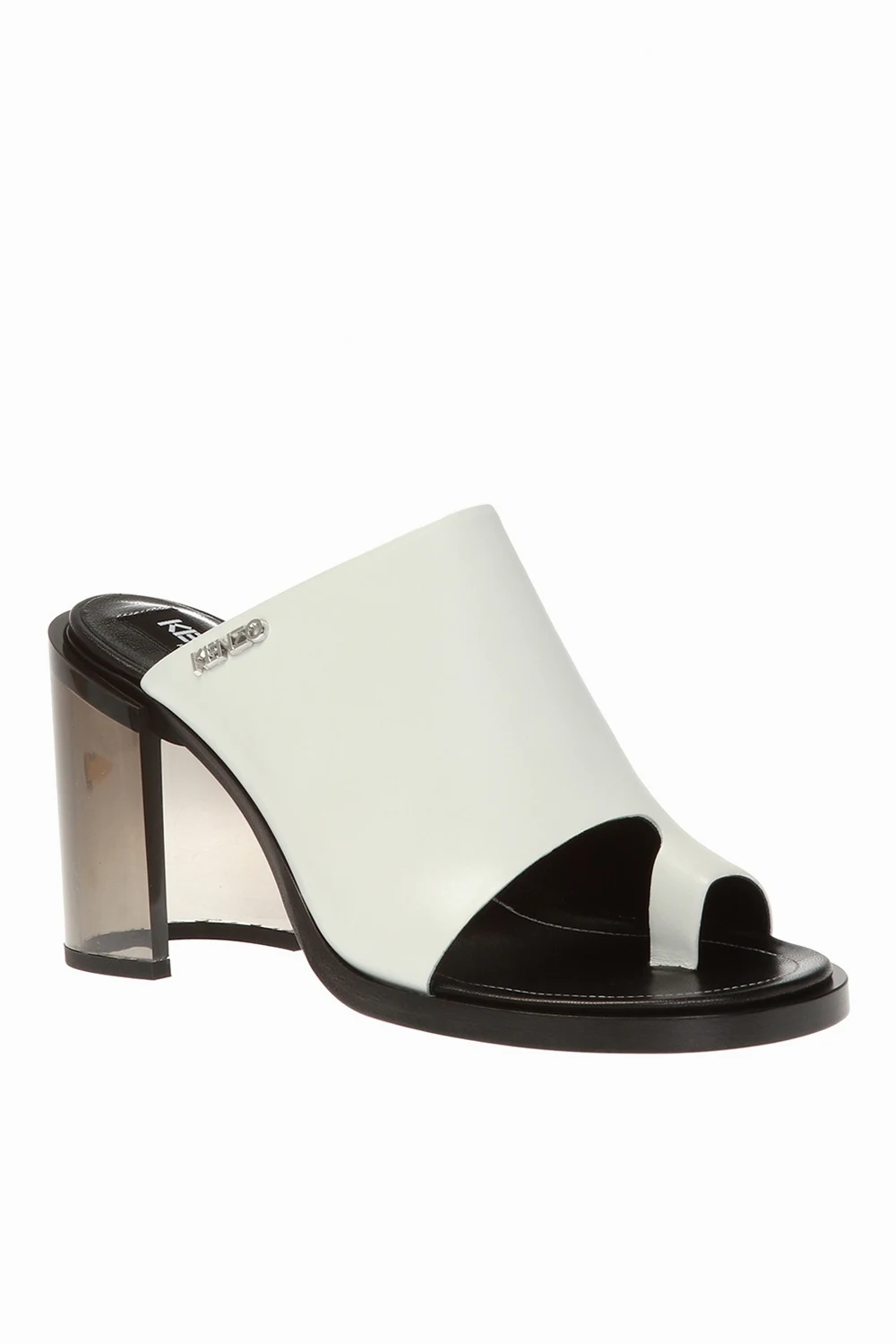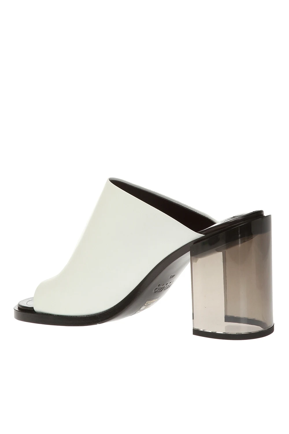 White 'K-Round' heeled mules from Kenzo. Made of calf leather. Transparent heel with a cut-out detail. Black leather sole.