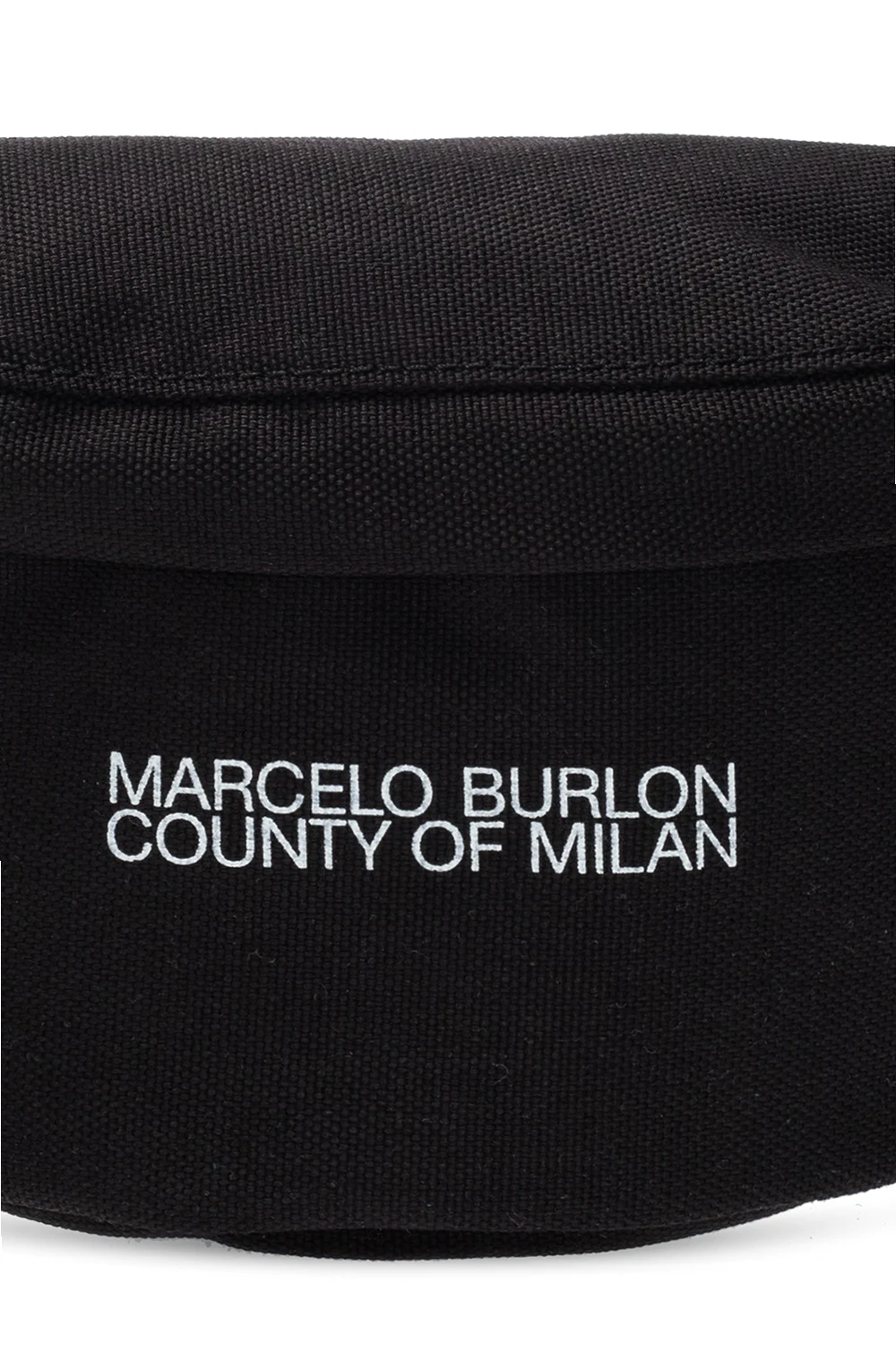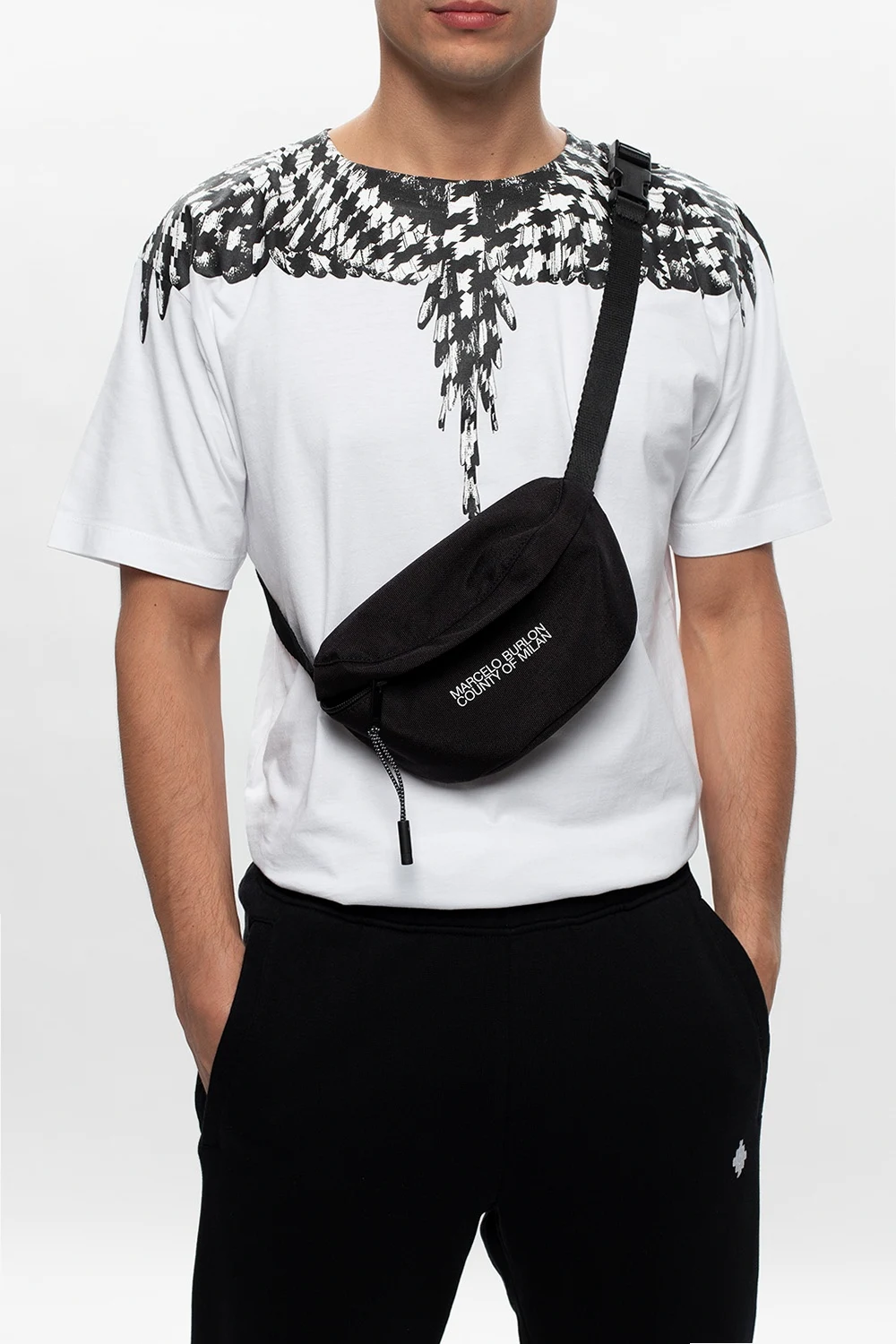 Black belt bag from Marcelo Burlon. Printed with the designer's logo in white, this style fastens via zip and employs an external slip pocket on the back, an adjustable strap and one internal compartment.