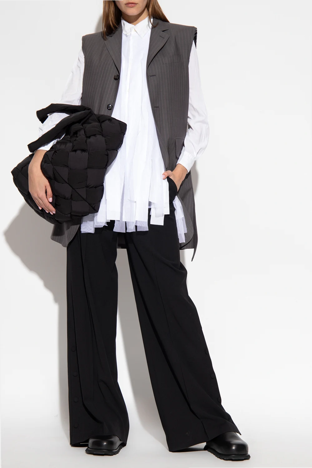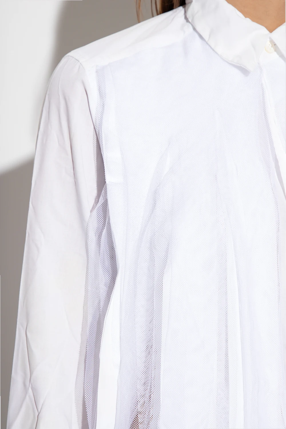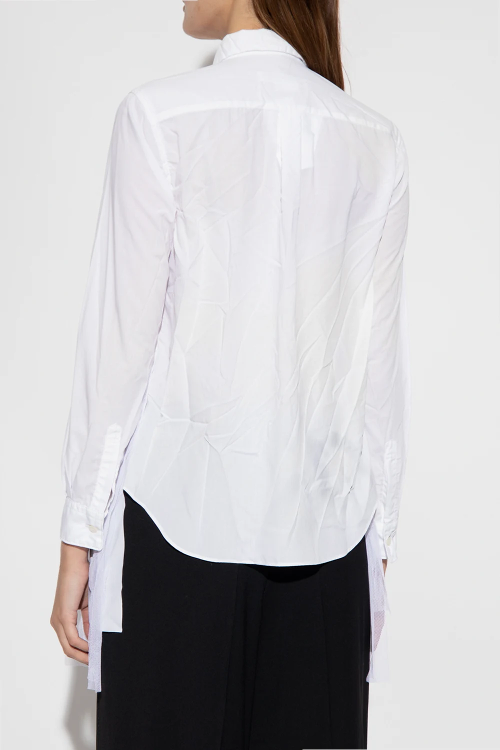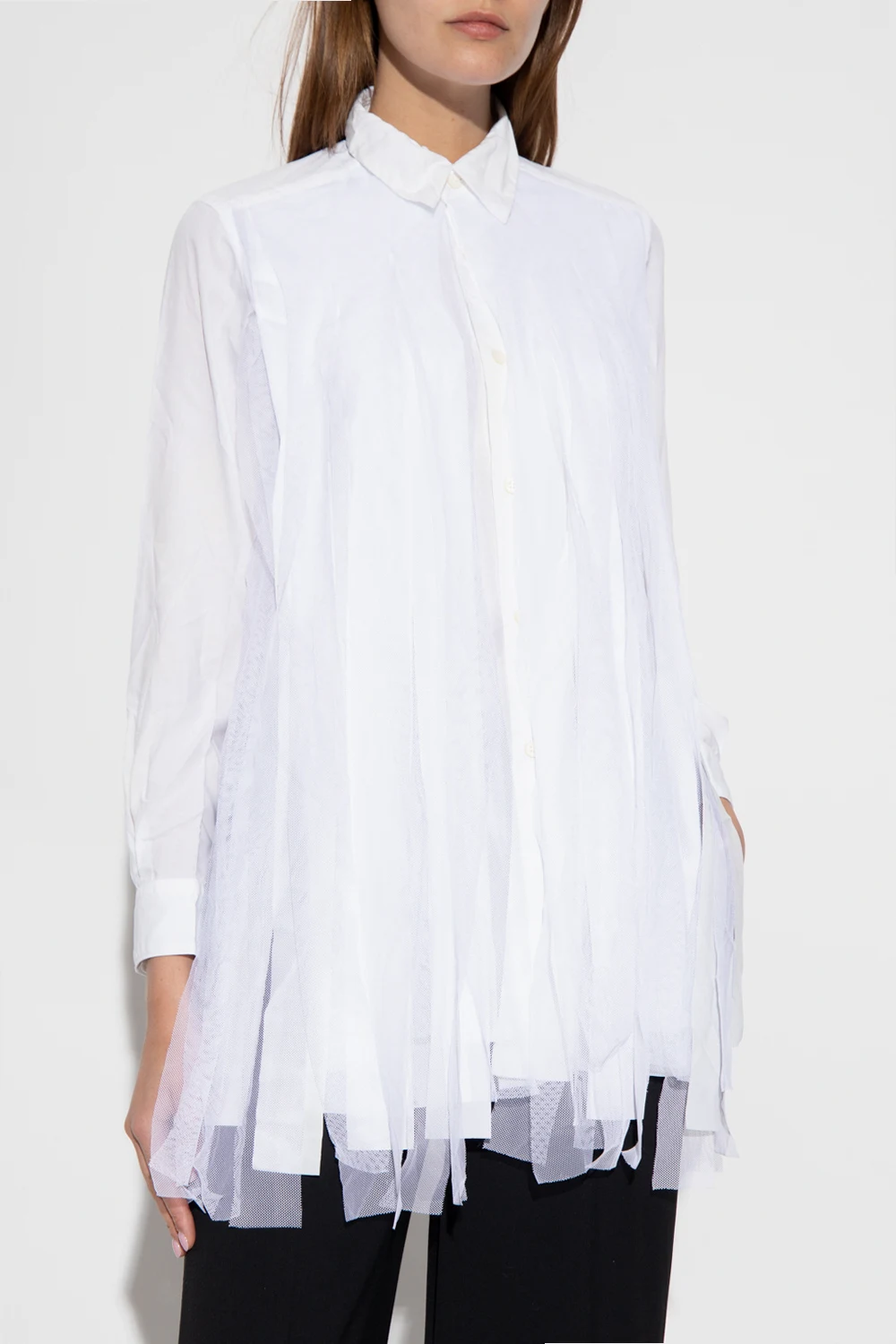 White shirt from CDG by Comme des Garçons. Accentuated with tulle trims, this style features button fastenings and long sleeves with button cuffs.