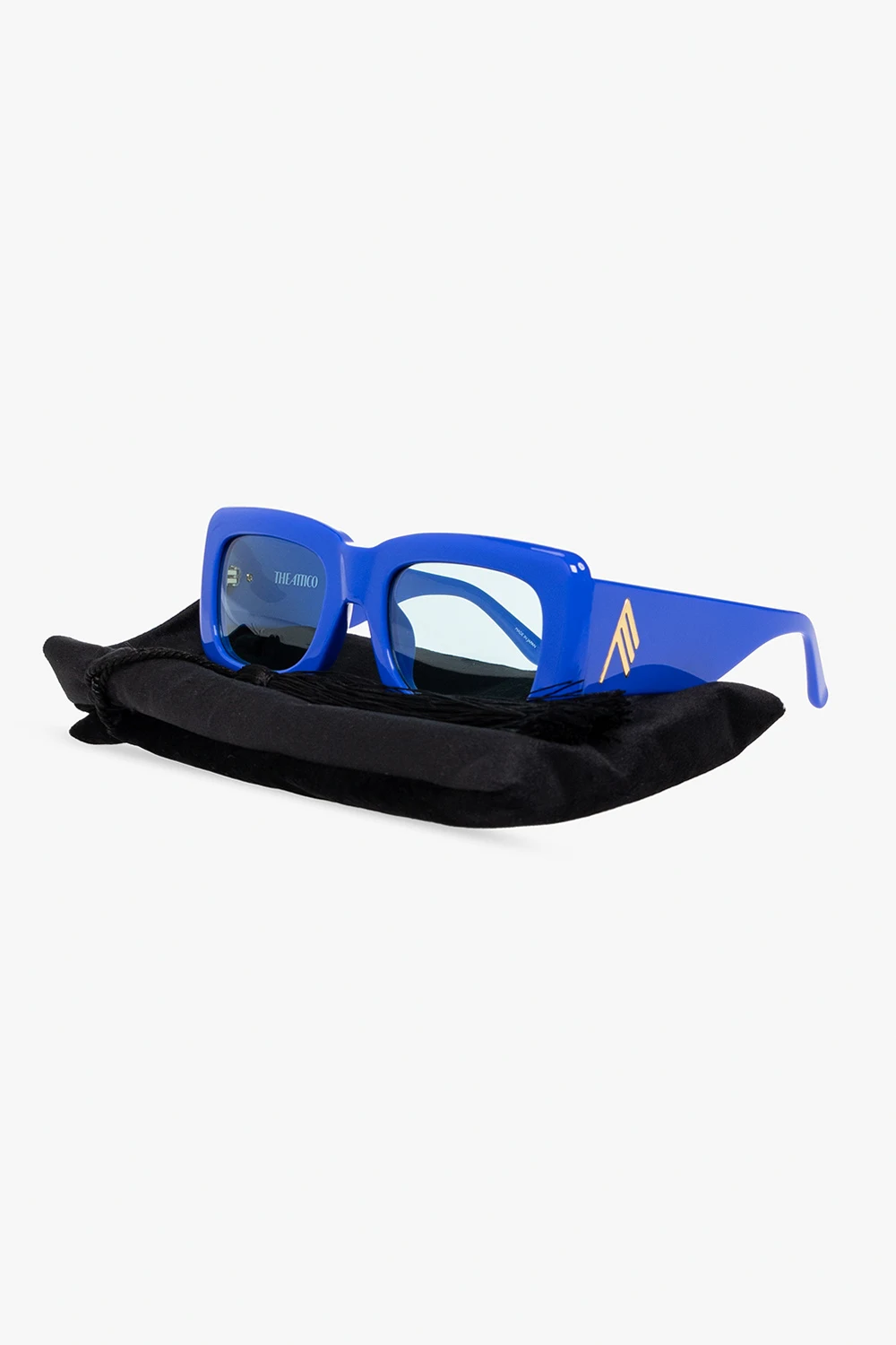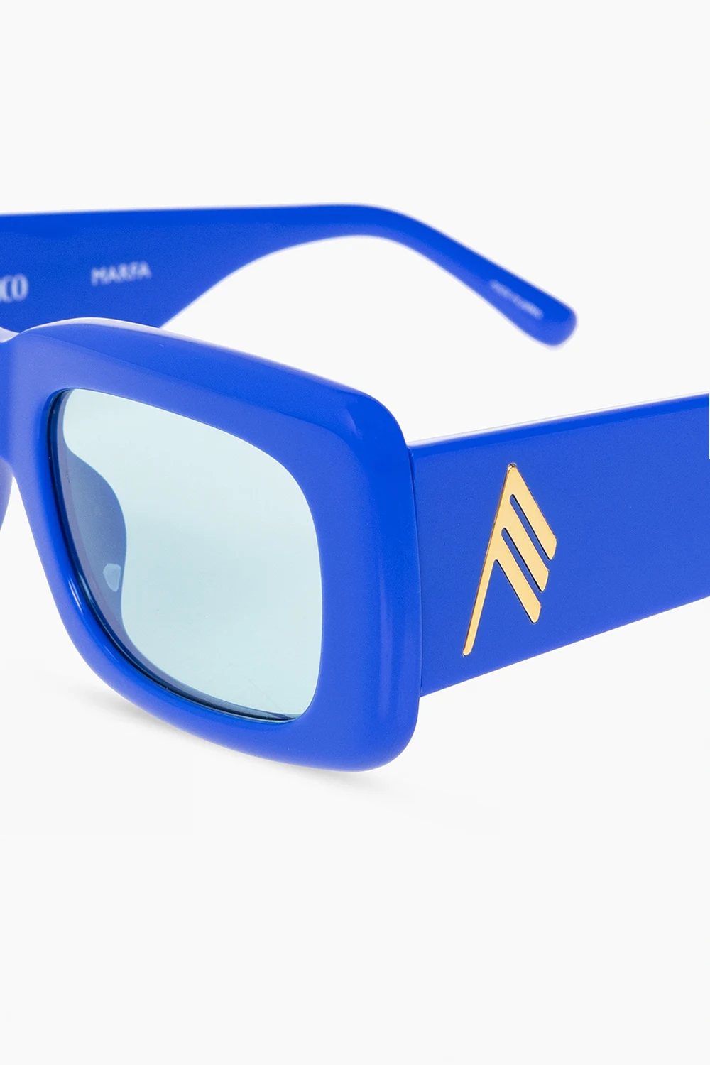 Blue ‘Marfa’ sunglasses from Linda Farrow x The Attico. This pair has square eye frames, gold-tone logo at the temples and light blue lenses with 100% UV protection. Comes with a case.
