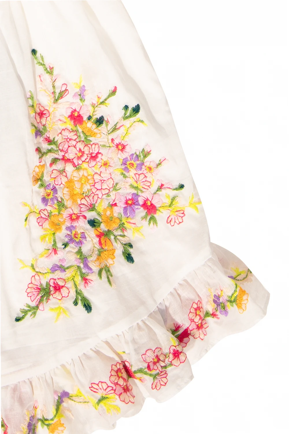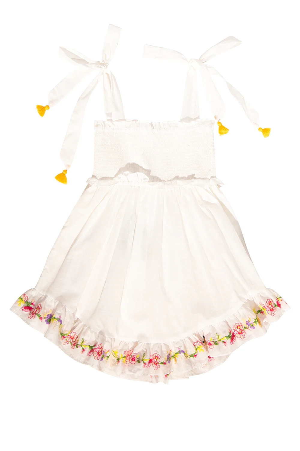 White dress from Zimmermann Kids. Made of cotton, this garment is enriched by gathers, a ruffle and an embroidered, multicolored floral motif.