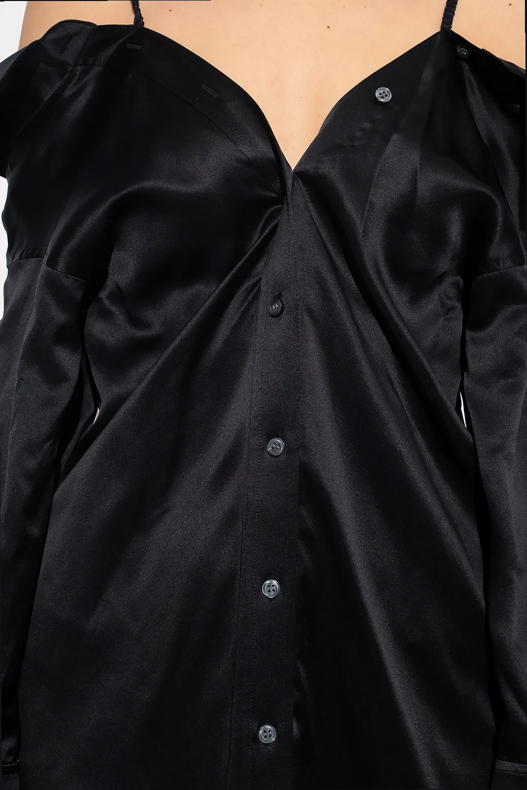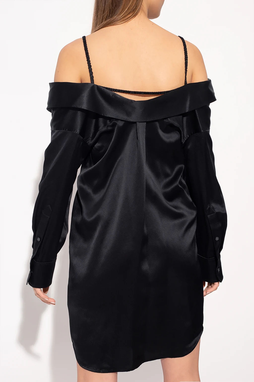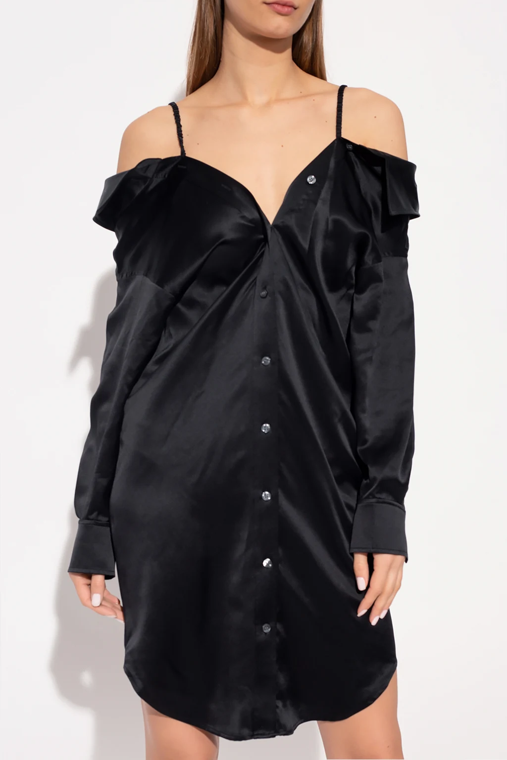 Black slip dress from Alexander Wang. Made of silk, this style features button fastenings, elastic shoulders straps and long sleeves with cuffs.