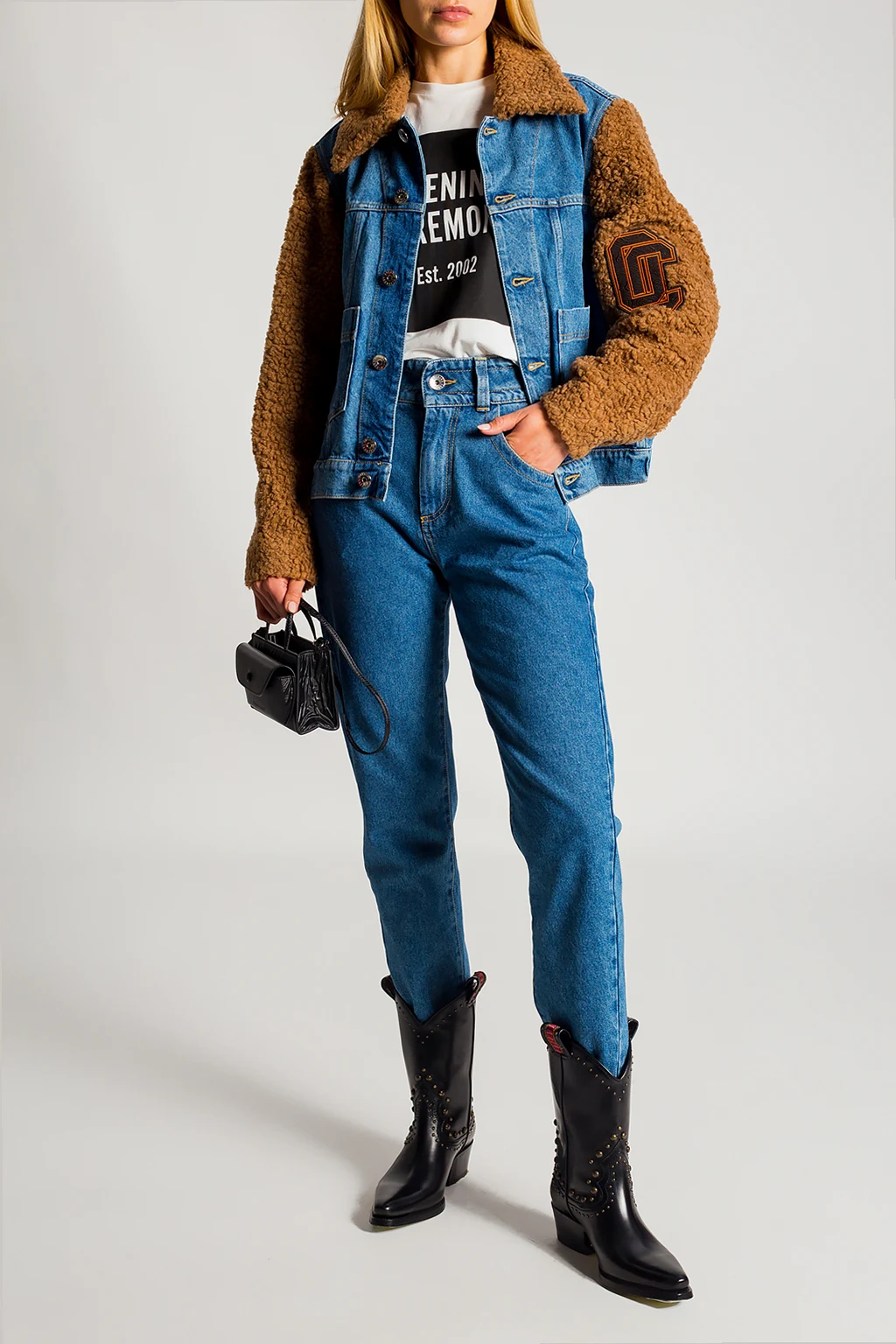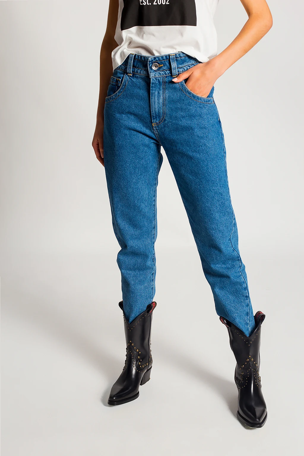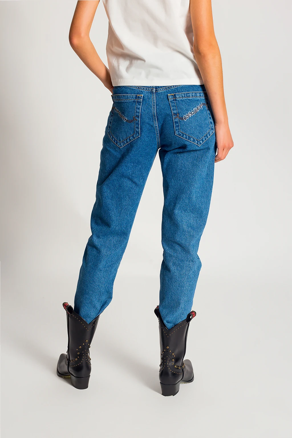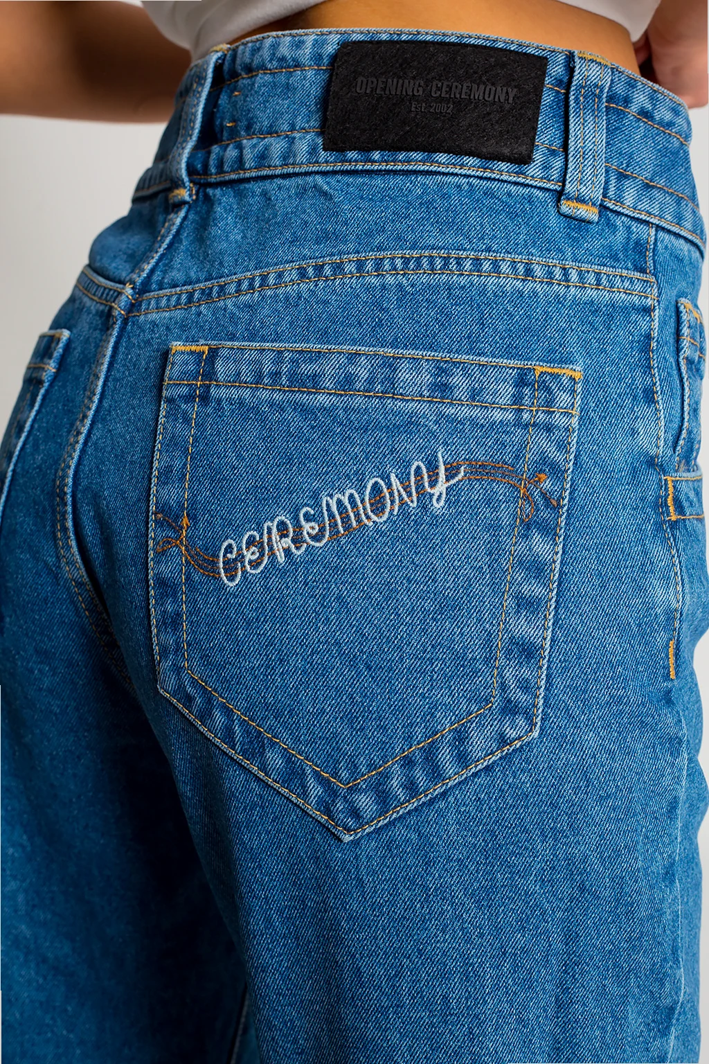 Blue jeans from Opening Ceremony. Crafted from cotton, this pair falls down with slightly tapered legs and features a zip and button fastening, logo embroidery and black patch at the back, as well as three front pockets and two back pockets.