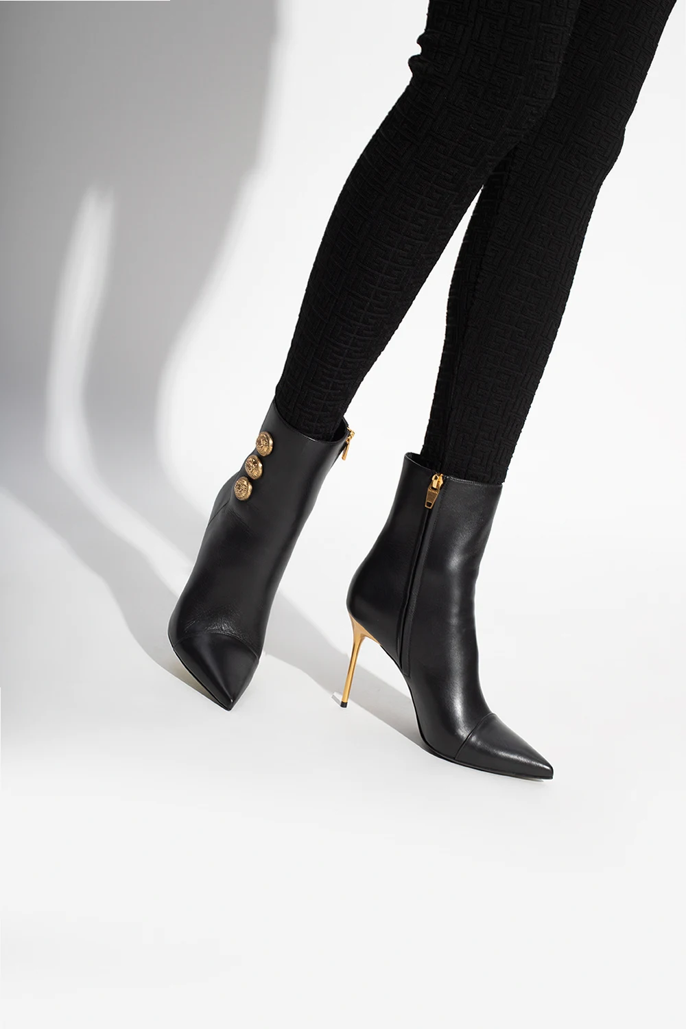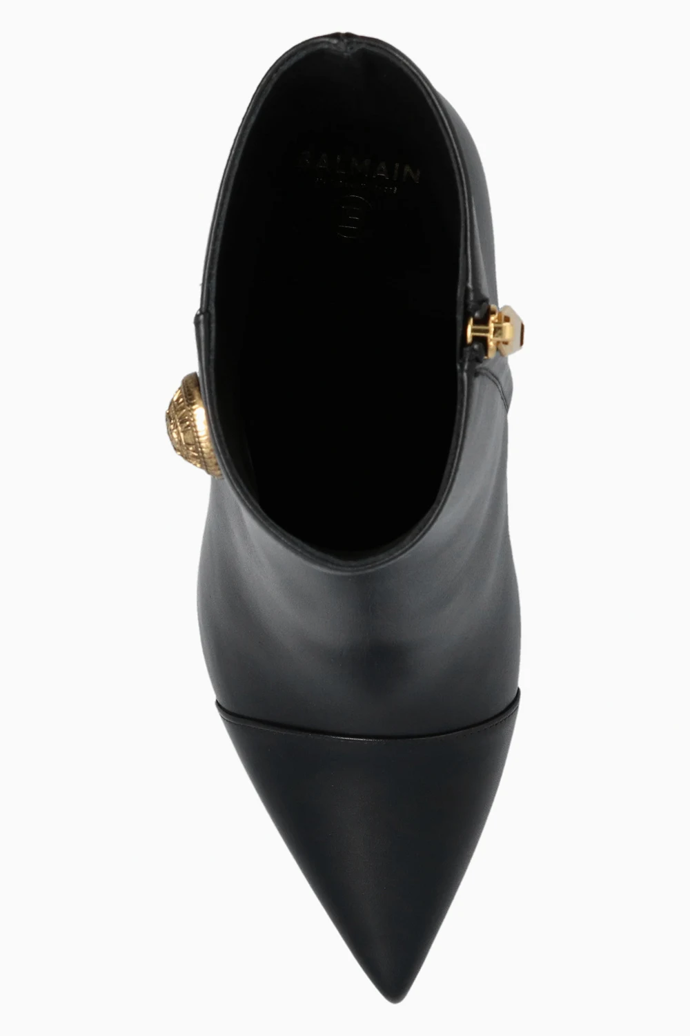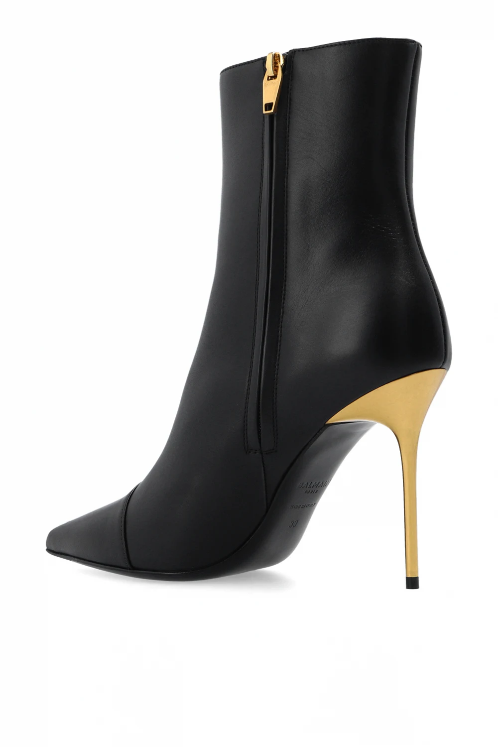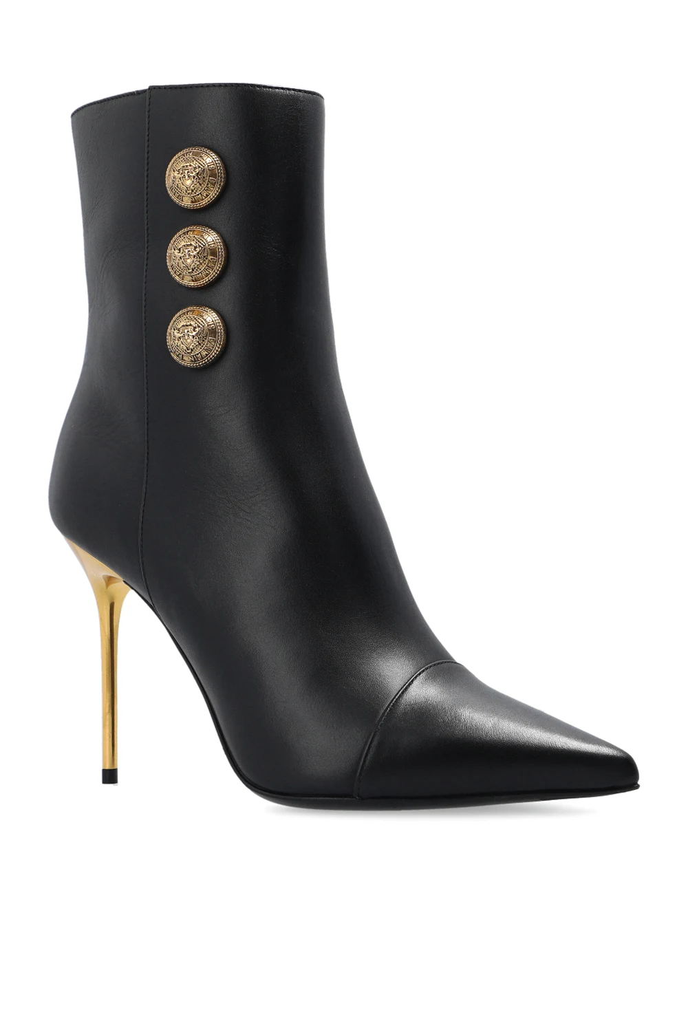 Black ‘Roni’ heeled ankle boots from Balmain. Made of calf leather, this model features a side zip, gold-tone appliqué embossed with a gold-tone logo pattern, pointed toe and black leather sole.