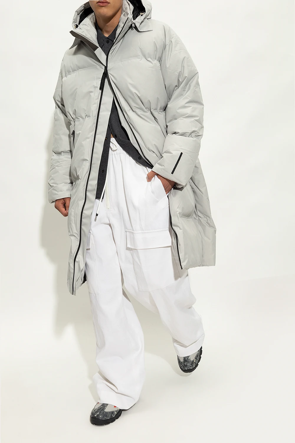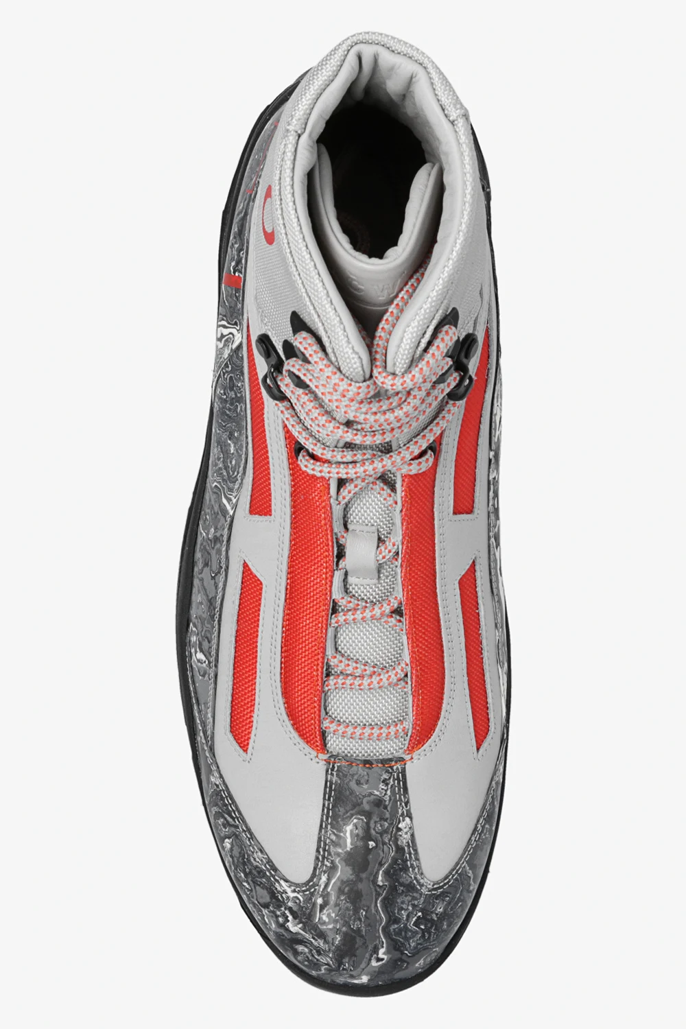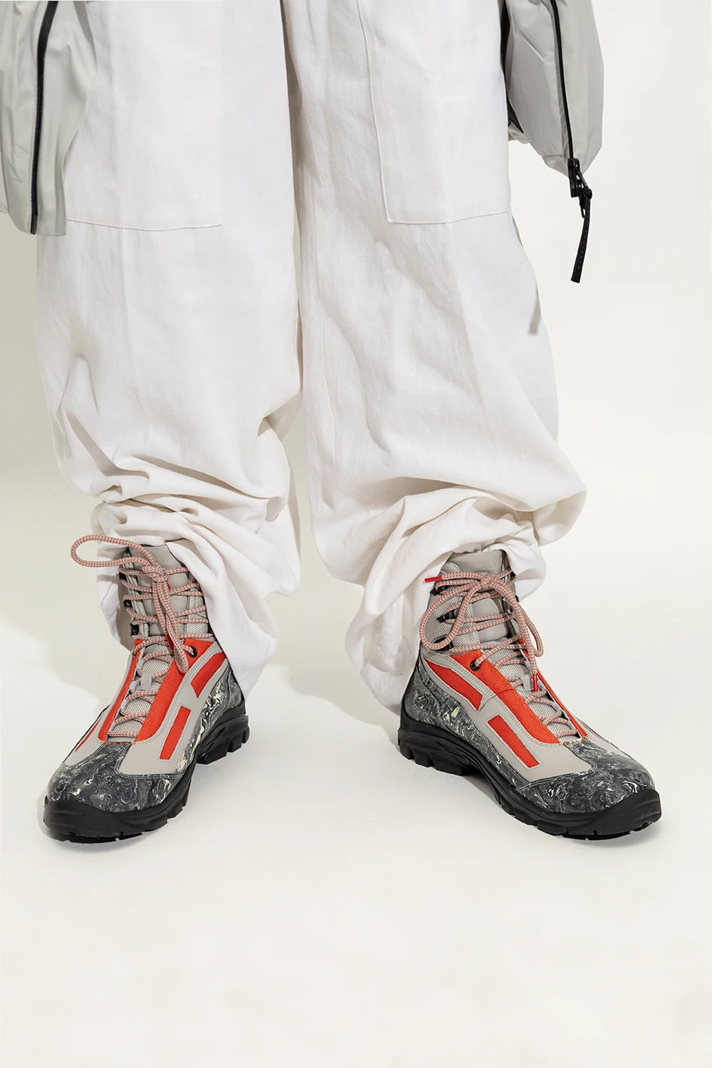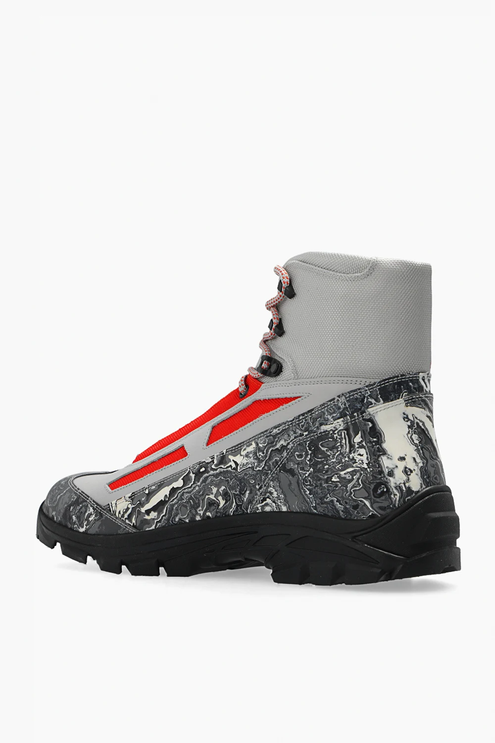 Grey, orange and black ankle boots from A-COLD-WALL*. Made of durable recycled canvas, rubber panels and leather, this lace-up model features a graphic pattern, a logo print and a black and yellow Vibram® rubber sole.