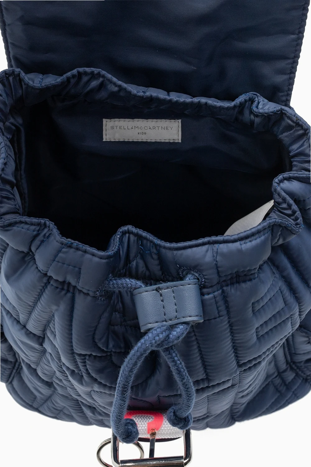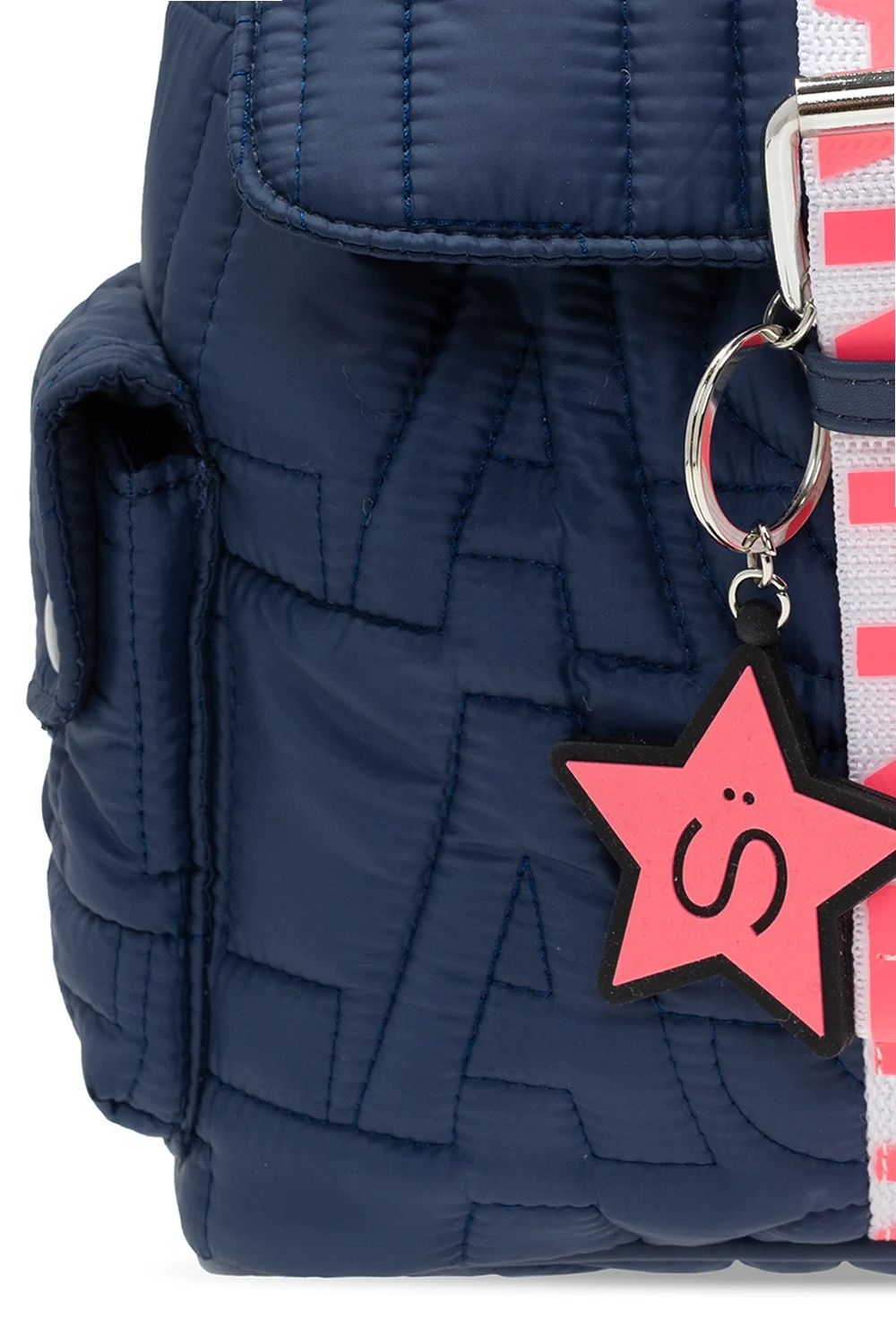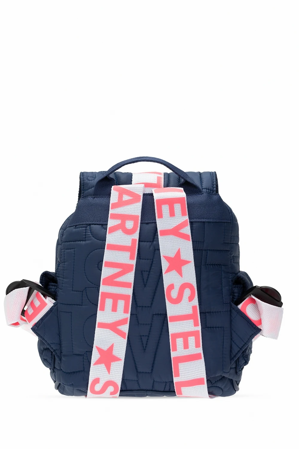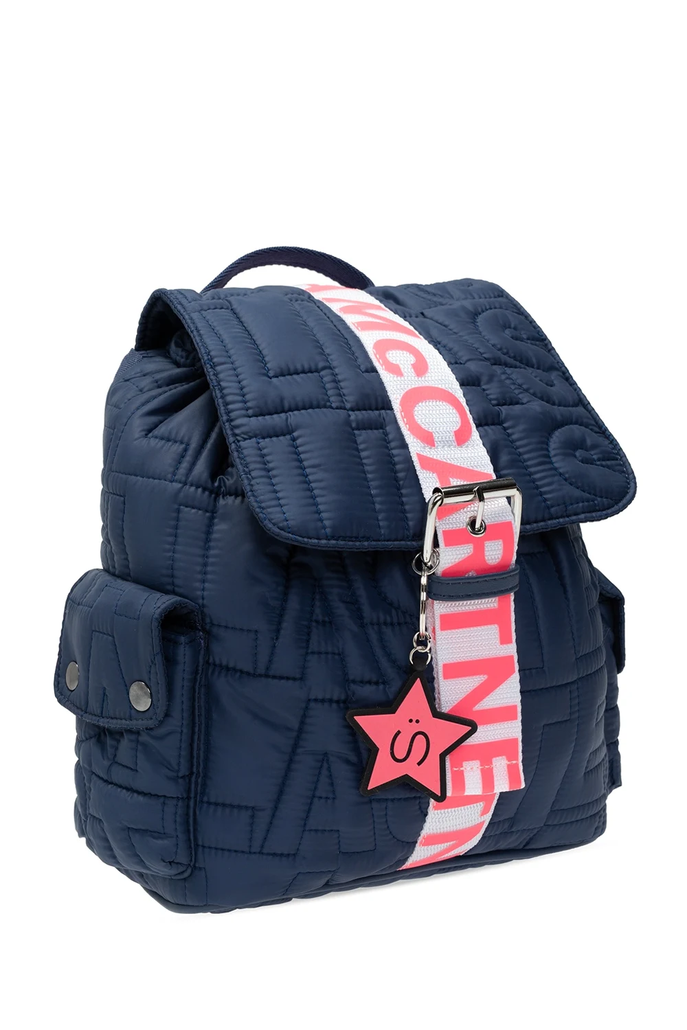 Navy quilted backpack from Stella McCartney Kids. Fastened with drawstrings, this design features a white buckle strap with a charm, printed pattern in neon pink, two snap-fastened flap pockets on the sides, half-round handle, adjustable shoulder straps and one internal compartment.
