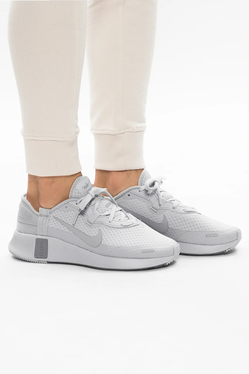 Light grey ‘Reposto’ sneakers from Nike. Set on a grey rubber sole, this model is complete with a swoosh logo patch on the side, a foam midsole and silver-tone reflective inserts.