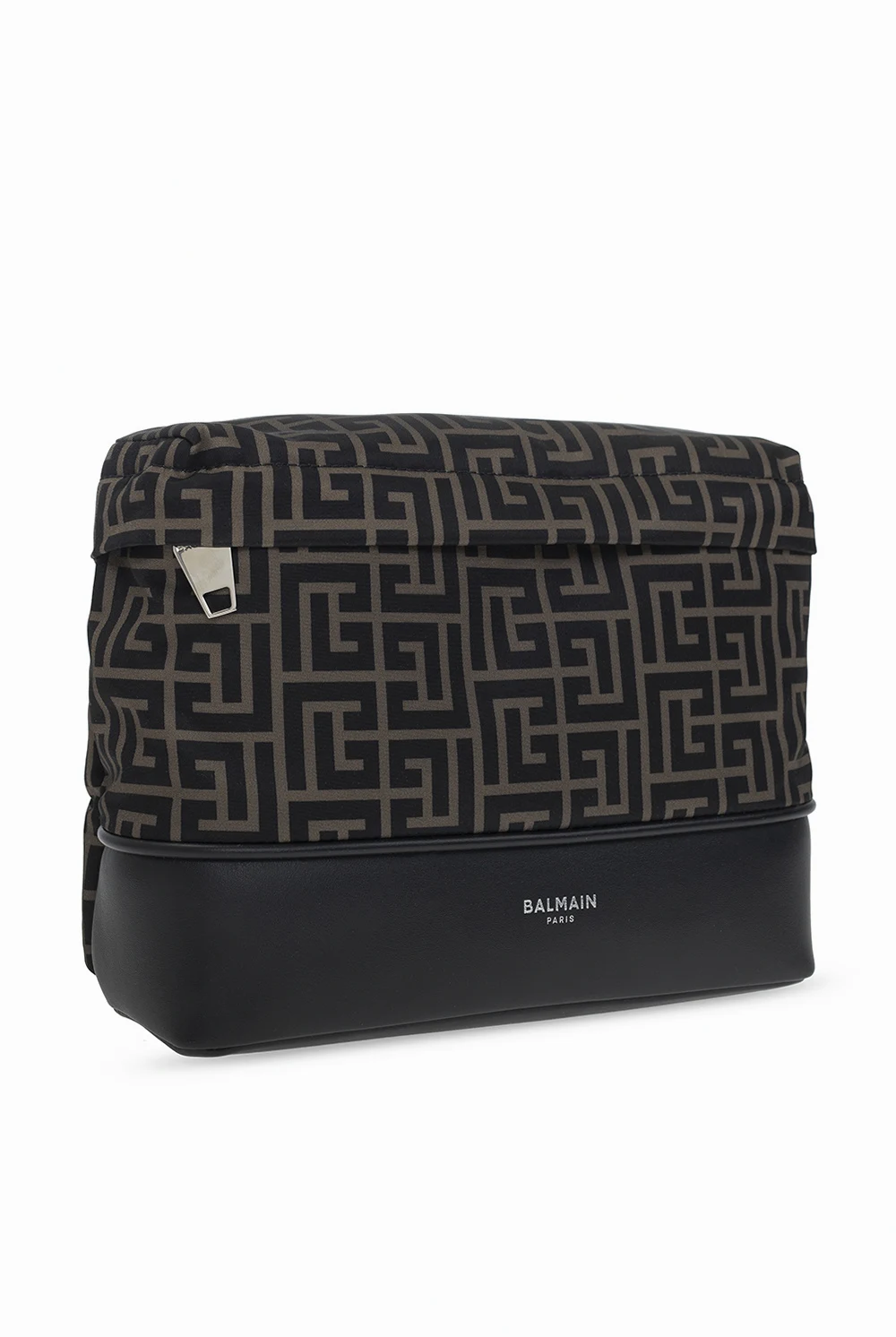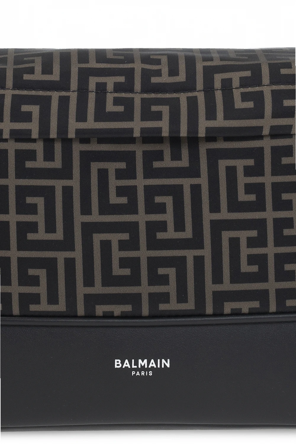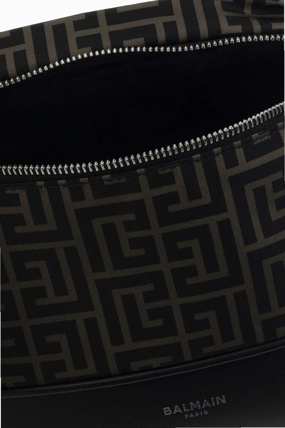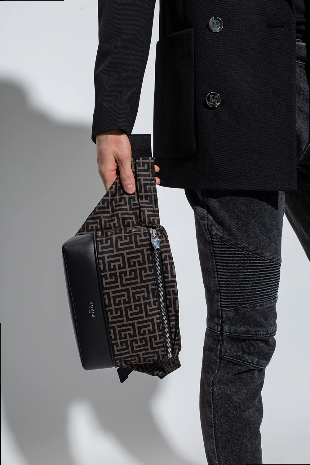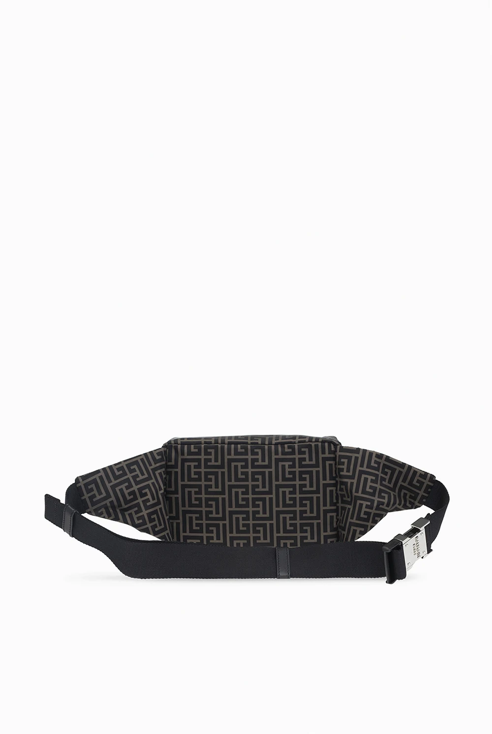 Black and brown belt bag from Balmain. Crafted from fabric enriched by a tonal monogram pattern, this design features a zip fastening, leather trims, a silver-tone logo print on the front, two side zipped pockets, an adjustable strap with a silver-tone buckle with a logo and one internal compartment with a card slot.