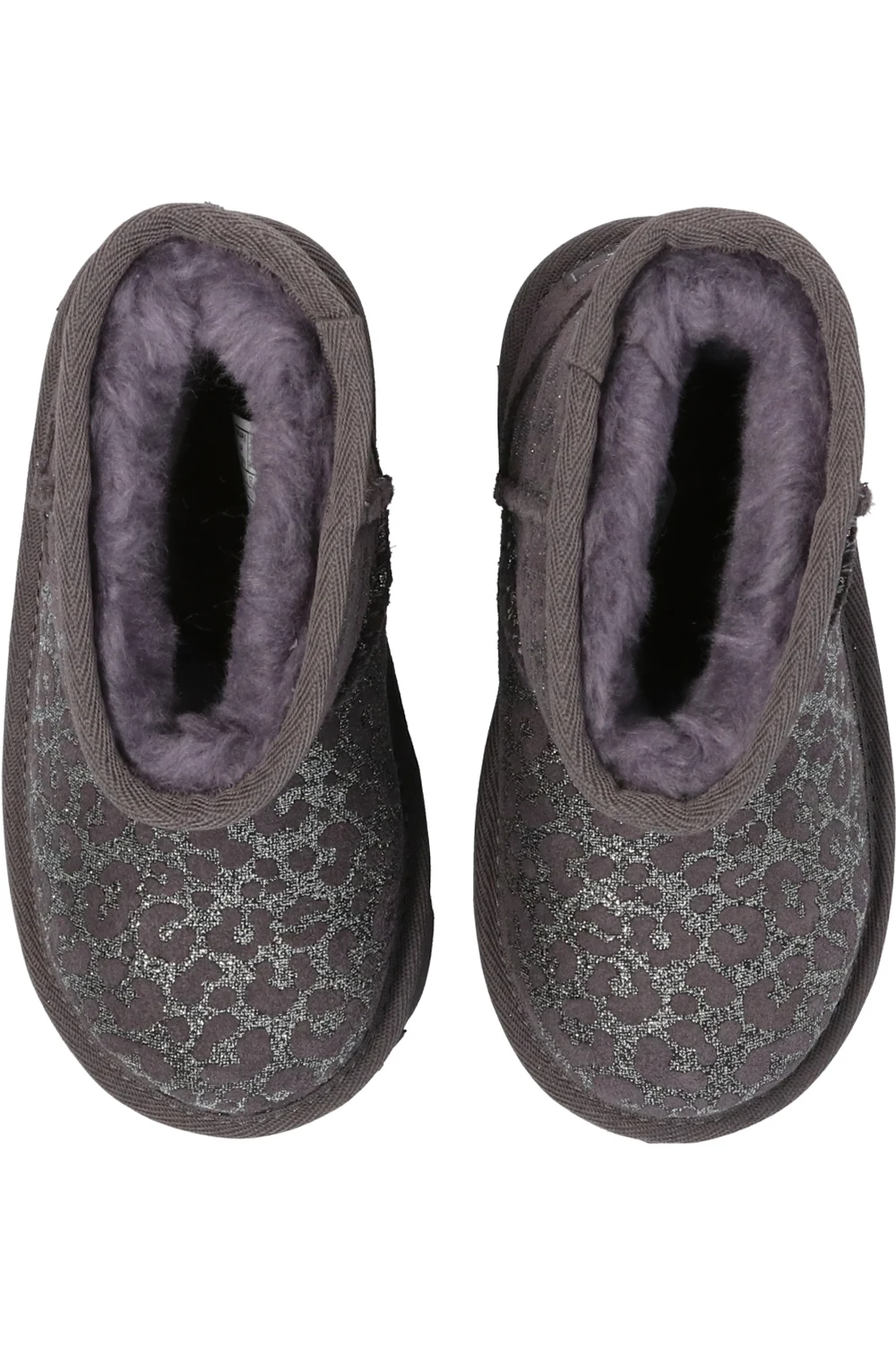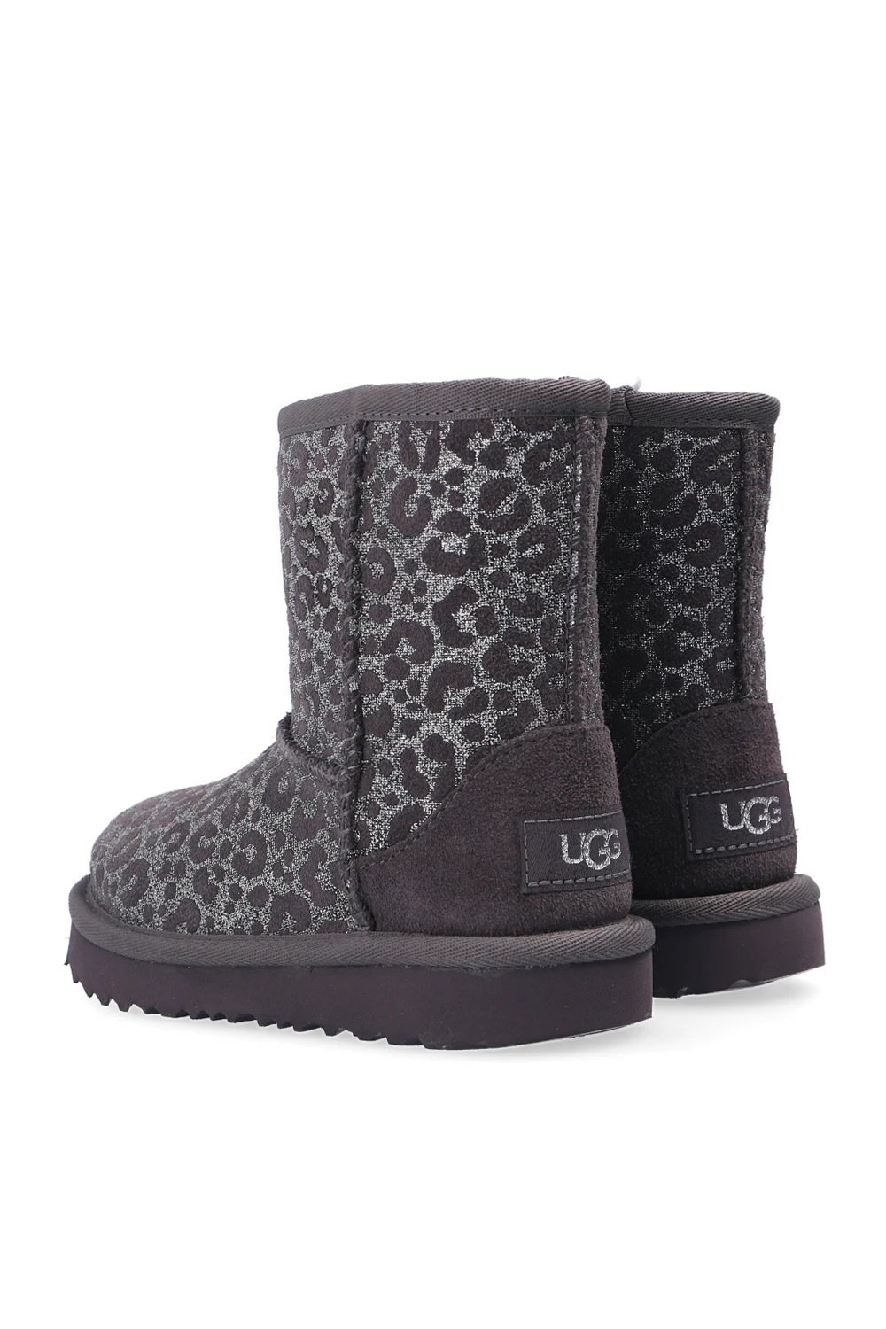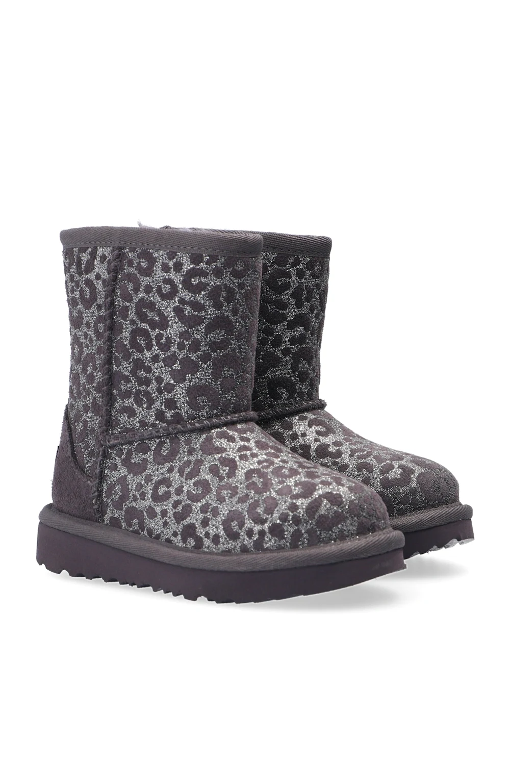Grey ‘T-Classic II Glitter Leopard’ snow boots from UGG Kids. Crafted from suede and lined with sheep wool, this model is complete with stitching details, a leopard print, silver-tone glitter, a logo appliqué sewn on at the heel and a textured EVA sole in dark grey.