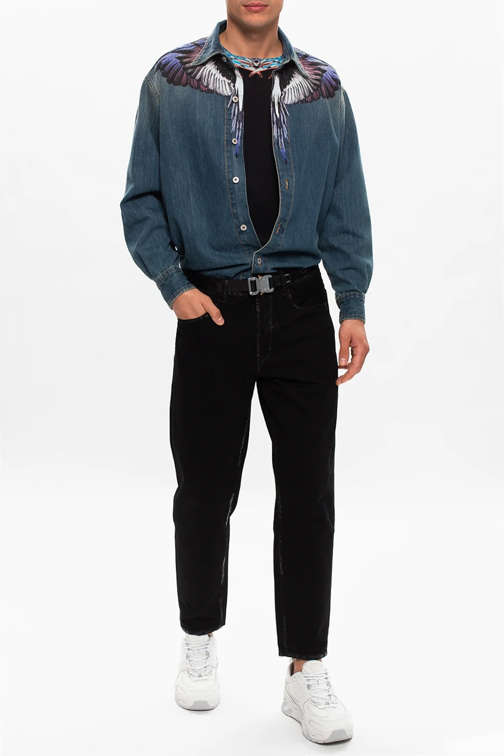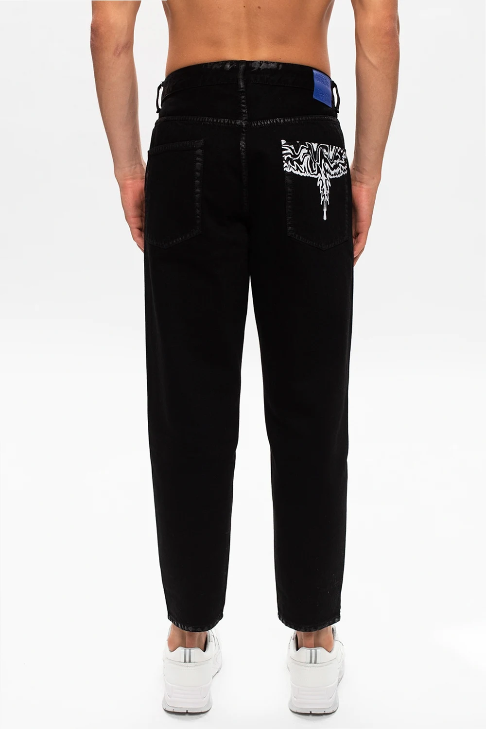 Black jeans from Marcelo Burlon. Falling down with legs that taper towards the ankles, this 5-pocket design fastens via buttons and is complete with a blue logo patch and a white graphic print.
