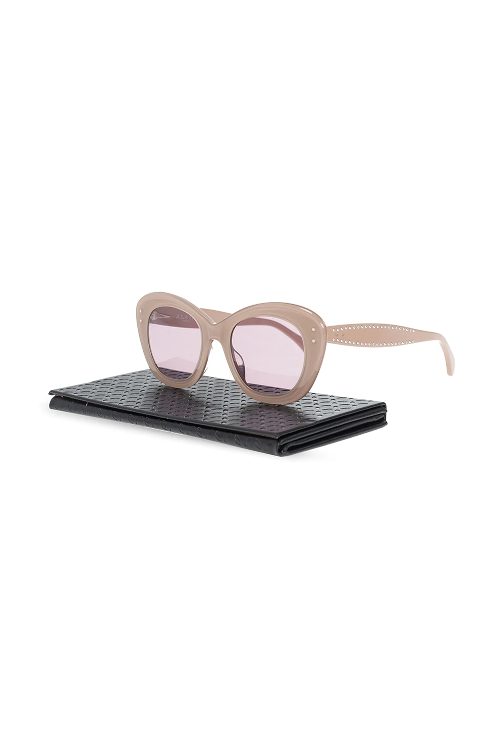 Beige sunglasses from Alaia. Arriving with a case and cleaning cloth included, this model features silver-tone studs on the temples and purple lenses.