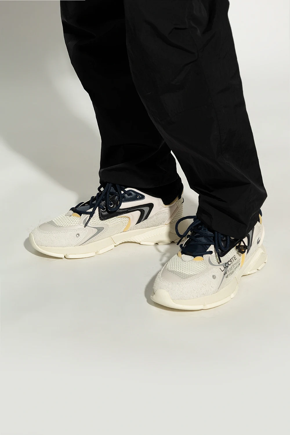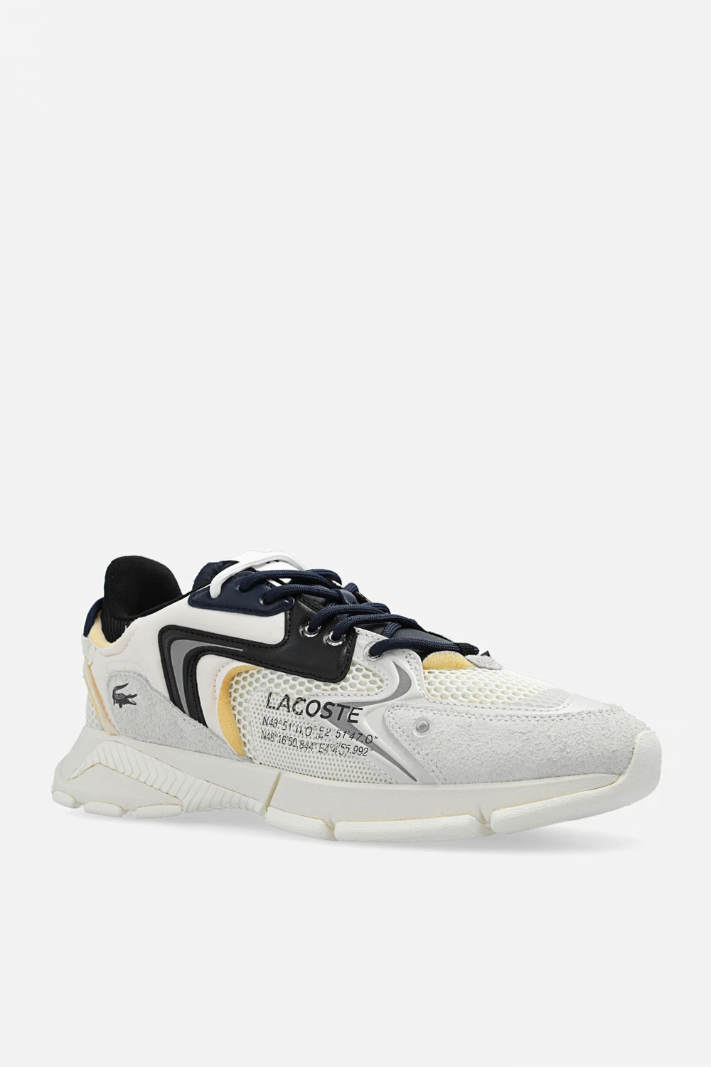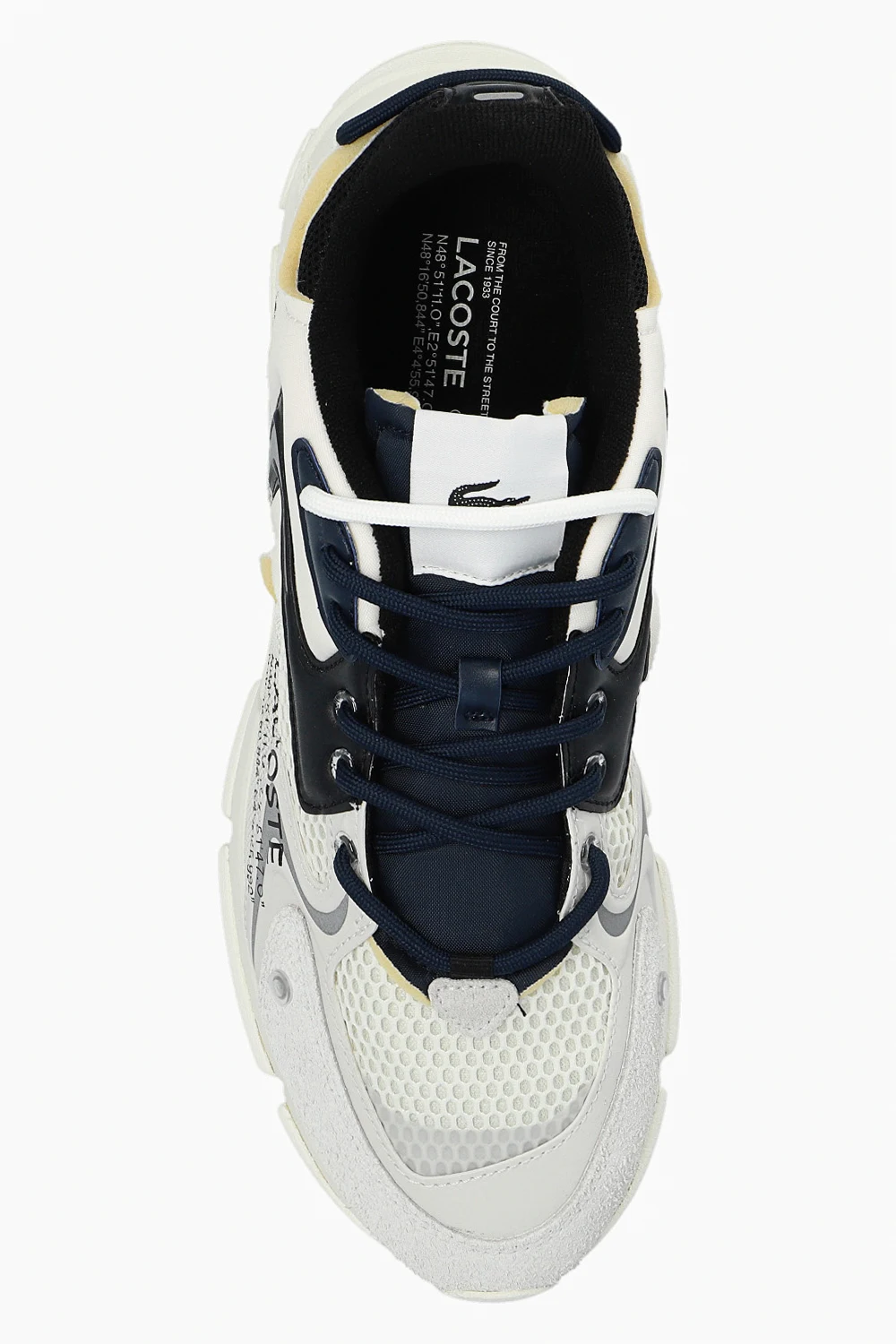 Cream, black and navy 'L003 Neo' sneakers from Lacoste. Made of leather and mesh, this lace-up pair features a logo print, reflective elements, raw cut edges and black rubber sole.