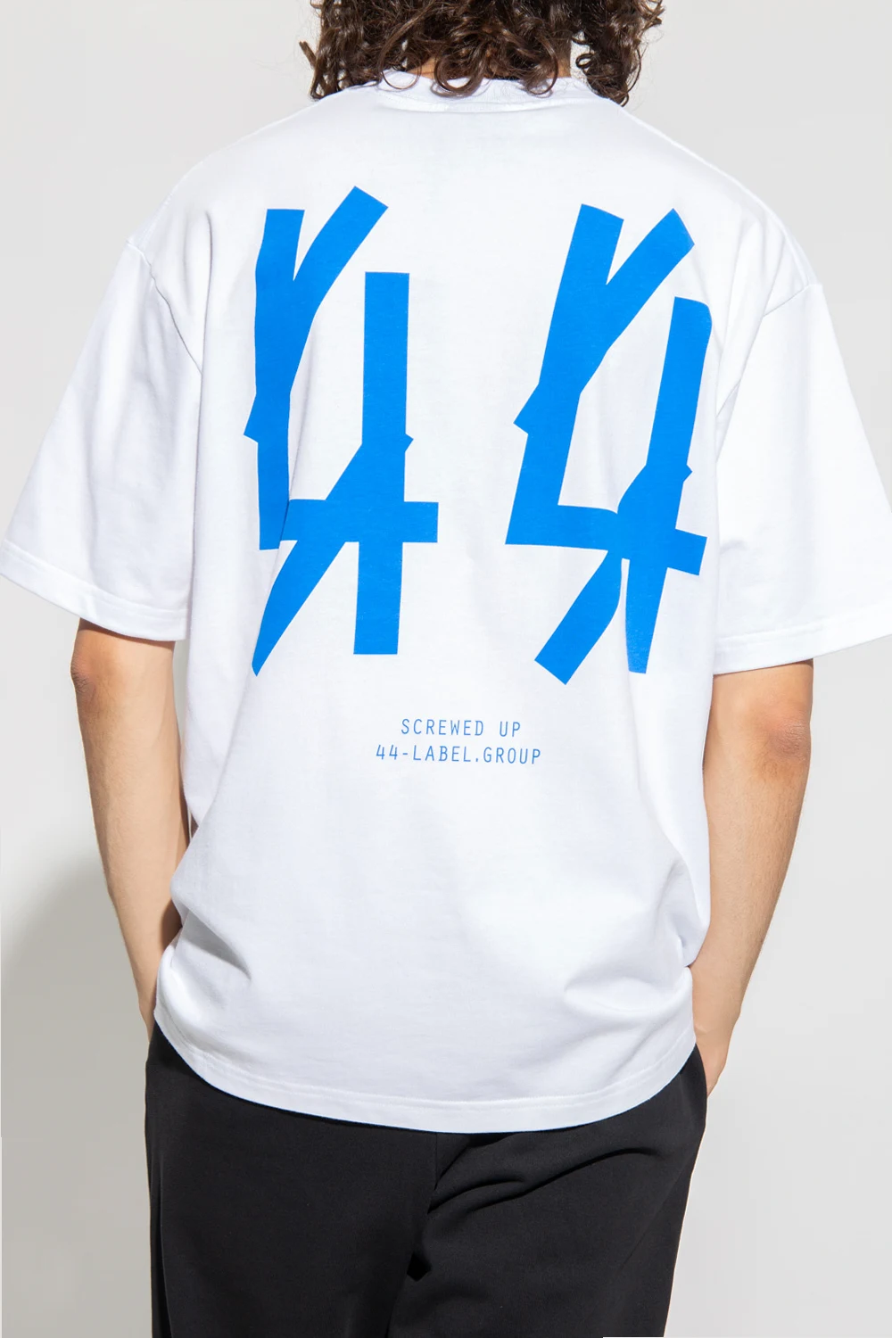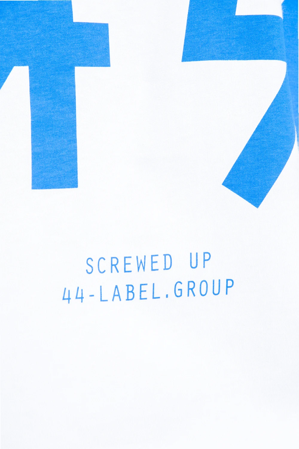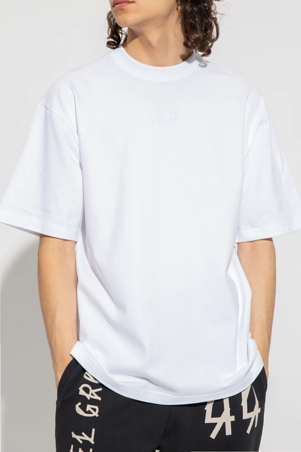 White T-shirt from 44 Label Group. Made of cotton, this short sleeve design features a ribbed crew neck and an embroidered and printed logo pattern in white and blue.