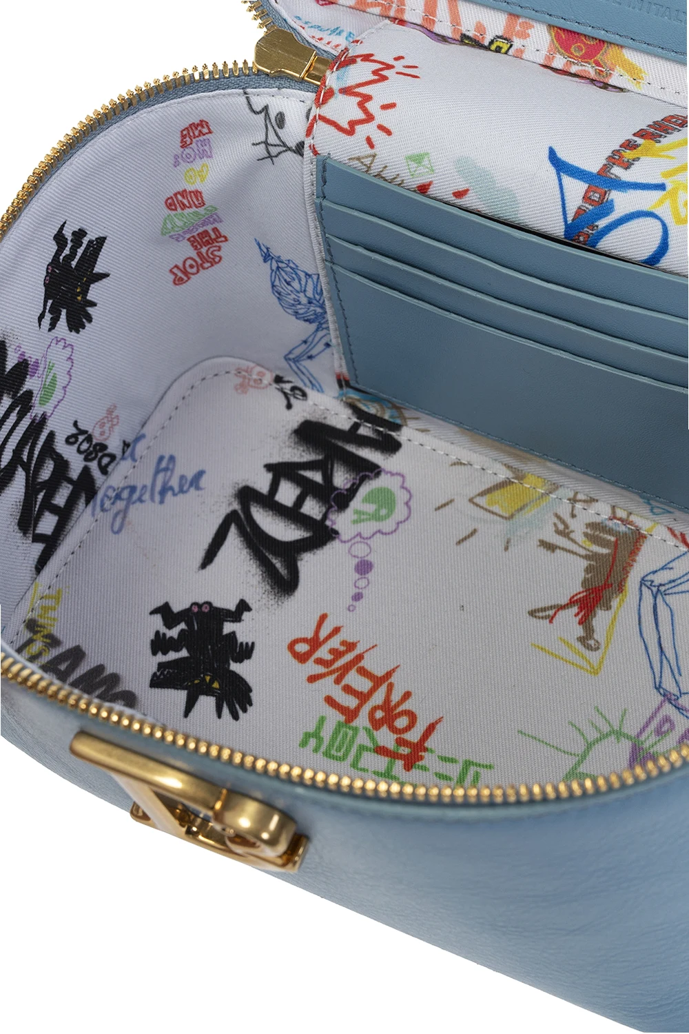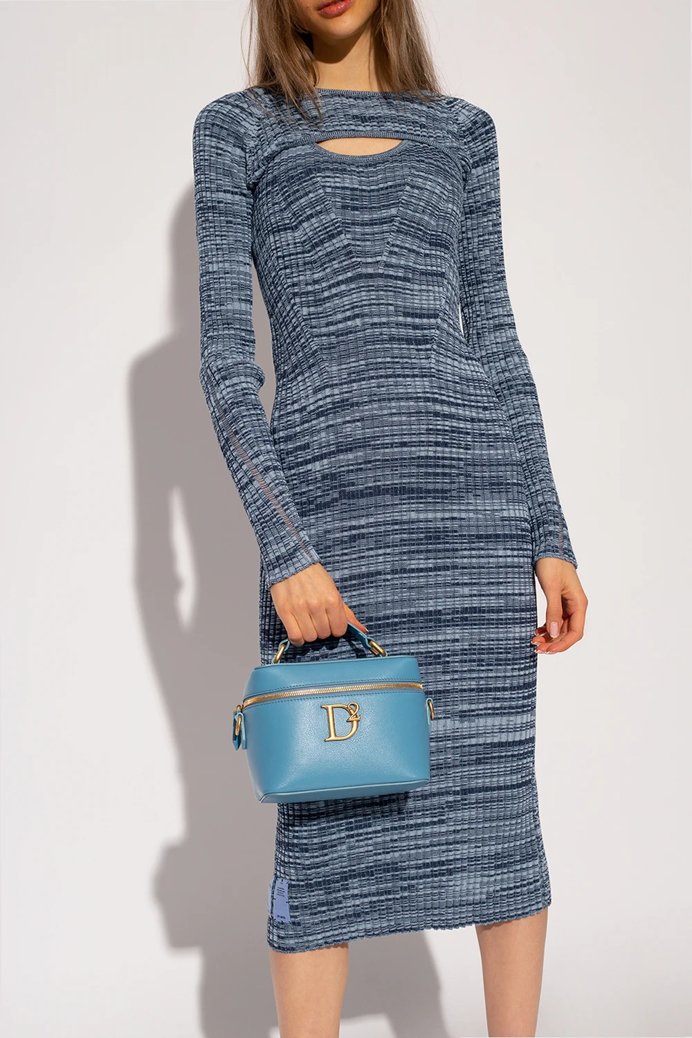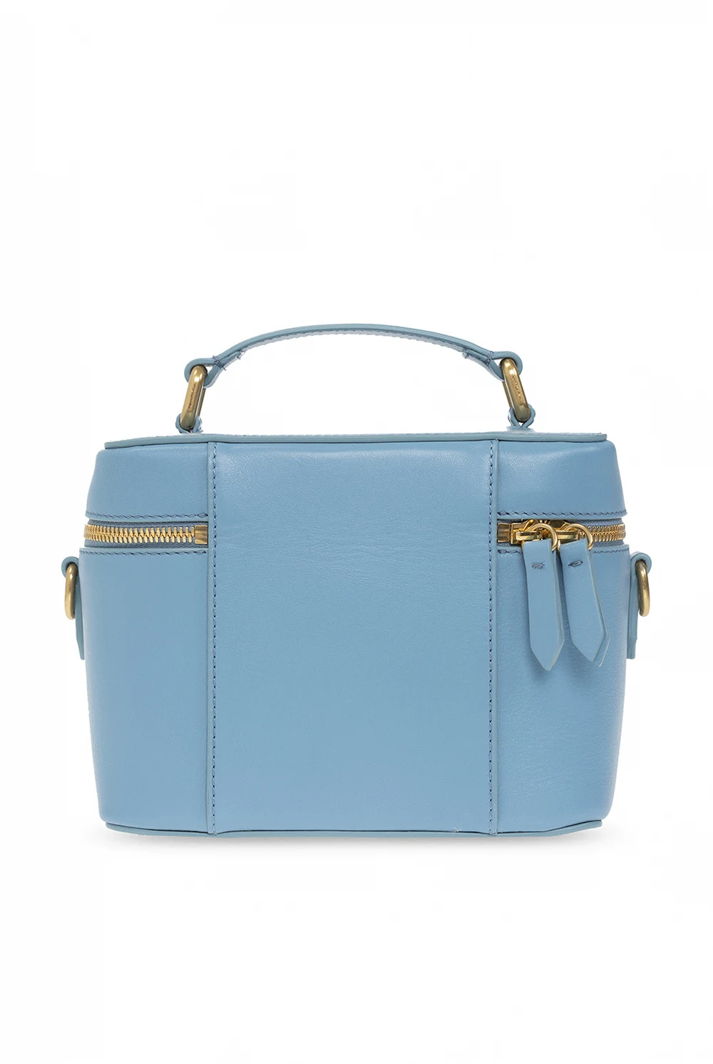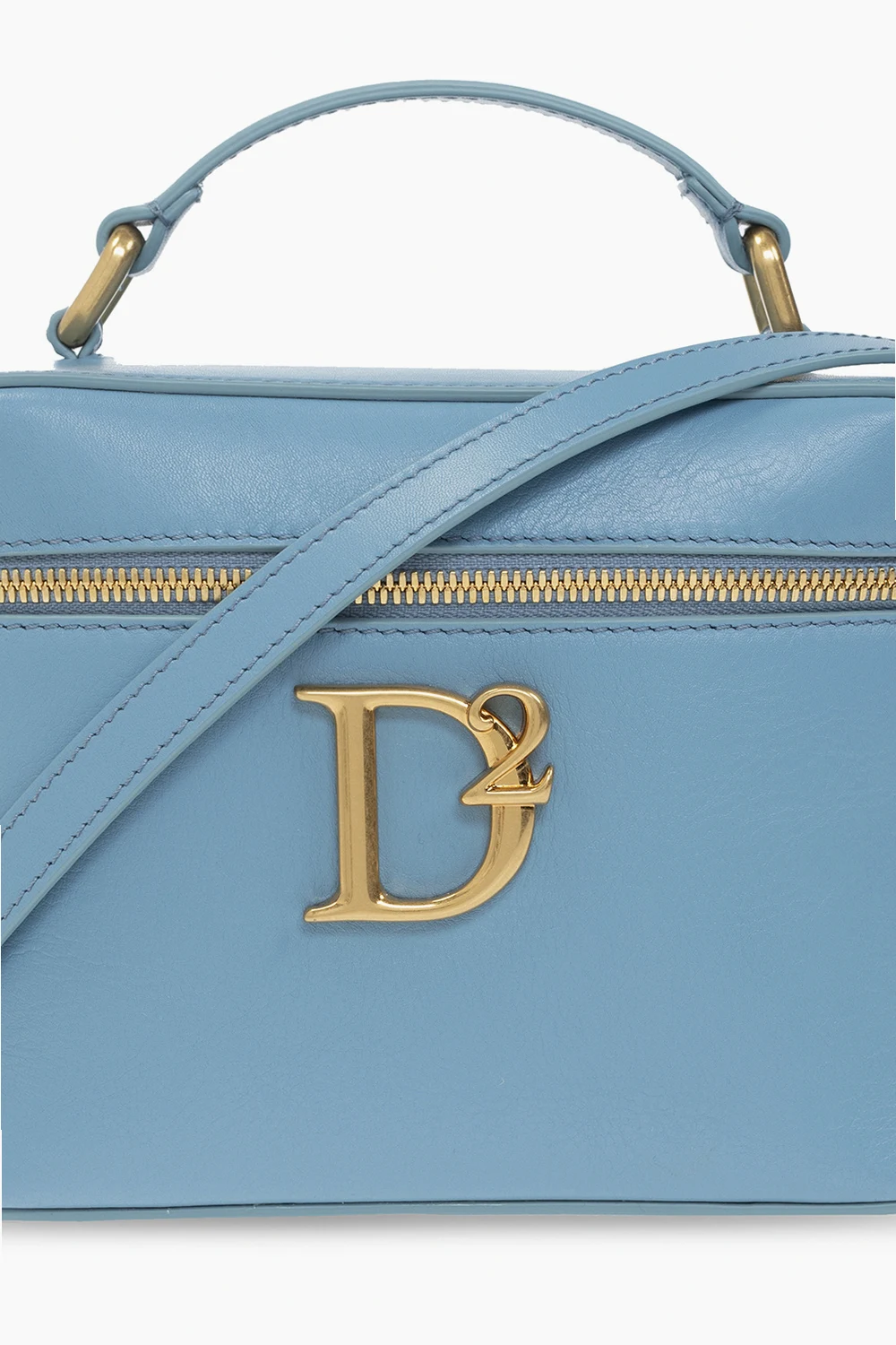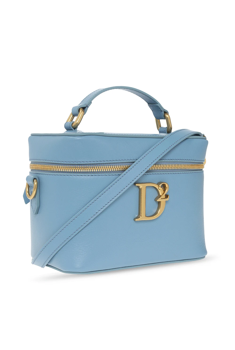 Light blue wash bag from Dsquared2. Made of calf leather, this model features a two-way zip, logo appliqué, half-round handle, detachable and adjustable strap, gold-tone metal hardware and one internal compartment with three card slots and a mirror.