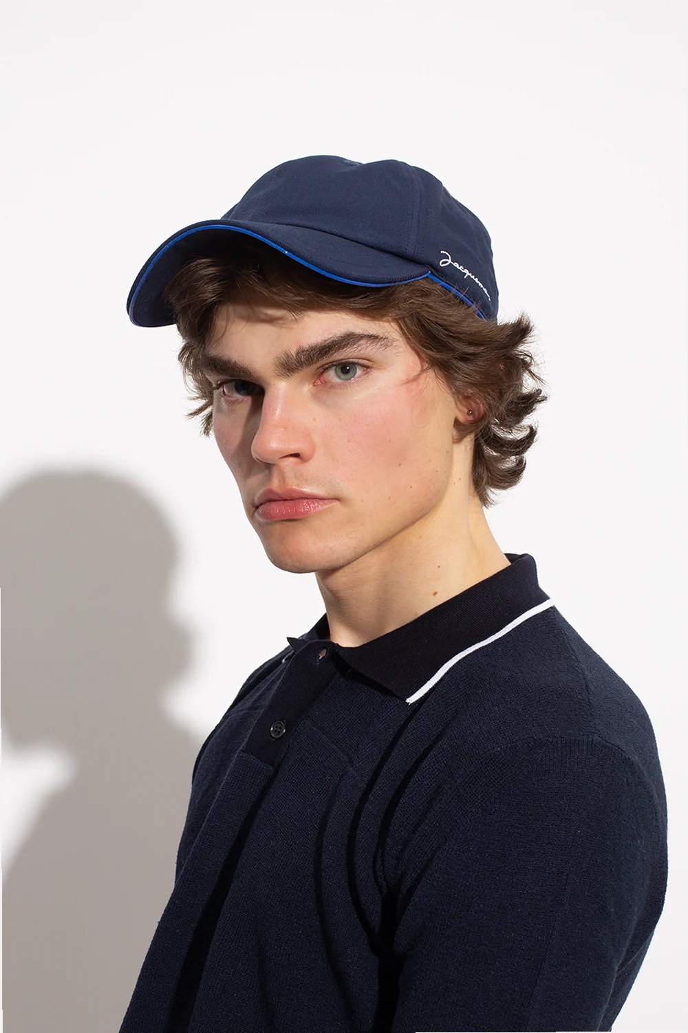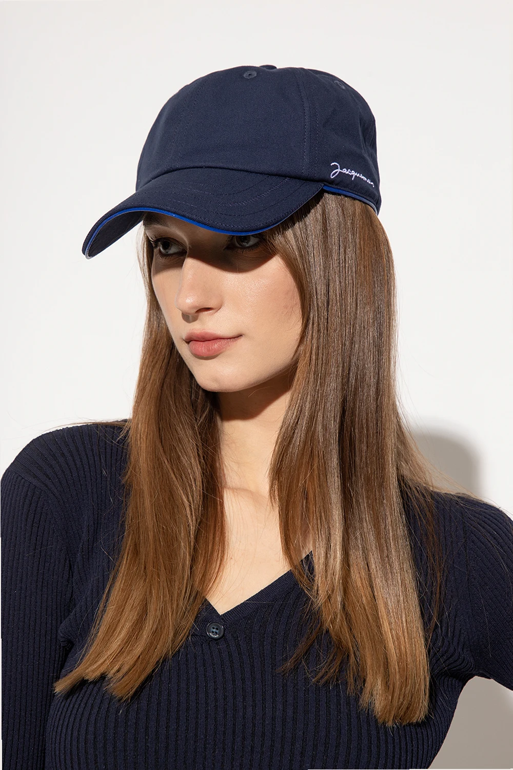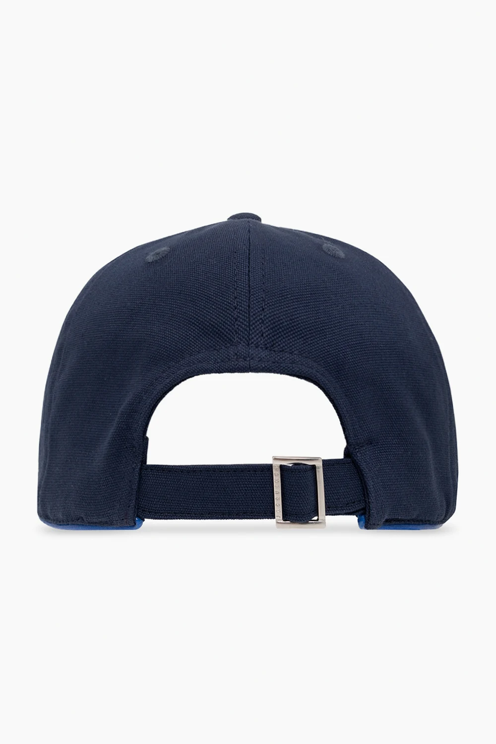 Navy blue ‘Bricolo’ baseball cap from Jacquemus. Crafted from cotton canvas, this item features an embroidered cream logo, dark blue rubberised binding and a back adjuster.