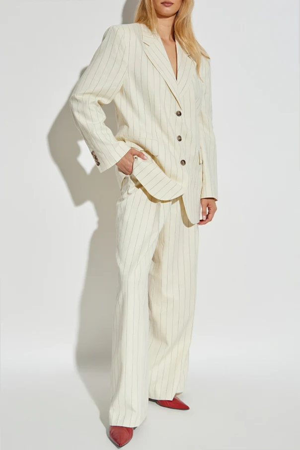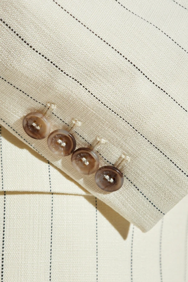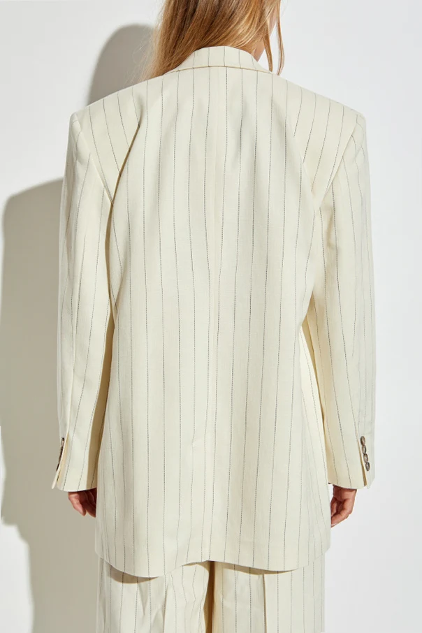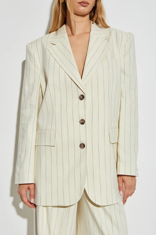 Blazer „Sara” von Anine Bing ist ein Ausdruck großzügiger Eleganz, bei dem skandinavische Schlichtheit auf den energiegeladenen Geist moderner Metropolen trifft. Der cremefarbene Ton, durchbrochen von dezenten, vertikalen Streifen in Kontrastfarbe, verleiht dem Ganzen Raffinesse und einen unverwechselbaren Charakter. Die leicht oversized geschnittene Passform mit betonten Schultern unterstreicht die Silhouette, während die über die Hüften reichende Länge und die klassischen, breiten Revers eine Hommage an die Tradition in moderner Ausführung darstellen.