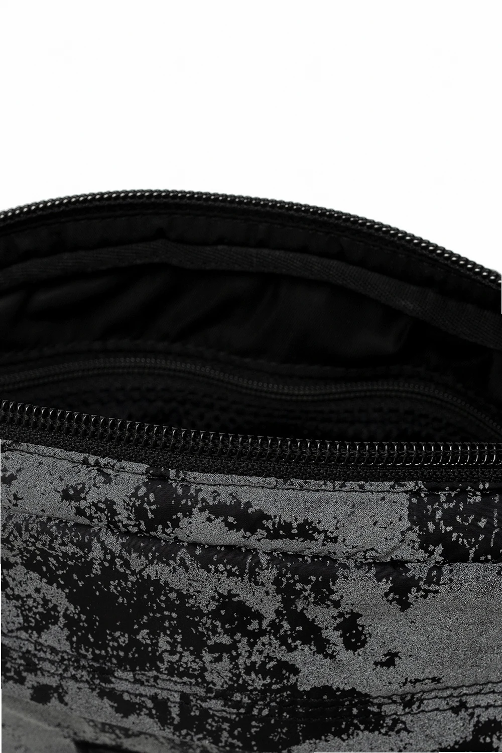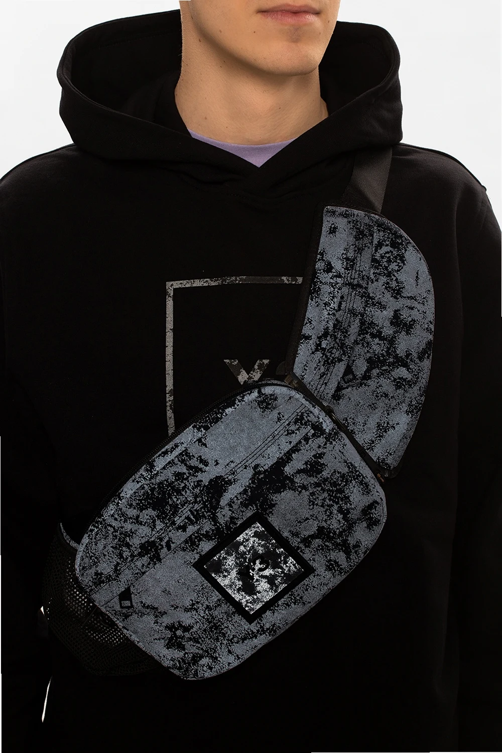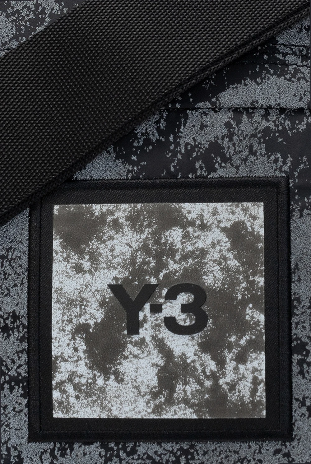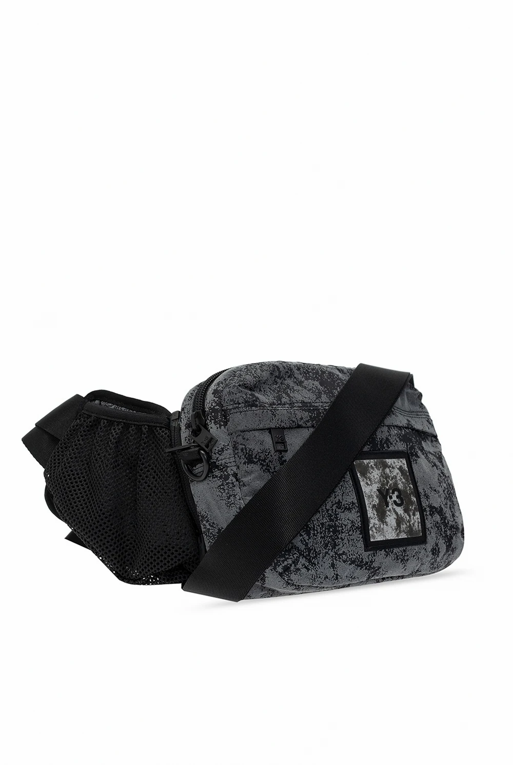 Black and grey belt bag with pockets from Y-3 Yohji Yamamoto. Fastened with a zip, this design features a reflective effect, logo patch, two detachable and adjustable straps. Can also be worn as a shoulder bag.