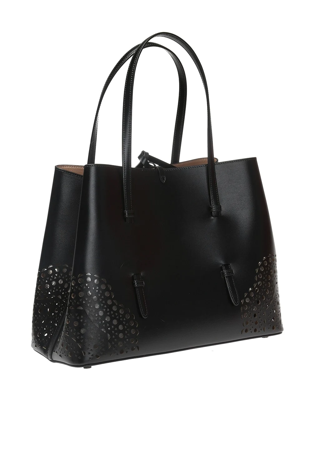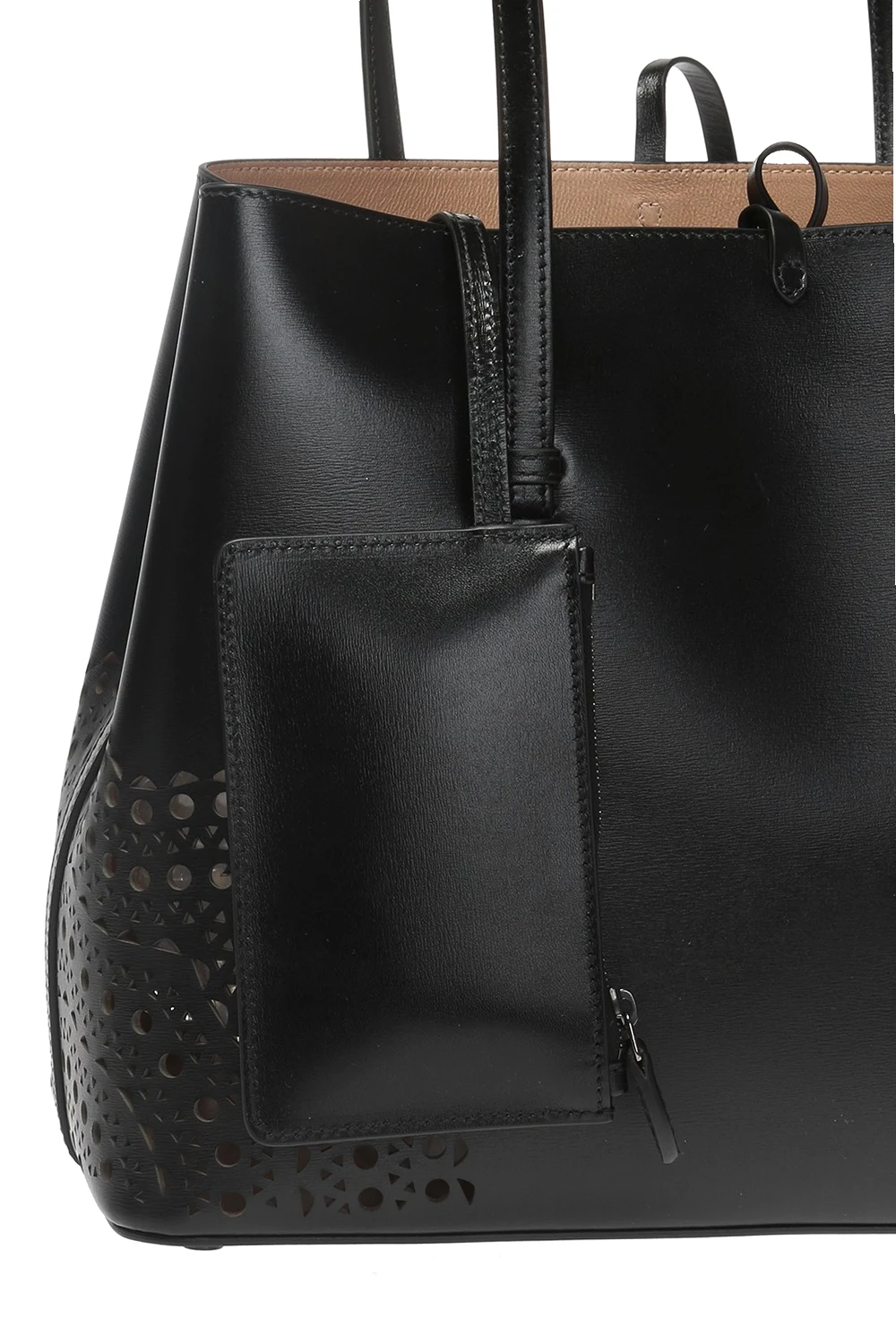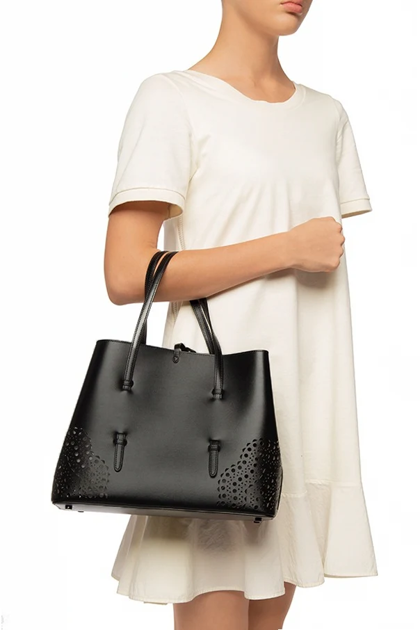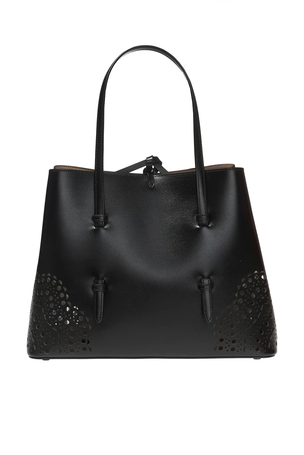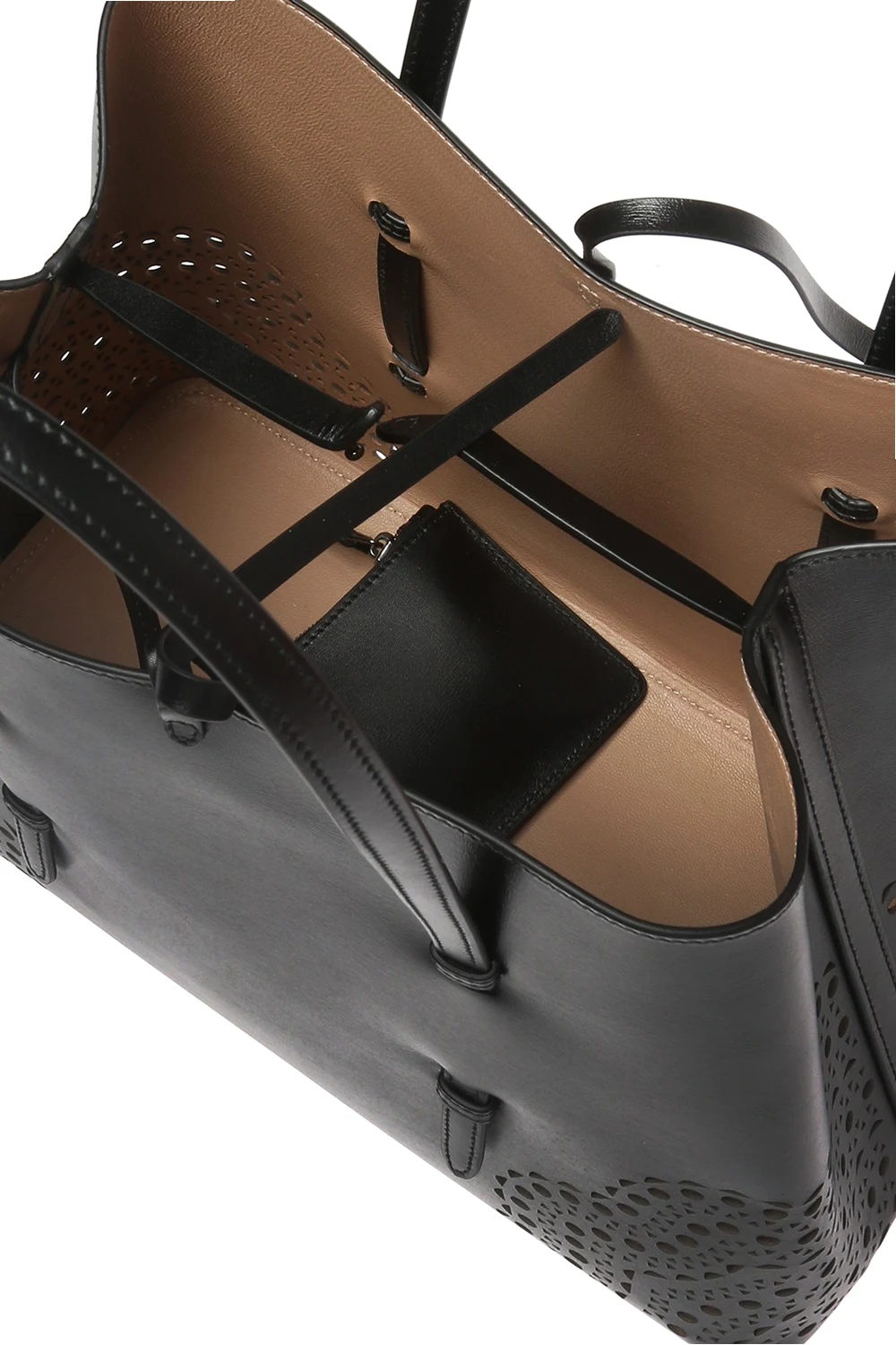 Black 'Mina' handbag from Alaa. Made of leather. Fastened with a hook and drawstrings. Decorated with perforations. Two half-round handles. Beige lining. One compartment inside including a short strap with a zippered sachet.