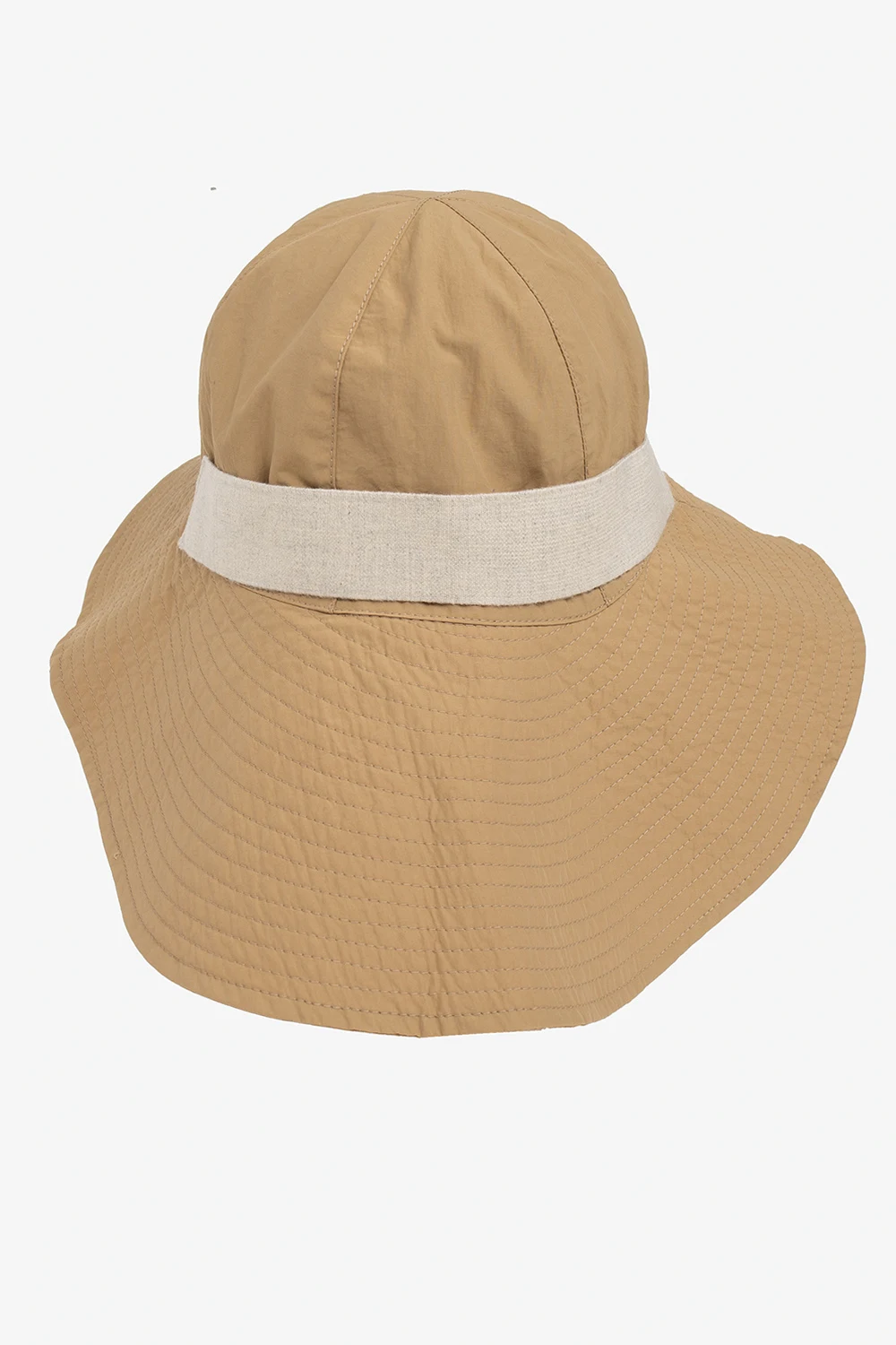 Beige ‘Pescadou’ bucket hat from Jacquemus. Embroidered at front with a white logo, this item features a prolonged back hem with a decorative cream strap.