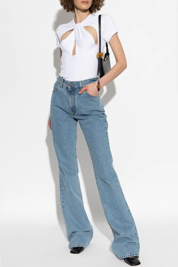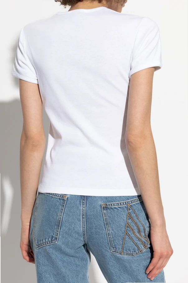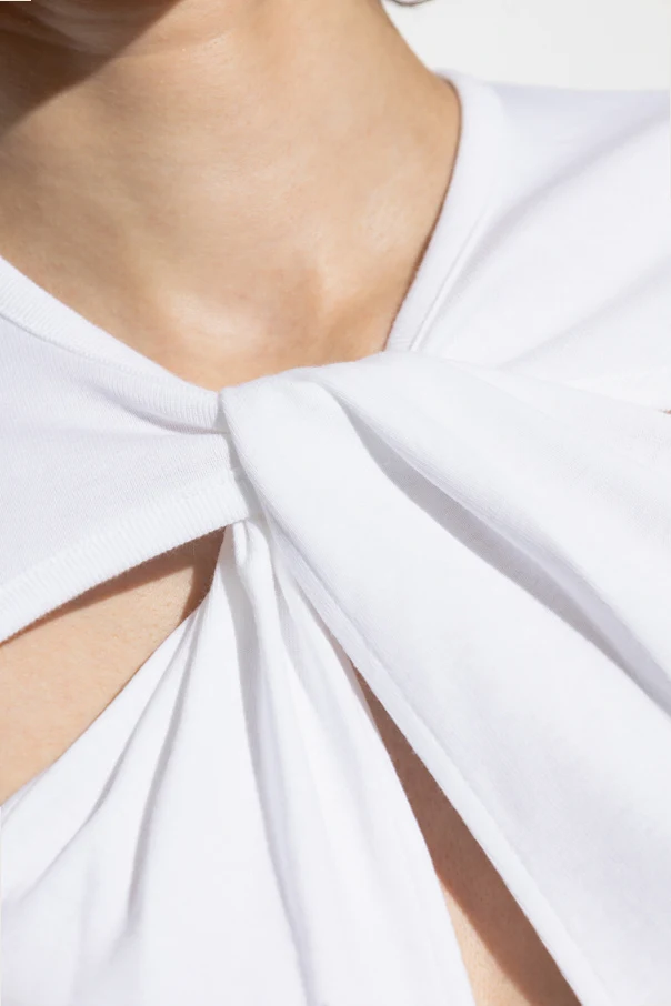 T-Shirt mit dekorativen Cut-outs der Marke Coperni ist ein hervorragendes Beispiel für die Verbindung moderner Ästhetik mit Schneiderkunst. Der sorgfältig geschnittene Schnitt betont die Silhouette und setzt die Taille dezent in Szene. Charakteristische dekorative Cut-outs – zwei breite Bögen auf Brusthöhe und ein vertikales Detail am Ausschnitt – verleihen dem Shirt in Harmonie mit dem künstlerischen Drapieren des Stoffes einen futuristischen und architektonischen Akzent.