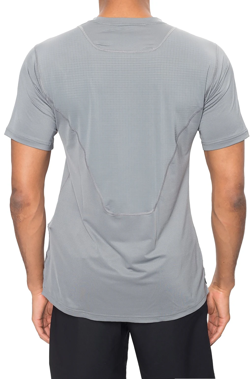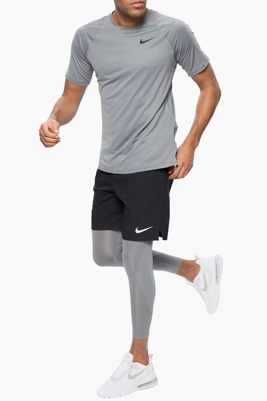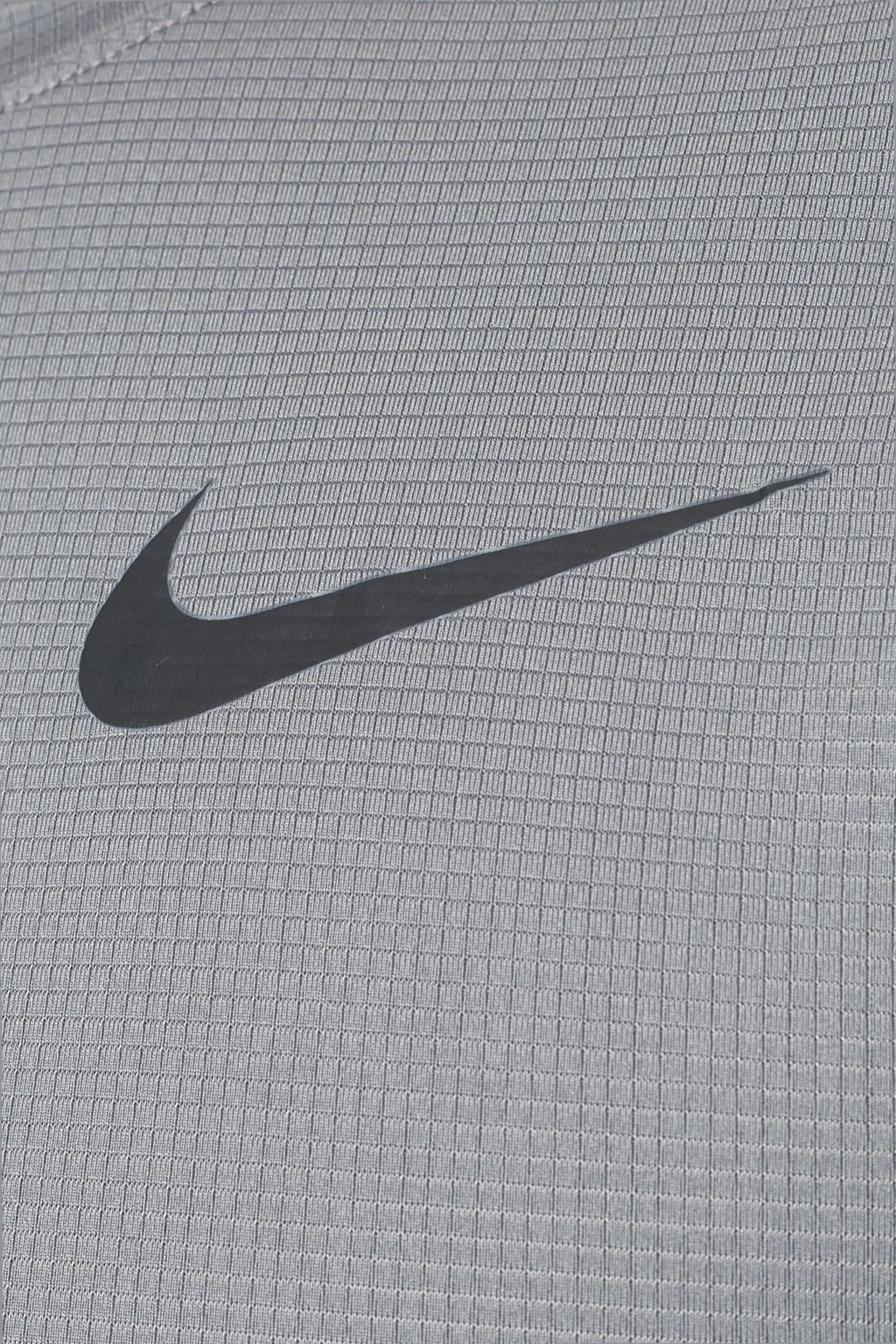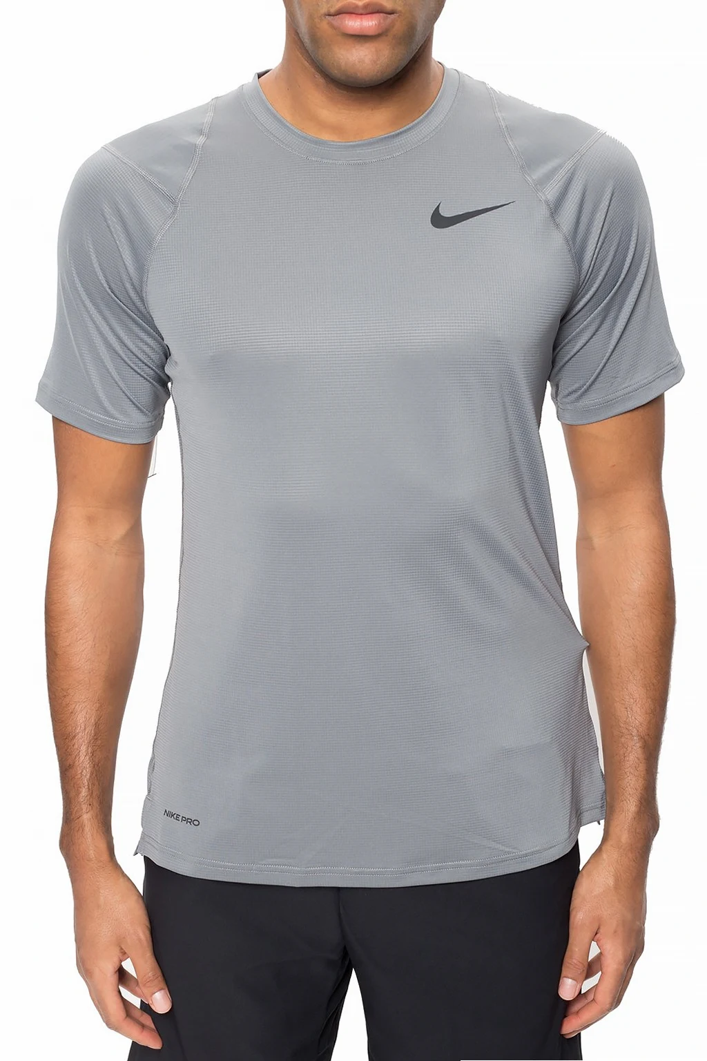 Grey performance T-shirt from Nike. Made of stretchy fabric with sweat-wicking Dri-FIT technology. Black logo print on the front.