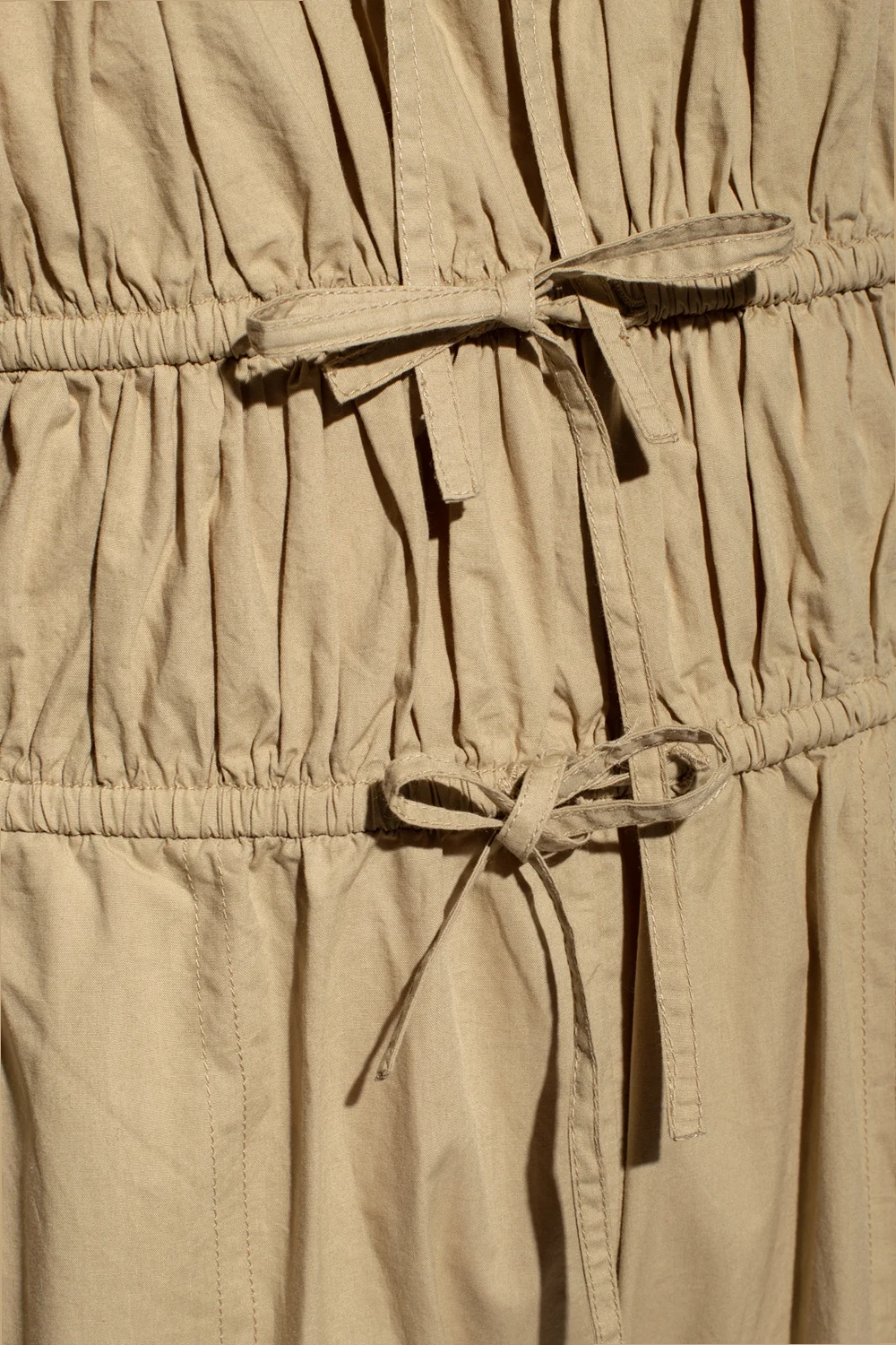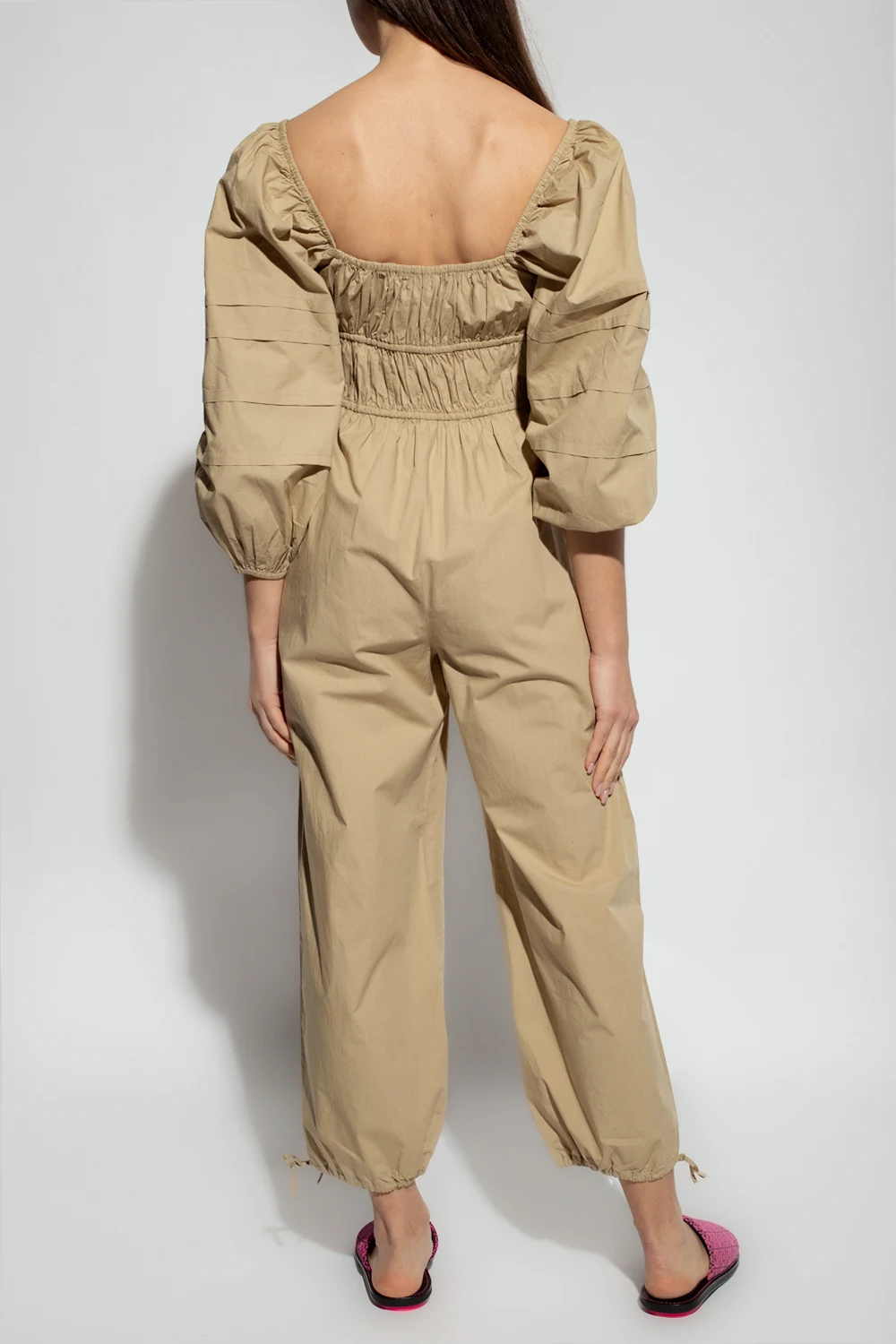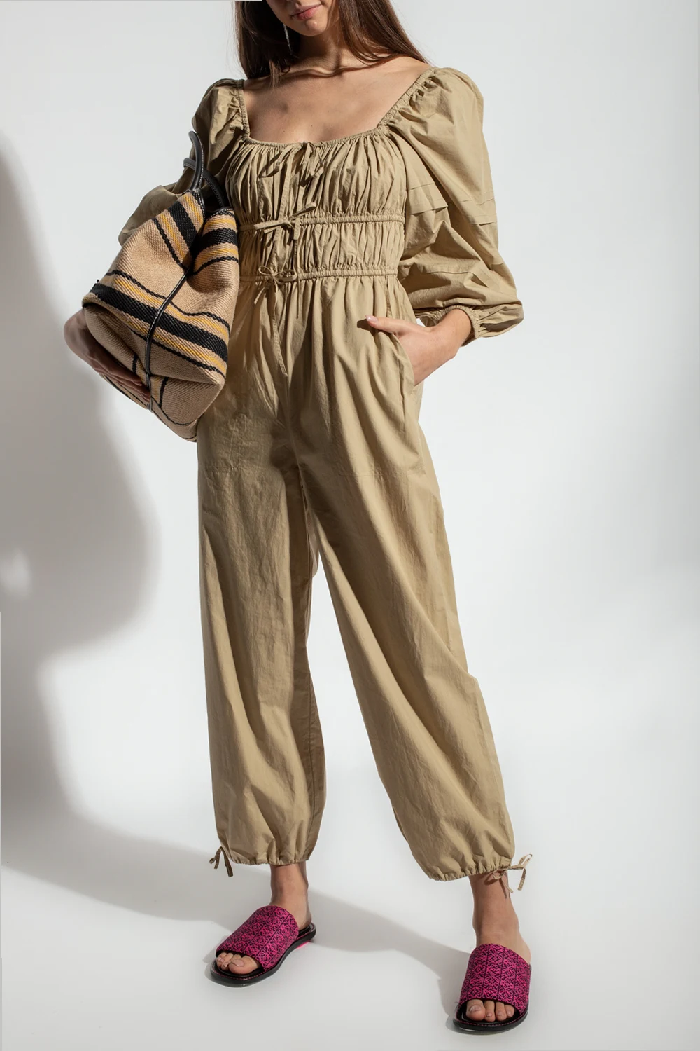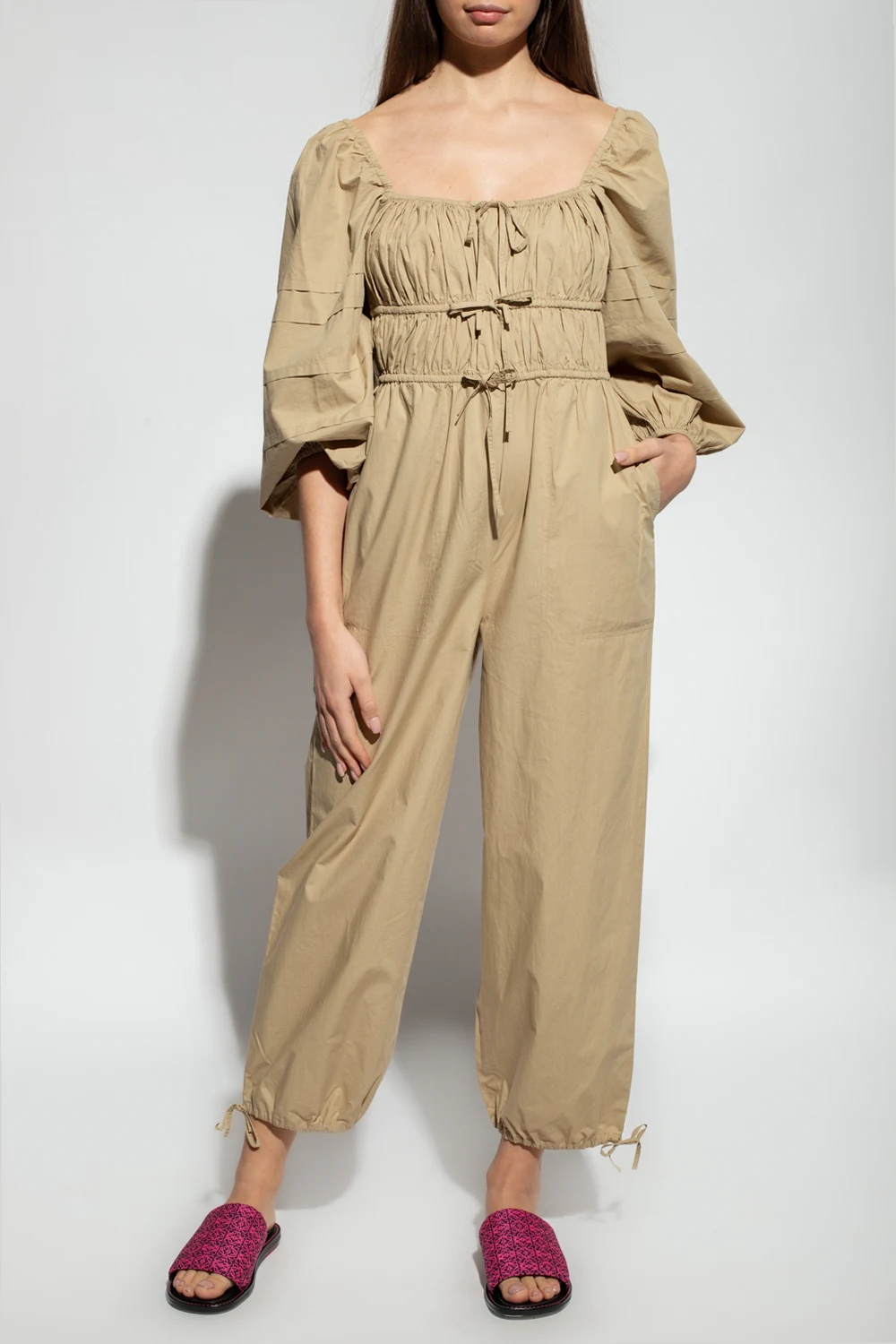 Beige ‘Amalie’ jumpsuit from Ulla Johnson. Made of cotton, this style features a square neckline, drawstring ties, decorative smocked details, two frontal pockets and cropped blouson sleeves,