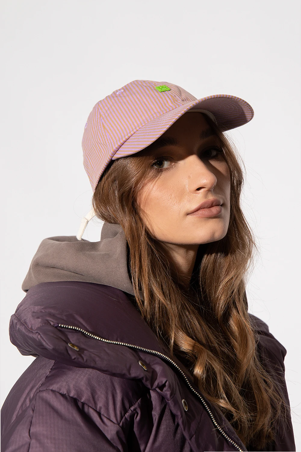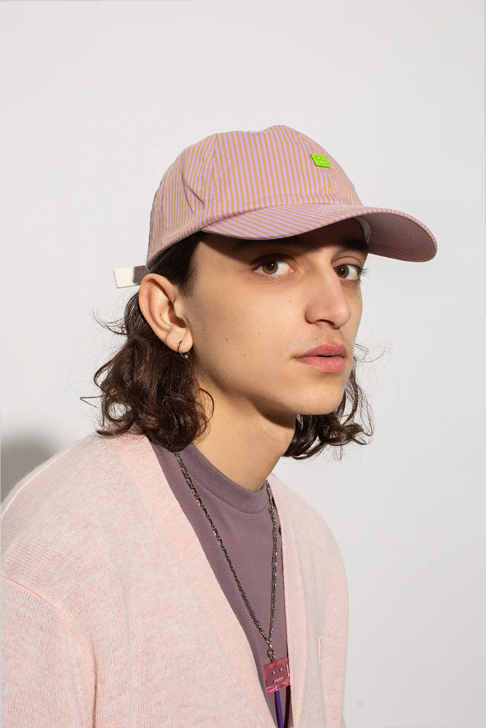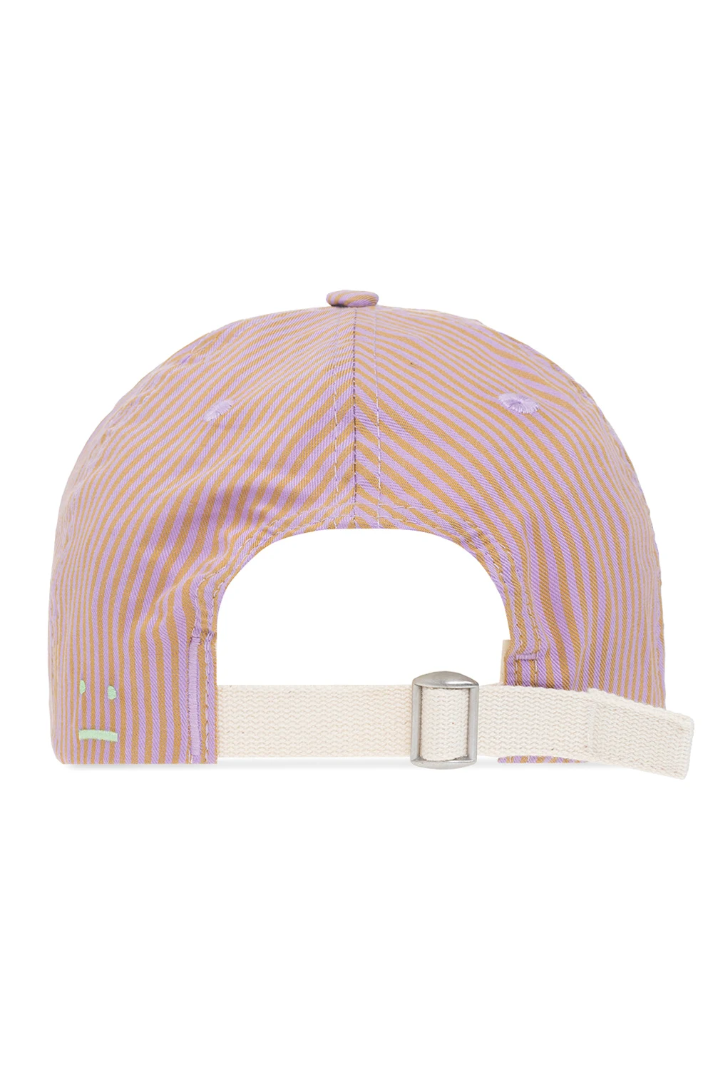 Pink and green baseball cap from Acne Studios. Crafted from cotton, this item features a green logo patch and a buckle strap adjuster at the back.