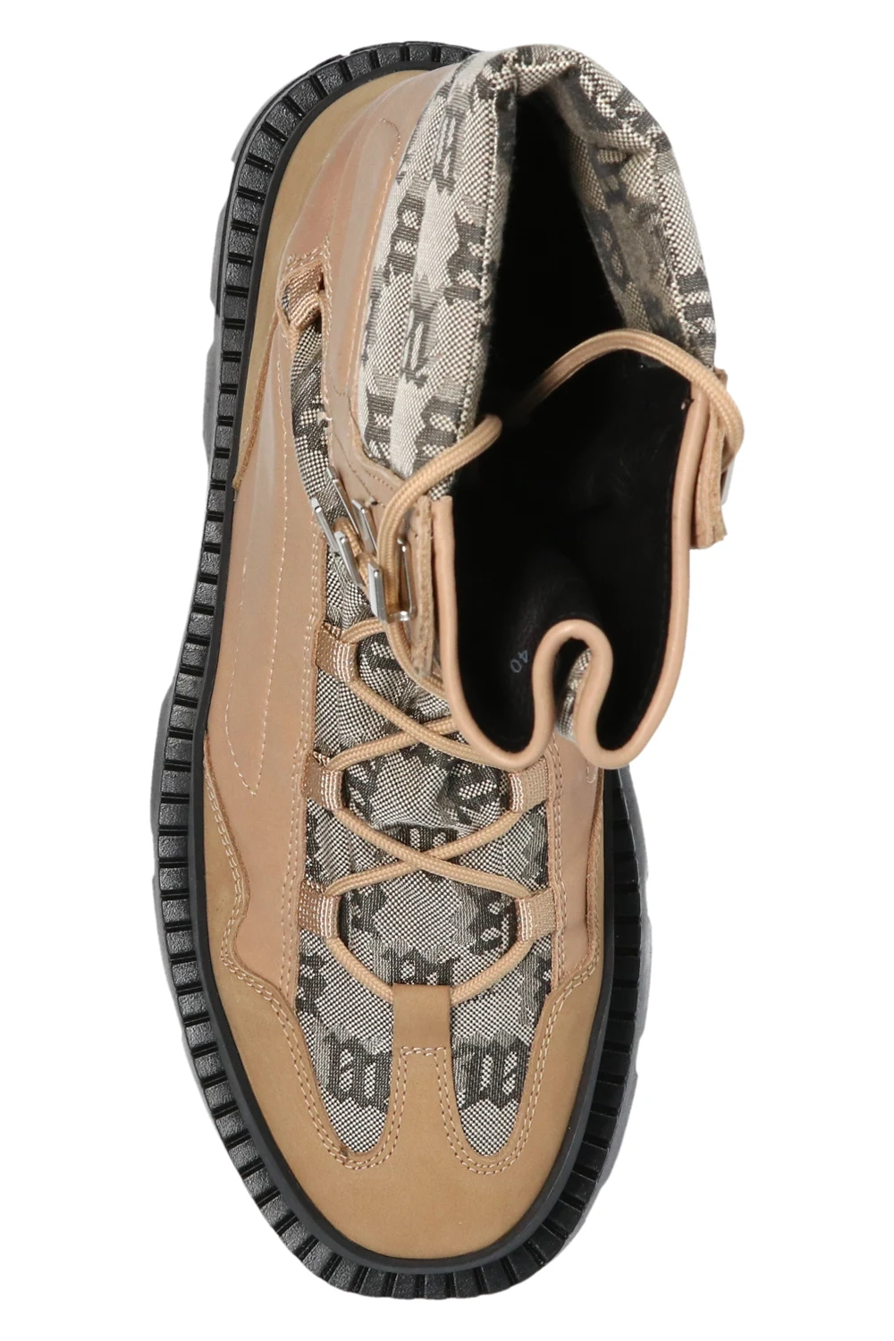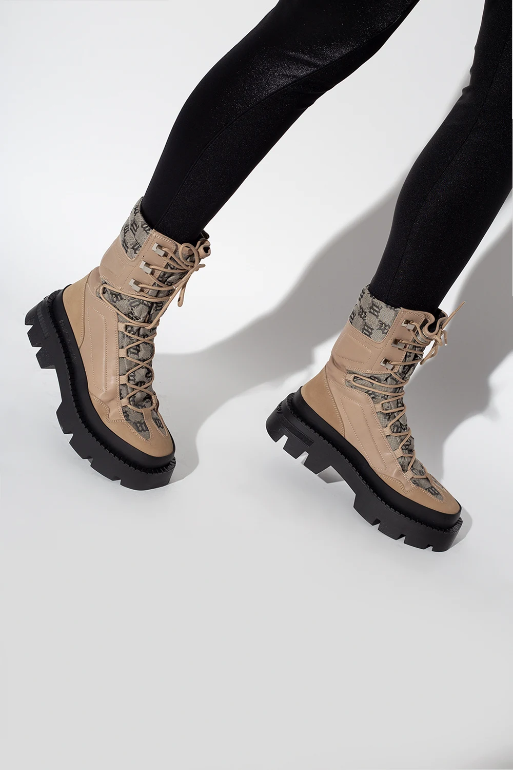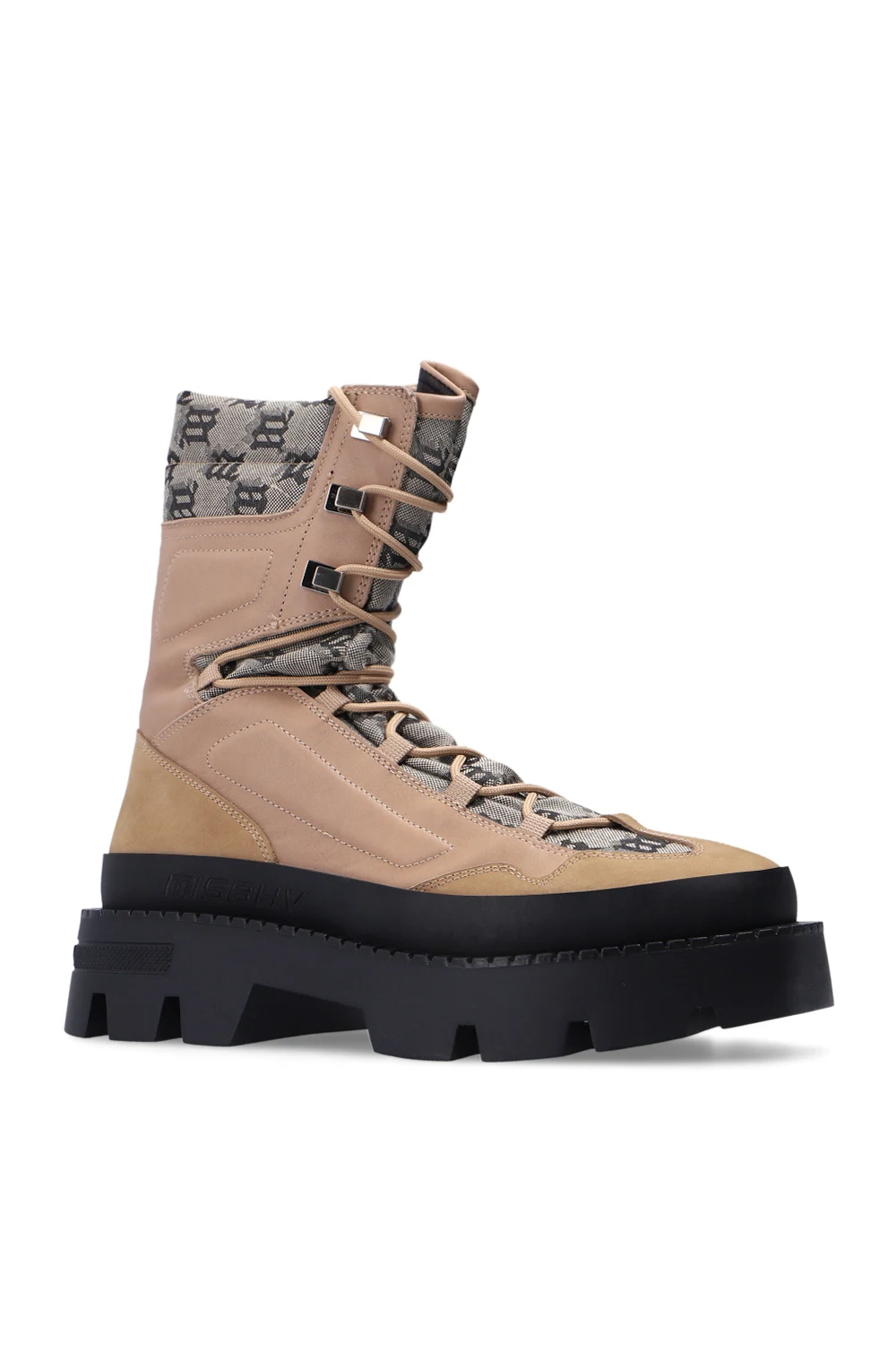 Beige and black ‘The Ibiza’ boots from MISBHV. Trimmed with leather, this lace-up pair features a monogram, embossed logo and black rubber sole.