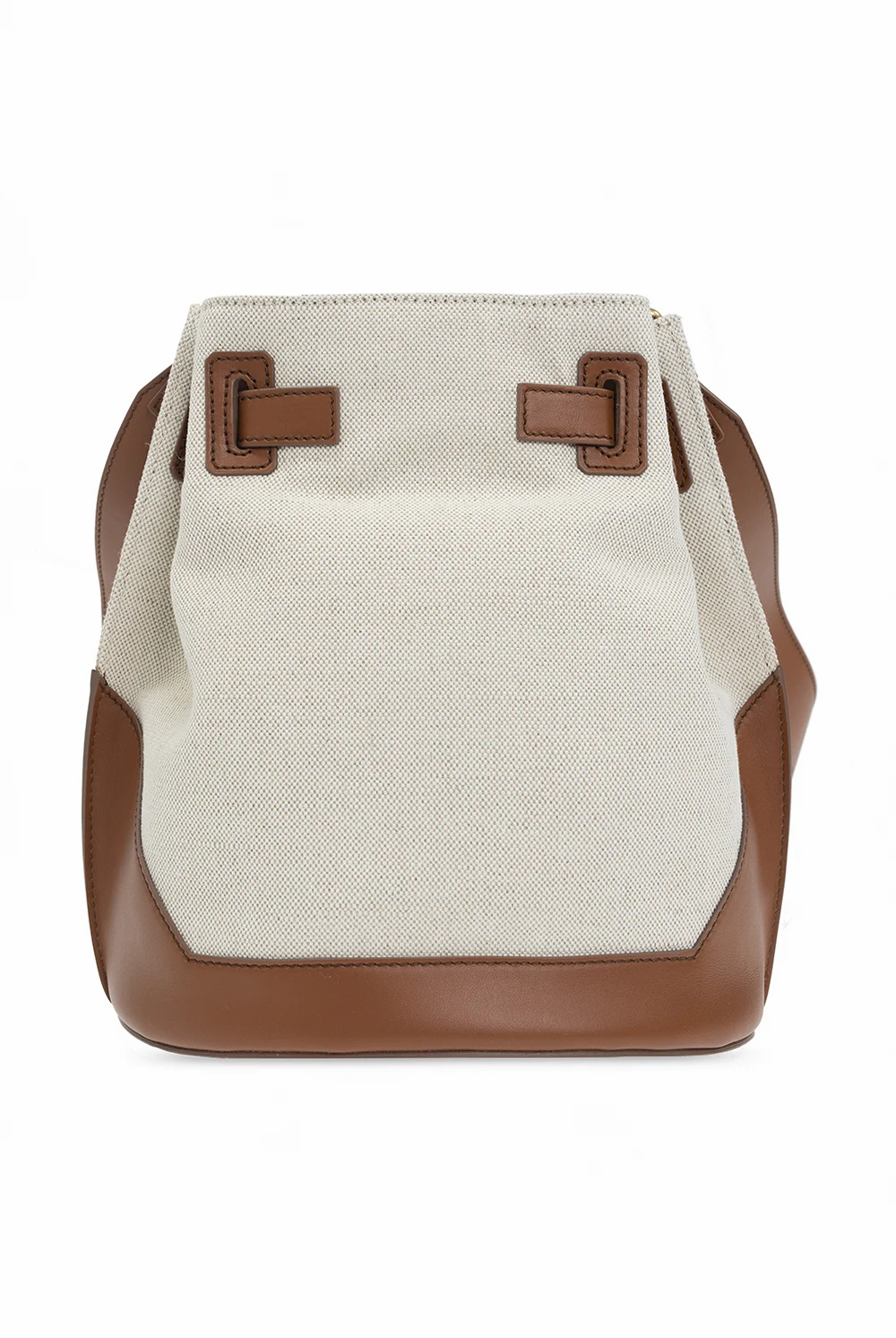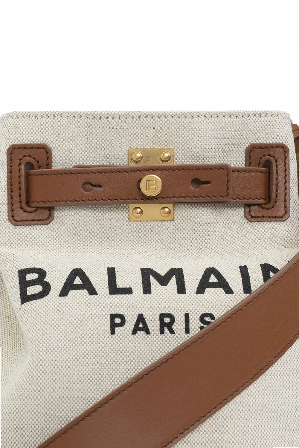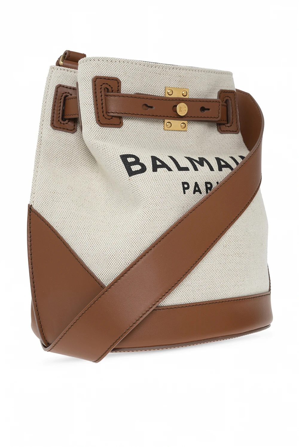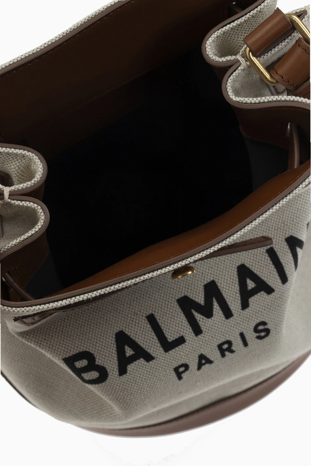 Beige and brown 'B-Army' bucket bag from Balmain. Crafted from canvas and trimmed with leather, this design cinches closed with a belt and features a black logo print on the front, a leather shoulder strap, gold-tone metal hardware and one internal compartment with one card slot and one zipped pocket.