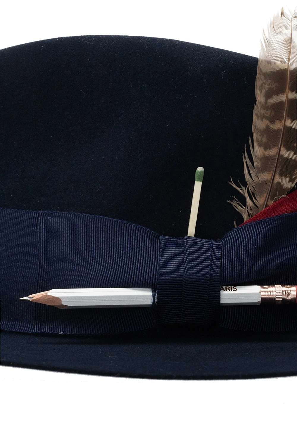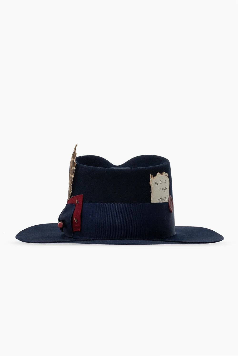 Navy ‘Rimbaud’ hat from Nick Fouquet. Crafted from felt, this item is decorated with a grosgrain band with a bow, a pencil, a turkey feather, the signature matchstick and a wax logo stamp.