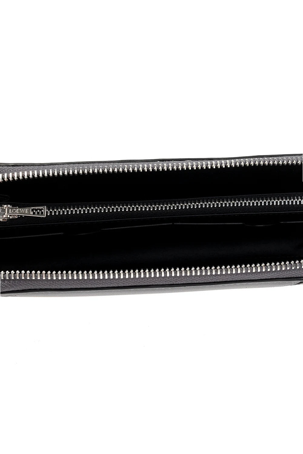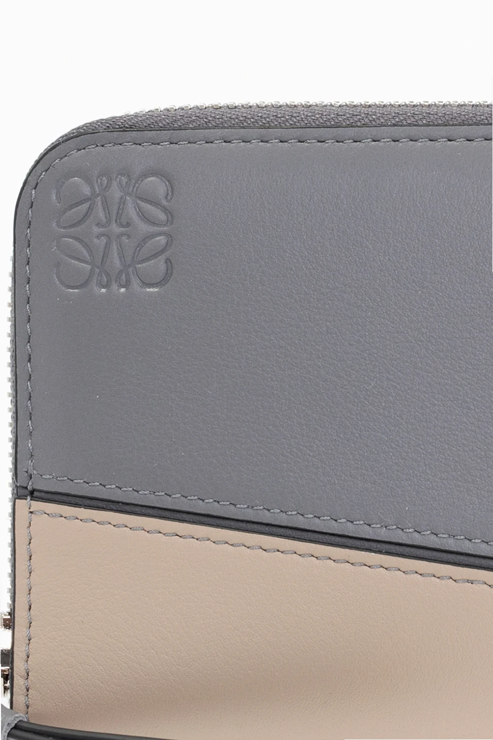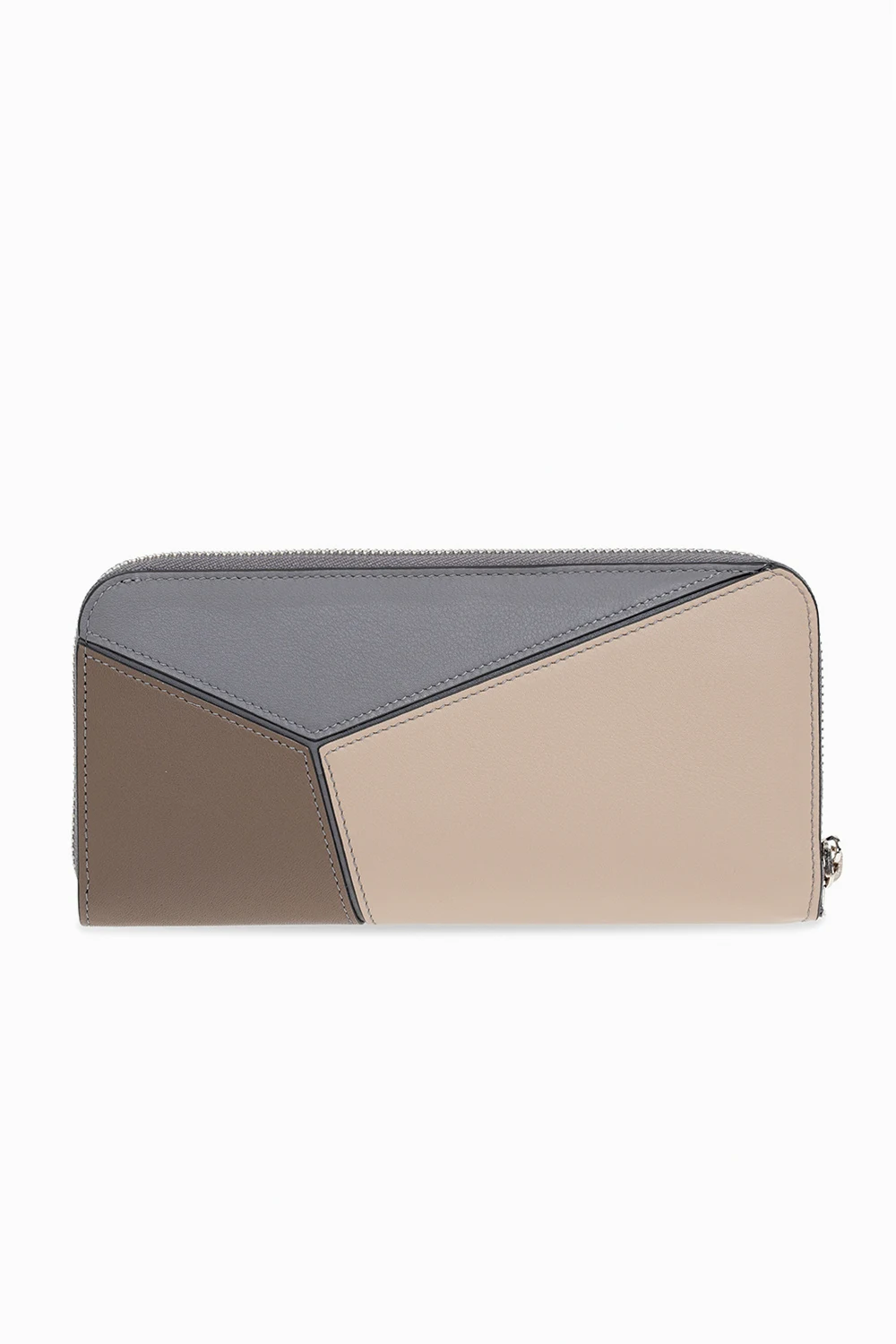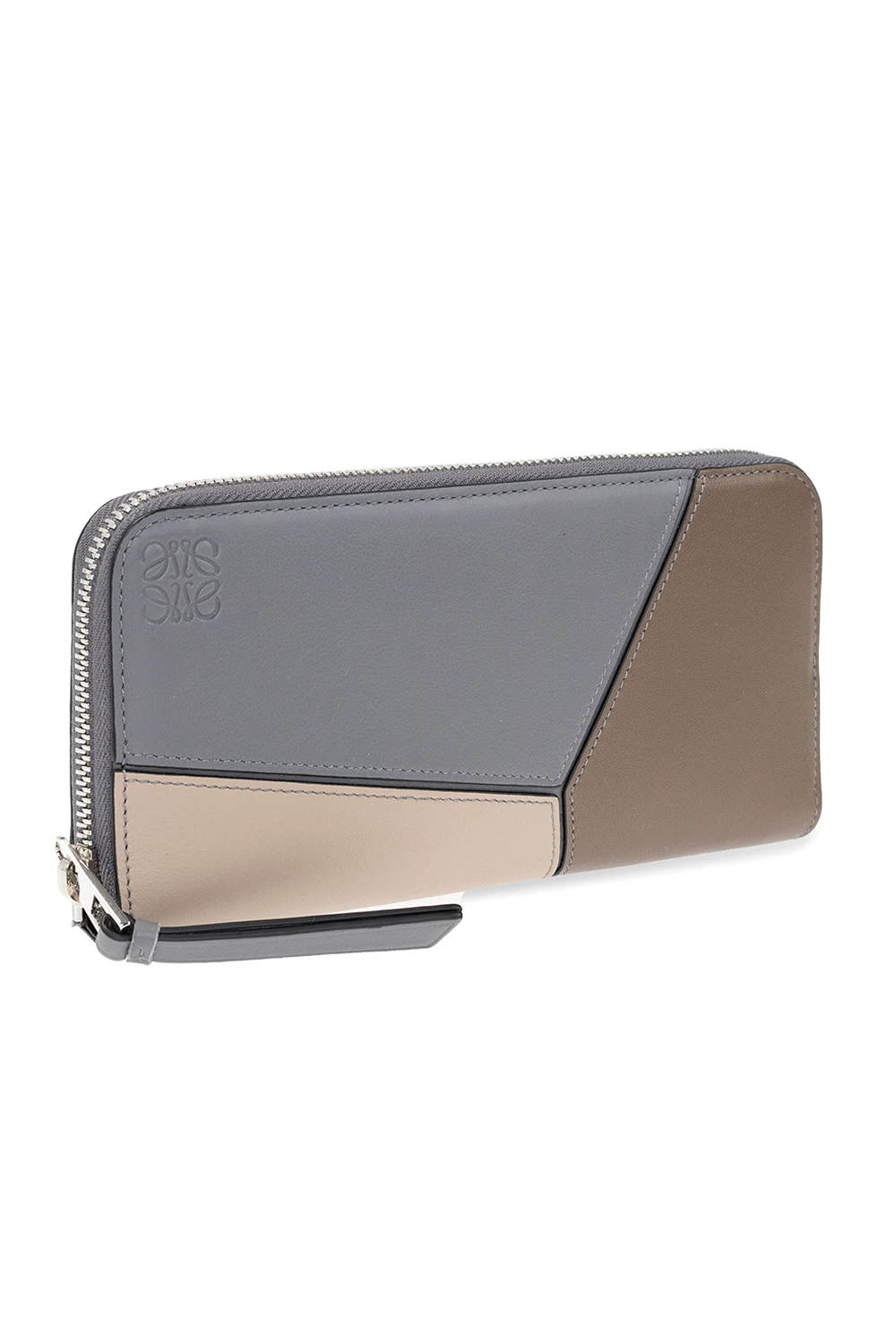 Brown, grey and beige ‘Puzzle’ wallet from Loewe. Crafted from calf leather, this item fastens via a zip and showcases an embossed Anagram, silver-tone metal hardware and an interior with one compartment, three slip pockets, eight card slots and one zip coins pocket.