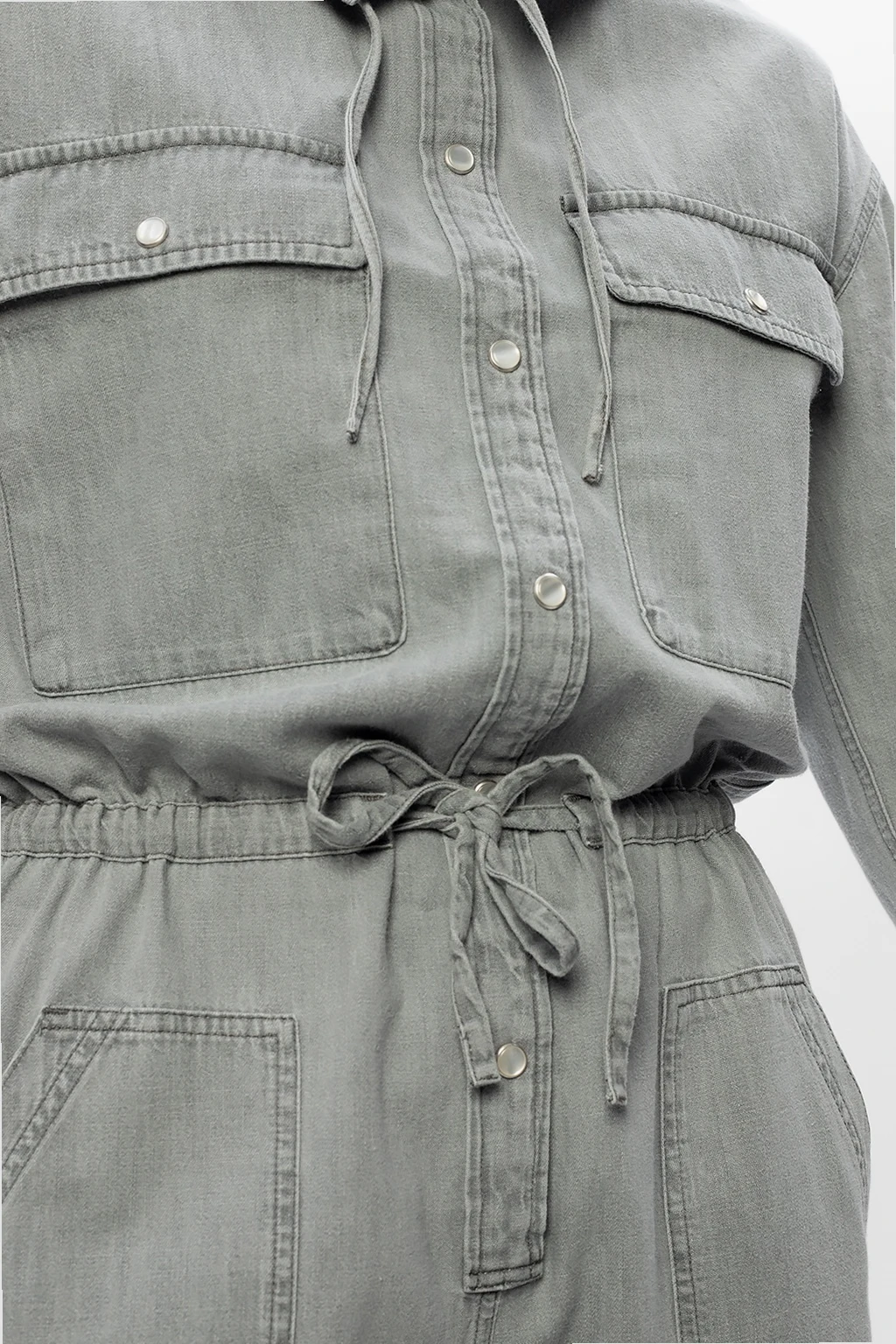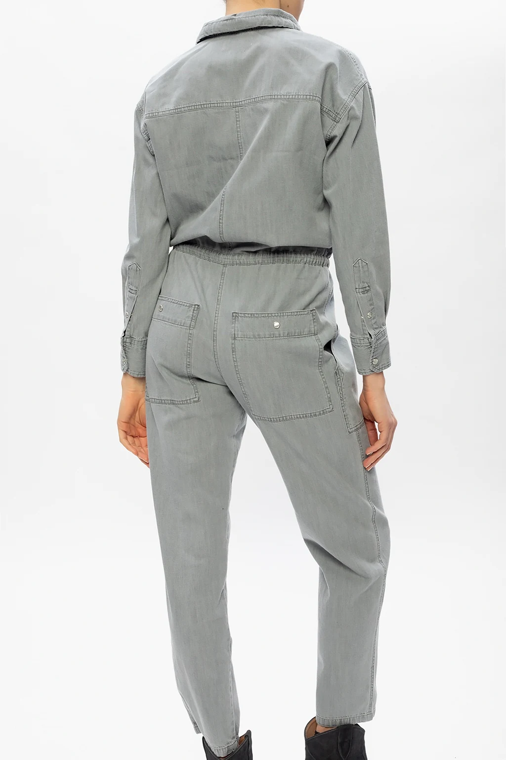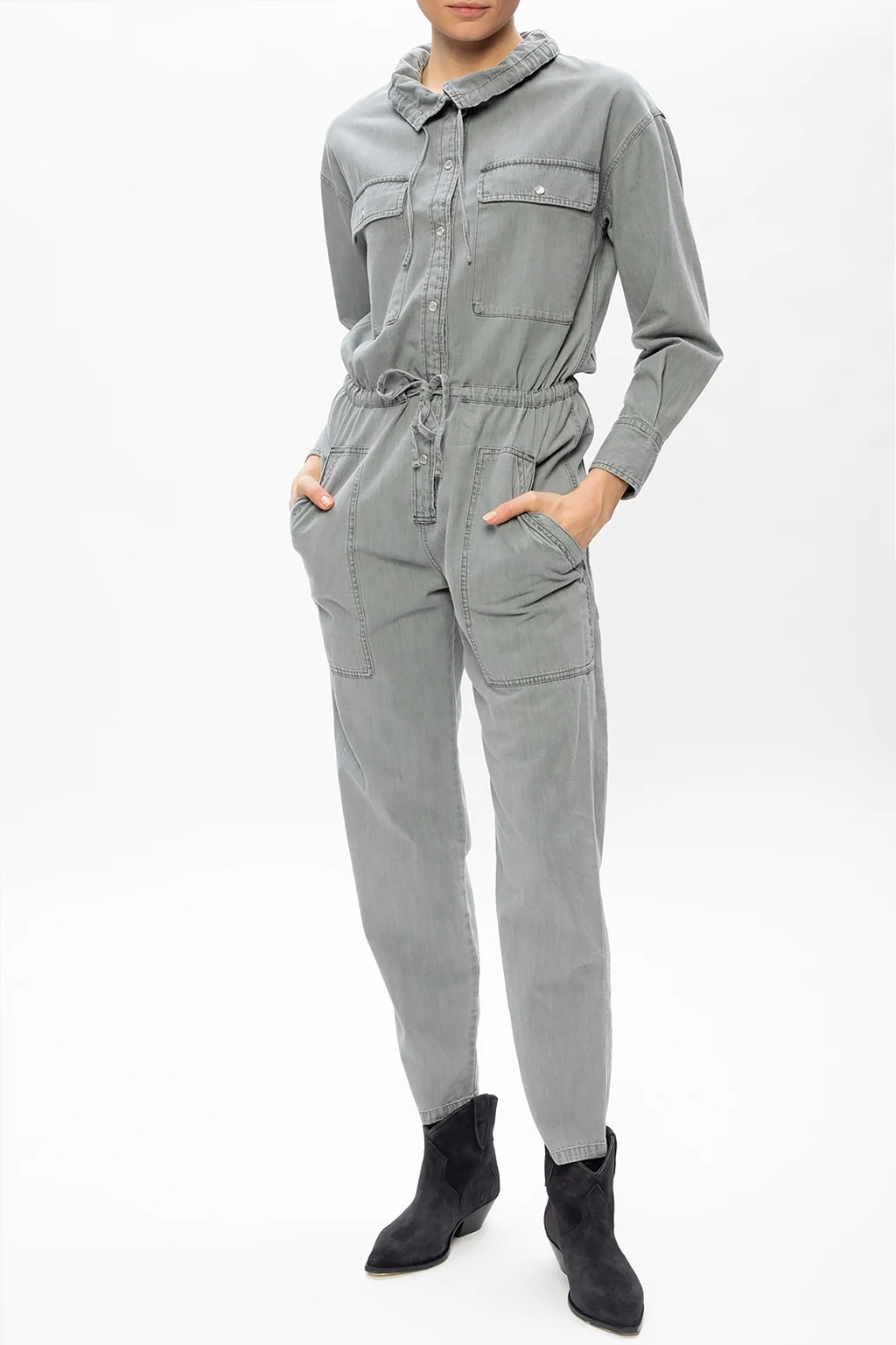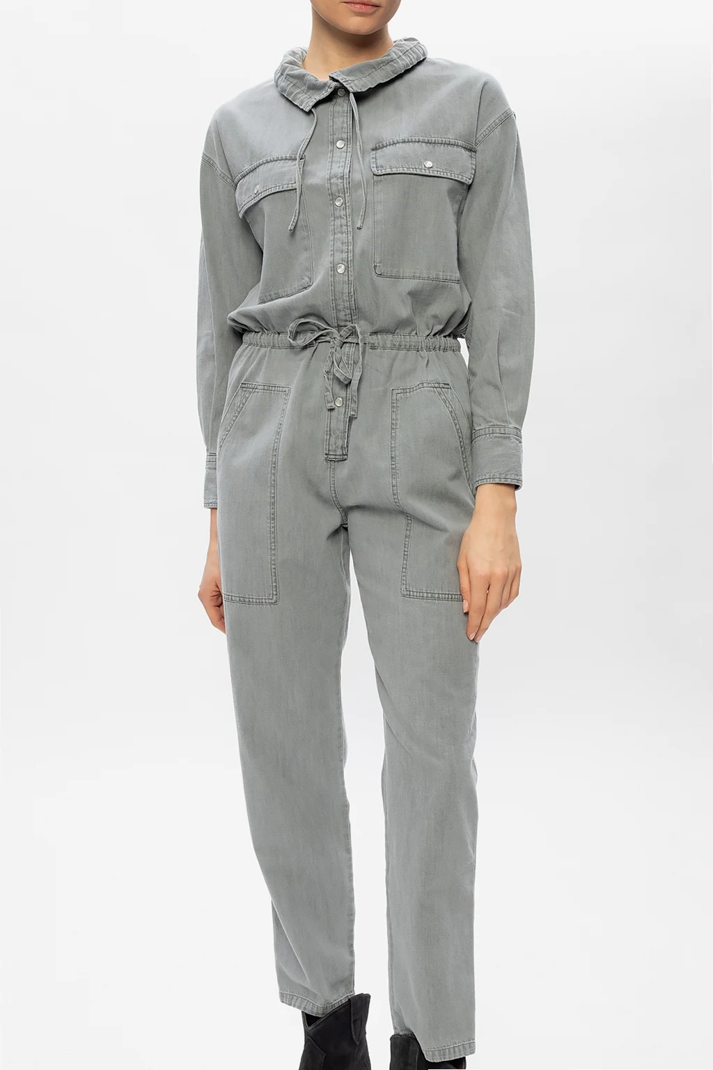 Grey denim jumpsuit from Isabel Marant Étoile. Designed with long sleeves and tapered legs, this item employs snap fastenings, cinching drawcords as well as two snap-fastened flapped pockets and two slip pockets on the front and two snap-fastened pockets on the back.